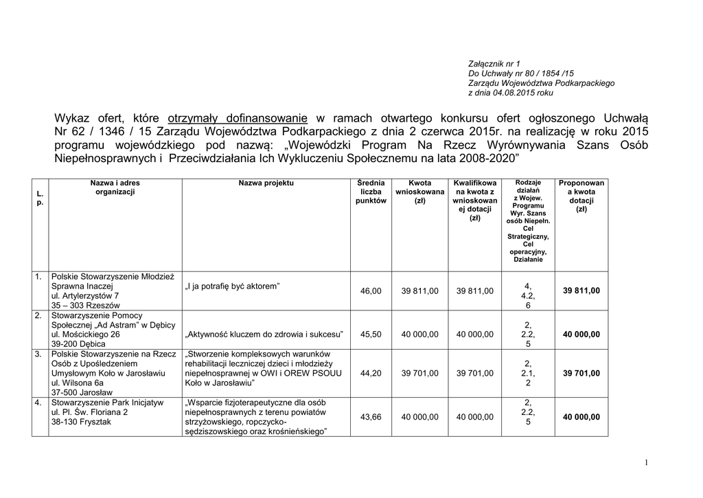 Załącznik nr 1 Do Uchwały nr 80 / 1854 /15 Zarządu Województwa Podkarpackiego z dnia 04.08.2015 roku Wykaz ofert, które otrzymały dofinansowanie w ramach otwartego konkursu ofert ogłoszonego Uchwałą Nr 62 / 1346 / 15 Zarządu Województwa Podkarpackiego z dnia 2 czerwca 2015r. na realizację w roku 2015 programu wojewódzkiego pod nazwą: „Wojewódzki Program Na Rzecz Wyrównywania Szans Osób Niepełnosprawnych i Przeciwdziałania Ich Wykluczeniu Społecznemu na lata 2008-2020” L. p. 1. 2. 3. 4. Nazwa i adres organizacji Polskie Stowarzyszenie Młodzież Sprawna Inaczej ul. Artylerzystów 7 35 – 303 Rzeszów Stowarzyszenie Pomocy Społecznej „Ad Astram” w Dębicy ul. Mościckiego 26 39-200 Dębica Polskie Stowarzyszenie na Rzecz Osób z Upośledzeniem Umysłowym Koło w Jarosławiu ul. Wilsona 6a 37-500 Jarosław Stowarzyszenie Park Inicjatyw ul. Pl. Św. Floriana 2 38-130 Frysztak Nazwa projektu „I ja potrafię być aktorem” „Aktywność kluczem do zdrowia i sukcesu” „Stworzenie kompleksowych warunków rehabilitacji leczniczej dzieci i młodzieży niepełnosprawnej w OWI i OREW PSOUU Koło w Jarosławiu” „Wsparcie fizjoterapeutyczne dla osób niepełnosprawnych z terenu powiatów strzyżowskiego, ropczyckosędziszowskiego oraz krośnieńskiego” Średnia liczba punktów Kwota wnioskowana (zł) Kwalifikowa na kwota z wnioskowan ej dotacji (zł) 46,00 39 811,00 39 811,00 45,50 40 000,00 40 000,00 2, 2.2, 5 40 000,00 44,20 39 701,00 39 701,00 2, 2.1, 2 39 701,00 43,66 40 000,00 40 000,00 Rodzaje działań z Wojew. Programu Wyr. Szans osób Niepełn. Cel Strategiczny, Cel operacyjny, Działanie 4, 4.2, 6 2, 2.2, 5 Proponowan a kwota dotacji (zł) 39 811,00 40 000,00 1 5. 6. 7. 8. 9. 10. 11. 12. 13. Stowarzyszenie Na Rzecz Osób Niepełnosprawnych Razem w Lubaczowie ul. Słowackiego 9a/4 37-600 Lubaczów Towarzystwo Przyjaciół Dzieci Oddział Okręgowy w Przemyślu ul. Pl. Dominikański 3, 37-700 Przemyśl Bieszczadzkie Stowarzyszenie Na Rzecz Dzieci i Młodzieży Niepełnosprawnej „Promyk Nadziei” w Ustrzykach Dolnych ul. Wyzwolenia 7 38-700 Ustrzyki Dolne Stowarzyszenie Przyjaciół Zakładu Opiekuńczo-Leczniczego „Radosna Jesień” w Przemyślu ul. Jasińskiego 15 37-700 Przemyśl Stowarzyszenie przy Zespole Szkół im. Aleksandra Fredry w Nozdrzcu Nozdrzec 227 36-245 Nozdrzec Stowarzyszenie Trampolina Kariery w Rzeszowie ul. Piłsudskiego 34 35-001 Rzeszów Związek Stowarzyszeń Pomocy Osobom Niepełnosprawnym Powiatu Rzeszowskiego 36-054 Mrowla 52 Stowarzyszenie Miłośników Cergowej 38-450 Dukla, Cergowa 157 Spółdzielnia Socjalna „Ogród Dokumentów” w Jarosławiu ul. Wilsona 6a/2 „Tacy sami jak my” „Wczesna interwencja szansą na lepsze jutro” – zajęcia indywidualne dla dzieci o zaburzonym rozwoju „Codzienna rehabilitacja dzieci i młodzieży niepełnosprawnej II” ””Rehabilitacja – Aktywność – Samodzielność” poprawa dostępu osób niepełnosprawnych do rehabilitacji leczniczej” „Nowe kwalifikacje szansą na rynku pracy” „Wiem więcej” „Zakup sprzętu rehabilitacyjnego” „Niepełnosprawni – sprawni w efektach i działaniu” „Szkolenia dla osób z niepełnosprawnością intelektualną z zakresu ogrodnictwa oraz produkcji świec”” 4, 4.2, 6 21 932,00 43,33 21 932,00 21 932,00 42,66 40 000,00 40 000,00 42,50 19 798,79 19 798,79 41,00 39 587,00 38 587,00 2, 2.1, 2 38 587,00 41,00 39 561,70 39 561,70 3, 3.2, 3 39 561,70 40,16 40 000,00 40 000,00 40,00 39 844,82 39 844,82 40,00 17 860,00 17 860,00 40,00 28 788,00 28 788,00 2, 2.2, 2 2, 2.2, 5 4, 4.2, 1 2, 2.2, 3 4, 4.2, 6 3, 3.2, 3 40 000,00 19 798,79 40 000,00 39 844,82 17 860,00 28 788,00 2 37-500 Jarosław 14. Stowarzyszenie RAZEM Budy Głogowskie 26 36-060 Głogów Małopolski 15. Stowarzyszenie dla Osób Autystycznych i Ze Spektrum Autyzmu „Ukryty Dar” w Dębicy ul. Tuwima 1/31 39-200 Dębica 16. Stowarzyszenie na Rzecz Dzieci z Dysfunkcjami Rozwojowymi „Bruno” w Rzeszowie ul. Lenartowicza 9 35-051 Rzeszów 17. Stowarzyszenie Nowa Perspektywa w Rzeszowie ul. 1000 - lecia 8/1 35-511 Rzeszów 18. Towarzystwo Pomocy im. Św. Brata Alberta Koło w Dębicy ul. Słoneczna 1 39-200 Dębica 19. Stowarzyszenie Na Rzecz Wspomagania Rozwoju Dzieci i Młodzieży TITUM w Rzeszowie ul. Kwiatkowskiego 48 a 35-311 Rzeszów 20. Stowarzyszenie KRIS Kreatywność, Rozwój, Innowacyjne Społeczeństwo w Rzeszowie ul. Naruszewicza 7/2 35-055 Rzeszów 21. Caritas Archidiecezji Przemyskiej ul. Kapitulna 1 37-700 Przemyśl 22. Stowarzyszenie Na Rzecz Dzieci z Nadpobudliwością Psychoruchową w Rzeszowie „Podejdź bliżej” 40,00 36 000,00 34 000,00 4, 4.2, 6 34 000,00 „Aktywni dla zdrowia” 36,80 40 000,00 40 000,00 2, 2.2, 5 36 000,00 „Rehabilitacja i wsparcie terapeutyczne dla dzieci z dysfunkcjami rozwojowymi” 36,60 40 000,00 40 000,00 2, 2.2, 5 36 000,00 „Całkiem sprawny niepełnosprawny” „Pomóż lepiej i godniej żyć” „Centrum terapii TITTUM” „Daj życiu szansę…….” 36,50 40 000,00 40 000,00 35,60 40 000,00 28 000,00 35,00 39 930,00 39 930,00 33,00 40 000,00 39 040,00 „Krok w Przyszłość” 31,60 35 140,00 35 140,00 „Wykorzystanie nowoczesnej metody Warnkego do pracy z dziećmi 30,20 28 786,07 26 732,00 4, 4.2, 1 2, 2.1, 2 2, 2.2, 5 3, 3.2, 3 3, 3.2, 3 2, 2.2, 2 36 000,00 25 200,00 35 937,00 31 232,00 28 112,00 21 385,60 3 ul. Dąbrowskiego 1/5 a 35-033 Rzeszów 23. Stowarzyszenie Pomocy Dzieciom i Młodzieży „Caritas” w Przemyślu ul. ks. Piotra Skargi 6 37-700 Przemyśl niepełnosprawnymi w tym z ADHD” „Przełamać bariery” 29,16 36 400,00 36 400,00 823 140,38 805 126,31 3, 3.2, 3 28 174,09 757 925,00 4