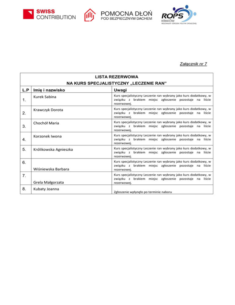 Załącznik nr 7 LISTA REZERWOWA NA KURS SPECJALISTYCZNY