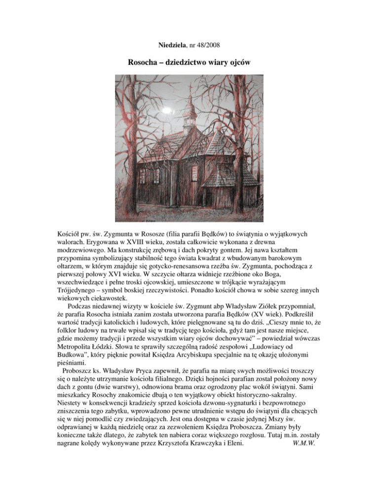 Niedziela, nr 48/2008 Rosocha – dziedzictwo wiary ojców Ko ciół pw. w. Zygmunta w Rososze (filia parafii B dków) to wi tynia o wyj tkowych walorach. Erygowana w XVIII wieku, została całkowicie wykonana z drewna modrzewiowego. Ma konstrukcj zr bow i dach pokryty gontem. Jej nawa kształtem przypomina symbolizuj cy stabilno tego wiata kwadrat z wbudowanym barokowym ołtarzem, w którym znajduje si gotycko-renesansowa rze ba w. Zygmunta, pochodz ca z pierwszej połowy XVI wieku. W szczycie ołtarza widnieje rze bione oko Boga, wszechwiedz ce i pełne troski ojcowskiej, umieszczone w trójk cie wyra aj cym Trójjedynego – symbol boskiej rzeczywisto ci. Ponadto ko ciół chowa w sobie szereg innych wiekowych ciekawostek. Podczas niedawnej wizyty w ko ciele w. Zygmunt abp Władysław Ziółek przypomniał, e parafia Rosocha istniała zanim została utworzona parafia B dków (XV wiek). Podkre lił warto tradycji katolickich i ludowych, które piel gnowane s tu do dzi . „Cieszy mnie to, e folklor ludowy na trwałe wpisał si w tradycj tego ko cioła, gdy tam jest nasze miejsce, gdzie mo emy tradycji i przede wszystkim wiary ojców dochowywa ” – powiedział wówczas Metropolita Łódzki. Słowa te sprawiły szczególn rado zespołowi „Ludowiacy od Budkowa”, który pi knie powitał Ksi dza Arcybiskupa specjalnie na t okazj uło onymi pie niami. Proboszcz ks. Władysław Pryca zapewnił, e parafia na miar swych mo liwo ci troszczy si o nale yte utrzymanie ko cioła filialnego. Dzi ki hojno ci parafian został poło ony nowy dach z gontu (dwie warstwy), odnowiona brama oraz ogrodzony plac wokół wi tyni. Sami mieszka cy Rosochy znakomicie dbaj o ten wyj tkowy obiekt historyczno-sakralny. Niestety w konsekwencji kradzie y sprzed ko cioła dzwonu-sygnaturki i bezpowrotnego zniszczenia tego zabytku, wprowadzono pewne utrudnienie wst pu do wi tyni dla chc cych si w niej pomodli czy zwiedzaj cych. Jest ona dost pna w czasie jedynej Mszy w. odprawianej w ka d niedziel oraz za zezwoleniem Ksi dza Proboszcza. Zmiany były konieczne tak e dlatego, e zabytek ten nabiera coraz wi kszego rozgłosu. Tutaj m.in. zostały nagrane kol dy wykonywane przez Krzysztofa Krawczyka i Eleni. W.M.W.