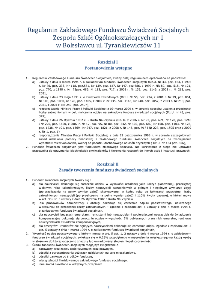 Regulamin Zakładowego Funduszu Świadczeń Socjalnych Zespołu Szkół Ogólnokształcących nr 1 w Bolesławcu ul. Tyrankiewiczów 11 Rozdział I Postanowienia wstępne 1. 2. Regulamin Zakładowego Funduszu Świadczeń Socjalnych, zwany dalej regulaminem opracowano na podstawie: a) ustawy z dnia 4 marca 1994 r. o zakładowym funduszu świadczeń socjalnych (Dz.U. Nr 43, poz. 163, z 1996 r. Nr 70, poz. 335, Nr 118, poz.561, Nr 139, poz. 647, Nr 147, poz.686, z 1997 r. NR 82, poz. 518, Nr 121, poz. 770, z 1998 r. Nr. 75poz. 486, Nr 113, poz. 717, z 2002 r. Nr 135, poz. 1146, z 2003 r., Nr 213, poz. 2081, b) ustawy z dnia 23 maja 1991 r. o związkach zawodowych (Dz.U. Nr 55, poz. 234, z 2001 r. Nr 79, poz. 854, Nr 100, poz. 1080, nr 128, poz. 1405, z 2002 r. nr 135, poz. 1146, Nr 240, poz. 2052, z 2003 r. Nr 213, poz. 2081, z 2004 r. NR 240, poz. 2407), c) rozporządzenia Ministra Pracy i Polityki Socjalnej z 09 marca 2009 r. w sprawie sposobu ustalenia przeciętnej liczby zatrudnionych w celu naliczania odpisu na zakładowy fundusz świadczeń socjalnych (Dz.U. nr 43, poz. 349), d) ustawy z dnia 26 stycznia 1982 r. – Karta Nauczyciela (Dz. U. z 2006 r. Nr 97, poz. 674, Nr 170, poz. 1218 i Nr 220, poz. 1600, z 2007 r. Nr 17, poz. 95, Nr 80, poz. 542, Nr 102, poz. 689, Nr 158, poz. 1103, Nr 176, poz. 1238, Nr 191, poz. 1369 i Nr 247, poz. 1821, z 2008 r. Nr 145, poz. 917 i Nr 227, poz. 1505 oraz z 2009 r. Nr 1, poz. 1) e) rozporządzenia Ministra Pracy i Polityki Socjalnej z dnia 22 października 1998 r. w sprawie szczegółowych zasad udzielania pomocy finansowej z zakładowego funduszu świadczeń socjalnych na zmniejszenie wydatków mieszkaniowych, wolnej od podatku dochodowego od osób fizycznych ( Dz.U. Nr 134 poz. 876), Fundusz świadczeń socjalnych jest funduszem zbiorowego spoŜycia. Nie korzystanie z niego nie uprawnia pracownika do otrzymania jakichkolwiek ekwiwalentów i kierowania roszczeń do innych osób i instytucji prawnych. Rozdział II Zasady tworzenia funduszu świadczeń socjalnych 1. 2. 3. Fundusz świadczeń socjalnych tworzy się : a) dla nauczycieli dokonuje się corocznie odpisu w wysokości ustalonej jako iloczyn planowanej, przeciętnej w danym roku kalendarzowym, liczby nauczycieli zatrudnionych w pełnym i niepełnym wymiarze zajęć (po przeliczeniu na pełny wymiar zajęć) skorygowanej w końcu roku do faktycznej przeciętnej liczby zatrudnionych nauczycieli (po przeliczeniu na pełny wymiar zajęć) i 110% kwoty bazowej, o której mowa w art. 30 ust. 3 ustawy z dnia 26 stycznia 1982 r. Karta Nauczyciela. b) dla pracowników administracji i obsługi dokonuje się corocznie odpisu podstawowego, naliczanego w stosunku do przeciętnej liczby zatrudnionych – zgodnie z zapisami art. 5 ustawy z dnia 4 marca 1994 r. o zakładowym funduszu świadczeń socjalnych. c) dla nauczycieli będących emerytami, rencistami lub nauczycielami pobierającymi nauczycielskie świadczenia kompensacyjne dokonuje się corocznie odpisu w wysokości 5% pobieranych przez nich emerytur, rent oraz nauczycielskich świadczeń kompensacyjnych, d) dla emerytów i rencistów nie będących nauczycielami dokonuje się corocznie odpisu zgodnie z zapisami art. 5 ust. 5 ustawy z dnia 4 marca 1994 r. o zakładowym funduszu świadczeń socjalnych, Wysokość odpisu podstawowego o którym mowa w art. 5 ust. 1, 2 ustawy z dnia 4 marca 1994 r. o zakładowym funduszu świadczeń socjalnych, zwiększa się o 6,25% przeciętnego wynagrodzenia miesięcznego na kaŜdą osobę w stosunku do której orzeczono znaczny lub umiarkowany stopień niepełnosprawności. Środki funduszu świadczeń socjalnych mogą być zwiększone o: a) darowizny oraz zapisy osób fizycznych oraz prawnych, b) odsetki z oprocentowania poŜyczek udzielanych na cele mieszkaniowe, c) odsetki bankowe od środków funduszu, d) wierzytelności likwidowanego zakładowego funduszu socjalnego, e) inne środki określone w odrębnych przepisach. 1 Rozdział III Uprawnieni do korzystania z funduszu świadczeń socjalnych 1. 2. Uprawnionymi do korzystania z Funduszu są: a) pracownicy i ich rodziny, b) emeryci i renciści. Pod podanym w ust. 1 pojęciem „ich rodziny” naleŜy rozumieć: a) dzieci (do czasu pobierania nauki, nie dłuŜej jak do 25 roku Ŝycia po przedstawieniu odpowiednich zaświadczeń ze szkoły, uczelni itp.) własne, dzieci małŜonka, dzieci przysposobione lub przyjęte na wychowanie w ramach rodziny zastępczej, Rozdział IV Przeznaczenie Funduszu Świadczeń Socjalnych 1. 2. 3. 4. 5. Środki Funduszu są przeznaczone na: a) dofinansowanie zorganizowanego urlopu wypoczynku pracowniczego, b) dofinansowanie zorganizowanego wypoczynku dzieci i młodzieŜy, c) dofinansowanie wypoczynku organizowanego we własnym zakresie, d) bezzwrotne zapomogi pienięŜne udzielane w wypadkach losowych, e) świadczenia rzeczowe przyznawane osobom znajdującym się w szczególnie cięŜkiej sytuacji Ŝyciowej, f) działalność kulturalno – oświatową, sportowo – rekreacyjną, turystyczną. g) świadczenia realizowane w postaci bonów towarowych, paczek, talonów itp. h) poŜyczki zwrotne na cele mieszkaniowe, i) pomoc finansową na zmniejszenie wydatków mieszkaniowych – na podstawie Rozporządzenia Ministra Pracy i Polityki Socjalnej z dnia 22 października 1998 r. j) świadczenia urlopowe dla nauczycieli – na podstawie art.53.1.a ustawy z dnia 26.01.1982r. – Karta Nauczyciela Wnioski o: a) dofinansowanie wypoczynku letniego naleŜy składać w terminie: do 31 maja kaŜdego roku b) świadczenie realizowane w formie bonów towarowych, paczek, talonów naleŜy składać w terminie: do 15 listopada każdego roku. Działalność kulturalno – oświatowa, sportowo-rekreacyjna i turystyczna obejmuje: a) dofinansowanie do zakupionych przez pracodawcę biletów na imprezy kulturalno – oświatowe lub sportowo rekreacyjne, b) dofinansowanie do innej organizowanej przez zakład pracy działalności kulturalno – oświatowej, sp