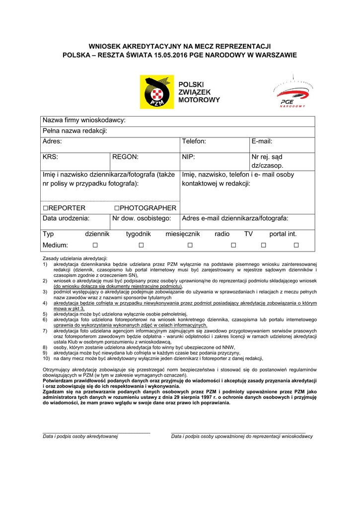 WNIOSEK AKREDYTACYJNY NA MECZ REPREZENTACJI POLSKA – RESZTA ŚWIATA 15.05.2016 PGE NARODOWY W WARSZAWIE Nazwa firmy wnioskodawcy: Pełna nazwa redakcji: Adres: Telefon: KRS: REGON: □REPORTER □PHOTOGRAPHER Data urodzenia: Nr dow. osobistego: Medium: dziennik □ tygodnik □ Nr rej. sąd dz/czasop. Imię, nazwisko, telefon i e- mail osoby kontaktowej w redakcji: NIP: Imię i nazwisko dziennikarza/fotografa (także nr polisy w przypadku fotografa): Typ E-mail: Adres e-mail dziennikarza/fotografa: miesięcznik □ radio TV □ portal int. □ □ Zasady udzielania akredytacji: 1) akredytacja dziennikarska będzie udzielana przez PZM wyłącznie na podstawie pisemnego wniosku zainteresowanej redakcji (dziennik, czasopismo lub portal internetowy musi być zarejestrowany w rejestrze sądowym dzienników i czasopism zgodnie z orzeczeniem SN), 2) wniosek o akredytację musi być podpisany przez osobę/y uprawnioną/ne do reprezentacji podmiotu składającego wniosek (do wniosku dołącza się dokumenty rejestracyjne podmiotu), 3) podmiot występujący o akredytację podejmuje zobowiązanie do używania w sprawozdaniach i relacjach z meczu pełnych nazw zawodów wraz z nazwami sponsorów tytularnych 4) akredytacja będzie cofnięta w przypadku niewykonywania przez podmiot posiadający akredytację zobowiązania o którym mowa w pkt 3, 5) akredytacja może być udzielona wyłącznie osobie pełnoletniej, 6) akredytacja foto udzielona fotoreporterowi na wniosek konkretnego dziennika, czasopisma lub portalu internetowego uprawnia do wykorzystania wykonanych zdjęć w celach informacyjnych, 7) akredytacja foto udzielana agencjom informacyjnym zajmującym się zawodowo przygotowywaniem serwisów prasowych oraz fotoreporterom zawodowym będzie odpłatna - warunki odpłatności i zakres licencji w ramach udzielonej akredytacji ustala Klub w osobnym porozumieniu z wnioskodawcą, 8) osoby, którym zostanie udzielona akredytacja foto winny być ubezpieczone od NNW, 9) akredytacja może być niewydana lub cofnięta w każdym czasie bez podania przyczyny, 10) na dany mecz może być akredytowany wyłącznie jeden dziennikarz i fotoreporter z danej redakcji, Otrzymujący akredytację zobowiązuje się przestrzegać norm bezpieczeństwa i stosować się do postanowień regulaminów obowiązujących w PZM (w tym w zakresie wymaganych oznaczeń). Potwierdzam prawidłowość podanych danych oraz przyjmuję do wiadomości i akceptuję zasady przyznania akredytacji i oraz zobowiązuję się do ich respektowania i wykonywania. Zgadzam się na przetwarzanie podanych danych osobowych przez PZM i podmioty upoważnione przez PZM jako administratora tych danych w rozumieniu ustawy z dnia 29 sierpnia 1997 r. o ochronie danych osobowych i przyjmuję do wiadomości, że mam prawo wglądu w swoje dane oraz prawo ich poprawiania. ________________________________________ Data i podpis osoby akredytowanej __________________________________________________ Data i podpis osoby upoważnionej do reprezentacji wnioskodawcy