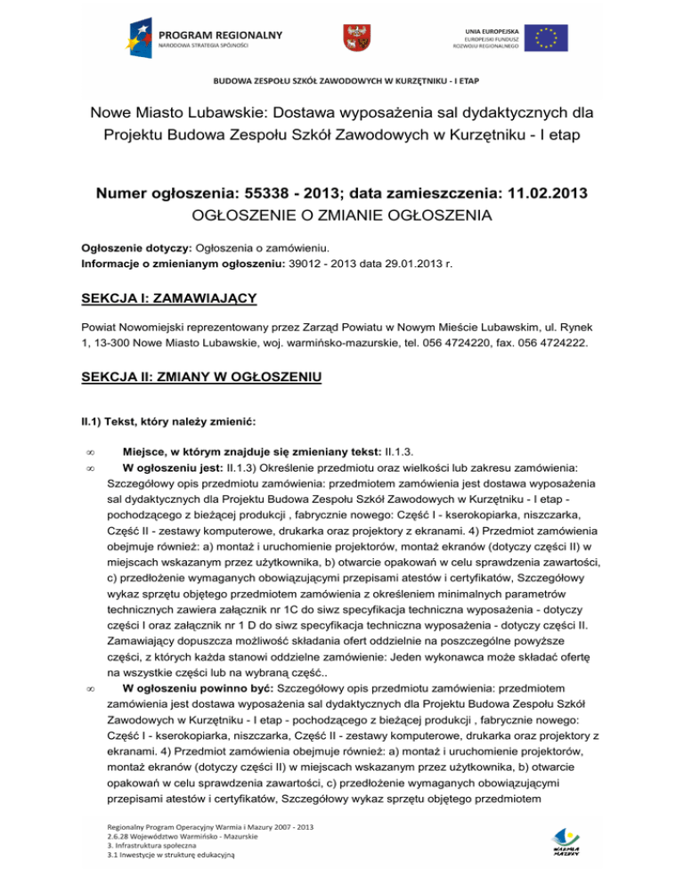 Nowe Miasto Lubawskie: Dostawa wyposażenia sal dydaktycznych dla Projektu Budowa Zespołu Szkół Zawodowych w Kurzętniku - I etap Numer ogłoszenia: 55338 - 2013; data zamieszczenia: 11.02.2013 OGŁOSZENIE O ZMIANIE OGŁOSZENIA Ogłoszenie dotyczy: Ogłoszenia o zamówieniu. Informacje o zmienianym ogłoszeniu: 39012 - 2013 data 29.01.2013 r. SEKCJA I: ZAMAWIAJĄCY Powiat Nowomiejski reprezentowany przez Zarząd Powiatu w Nowym Mieście Lubawskim, ul. Rynek 1, 13-300 Nowe Miasto Lubawskie, woj. warmińsko-mazurskie, tel. 056 4724220, fax. 056 4724222. SEKCJA II: ZMIANY W OGŁOSZENIU II.1) Tekst, który należy zmienić: • • Miejsce, w którym znajduje się zmieniany tekst: II.1.3. W ogłoszeniu jest: II.1.3) Określenie przedmiotu oraz wielkości lub zakresu zamówienia: Szczegółowy opis przedmiotu zamówienia: przedmiotem zamówienia jest dostawa wyposażenia sal dydaktycznych dla Projektu Budowa Zespołu Szkół Zawodowych w Kurzętniku - I etap pochodzącego z bieżącej produkcji , fabrycznie nowego: Część I - kserokopiarka, niszczarka, Część II - zestawy komputerowe, drukarka oraz projektory z ekranami. 4) Przedmiot zamówienia obejmuje również: a) montaż i uruchomienie projektorów, montaż ekranów (dotyczy części II) w miejscach wskazanym przez użytkownika, b) otwarcie opakowań w celu sprawdzenia zawartości, c) przedłożenie wymaganych obowiązującymi przepisami atestów i certyfikatów, Szczegółowy wykaz sprzętu objętego przedmiotem zamówienia z określeniem minimalnych parametrów technicznych zawiera załącznik nr 1C do siwz specyfikacja techniczna wyposażenia - dotyczy części I oraz załącznik nr 1 D do siwz specyfikacja techniczna wyposażenia - dotyczy części II. Zamawiający dopuszcza możliwość składania ofert oddzielnie na poszczególne powyższe części, z których każda stanowi oddzielne zamówienie: Jeden wykonawca może składać ofertę • na wszystkie części lub na wybraną część.. W ogłoszeniu powinno być: Szczegółowy opis przedmiotu zamówienia: przedmiotem zamówienia jest dostawa wyposażenia sal dydaktycznych dla Projektu Budowa Zespołu Szkół Zawodowych w Kurzętniku - I etap - pochodzącego z bieżącej produkcji , fabrycznie nowego: Część I - kserokopiarka, niszczarka, Część II - zestawy komputerowe, drukarka oraz projektory z ekranami. 4) Przedmiot zamówienia obejmuje również: a) montaż i uruchomienie projektorów, montaż ekranów (dotyczy części II) w miejscach wskazanym przez użytkownika, b) otwarcie opakowań w celu sprawdzenia zawartości, c) przedłożenie wymaganych obowiązującymi przepisami atestów i certyfikatów, Szczegółowy wykaz sprzętu objętego przedmiotem zamówienia z określeniem minimalnych parametrów technicznych zawiera zmieniony załącznik nr 1C do siwz specyfikacja techniczna wyposażenia - dotyczy części I oraz załącznik nr 1 D do siwz specyfikacja techniczna wyposażenia - dotyczy części II. Zamawiający dopuszcza możliwość składania ofert oddzielnie na poszczególne powyższe części, z których każda stanowi oddzielne zamówienie: Jeden wykonawca może składać ofertę na wszystkie części lub na wybraną część..