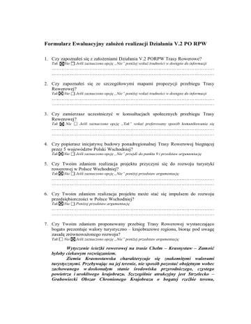Formularz Ewaluacyjny załoŜeń realizacji Działania V.2 PO RPW 1. Czy zapoznałeś się z załoŜeniami Działania V.2 PORPW Trasy Rowerowe? Tak Nie Jeśli zaznaczono opcję „Nie” poniŜej wskaŜ trudności w dostępie do informacji ……………………………………………………………………………………… ……………………………………………………………………………………… 2. Czy zapoznałeś się ze szczegółowymi mapami propozycji przebiegu Trasy Rowerowej? Tak Nie Jeśli zaznaczono opcję „Nie” poniŜej wskaŜ trudności w dostępie do informacji ……………………………………………………………………………………… ……………………………………………………………………………………… 3. Czy zamierzasz uczestniczyć w konsultacjach społecznych przebiegu Trasy Rowerowej? Tak Nie Jeśli zaznaczono opcję „Tak” wskaŜ preferowany sposób komunikowania się ……………………………………………………………………………………… ……………………………………………………………………………………… 4. Czy popierasz inicjatywę budowy ponadregionalnej Trasy Rowerowej biegnącej przez 5 województw Polski Wschodniej? Tak Nie Jeśli zaznaczono opcję „Nie” przejdź do punktu 9 i przedstaw argumentację 5. Czy Twoim zdaniem realizacja projektu przyczyni się do rozwoju turystyki rowerowej w Polsce Wschodniej? Tak Nie Jeśli zaznaczono opcję „Nie” poniŜej przedstaw argumentację ……………………………………………………………………………………… ……………………………………………………………………………………… 6. Czy Twoim zdaniem realizacja projektu moŜe stać się impulsem do rozwoju przedsiębiorczości w Polsce Wschodniej? Tak Nie PoniŜej przedstaw argumentację ……………………………………………………………………………………… ……………………………………………………………………………………… 7. Czy Twoim zdaniem proponowany przebieg Trasy Rowerowej wystarczająco bogato prezentuje walory turystyczno – krajobrazowe regionu, biorąc pod uwagę zasadę zrównowaŜonego rozwoju? Tak Nie Jeśli zaznaczono opcję „Nie” poniŜej przedstaw argumentację Wytyczenie ścieŜki rowerowej na trasie Chełm – Krasnystaw – Zamość byłoby ciekawym rozwiązaniem. Ziemia Krasnostawska charakteryzuje się znakomitymi walorami turystycznymi. Przebywając na jej terenie, nie sposób pozostać obojętnym wobec zachowanego w doskonałym stanie środowiska przyrodniczego, czystego powietrza i urokliwego krajobrazu. Szczególnie atrakcyjny jest Strzelecko – Grabowiecki Obszar Chronionego Krajobrazu o bogatej rzeźbie terenu, z okazami rzadkiej roślinności. W jego granicach znajduje się Stado Ogierów w Białce. Naturalne walory ziemi krasnostawskiej wzbogacają kompleksy wodne w Tuligłowach i Wincentowie oraz rzeka Wieprz, stwarzające doskonałe warunki do uprawiania turystyki rowerowej. Krasnystaw jest bardzo atrakcyjnym miastem, a o jego świetności i bogatej przeszłości świadczą zabytki architektoniczne. Przede wszystkim na uwagę zasługuje urbanistyczny układ miasta, którego trzon stanowi duŜy czworokątny rynek (Plac 3 Maja) z wybiegającymi z naroŜy ulicami i systemem innych ulic, tworzących układ szachownicowy. Godnym uwagi jest Zespół pojezuicki, który stanowi najbardziej charakterystyczny akcent panoramy miasta i jest najcenniejszym obiektem zabytkowym. Pochodzi z przełomu XVII i XVIII wieku. W skład zespołu wchodzą: kościół pw. Św. Franciszka Ksawerego wybudowany w latach 1695-1723, pałacyk biskupi, wikariat, seminarium oraz kolegium w którym obecnie mieści się Muzeum Regionalne. Zespół poaugustiański jest drugim co do wartości, lecz najstarszym obiektem zabytkowym. Składa się on z dawnego, przekształconego budynku kościelnego oraz byłego klasztoru Augustianów. Przy tym kościół stanowi najstarszy zabytek na terenie miasta (przełom XV i XVI w.). Ponadto w okolicach Krasnegostawu zachowało się wiele zespołów zabytków architektonicznych. Wśród nich są między innymi: kompleks parkowo-dworski ze stawami w Krupem, dwory szlacheckie oraz stare kościoły parafialne. 8. Czy satysfakcjonuje Cię proponowany przebieg Trasy Rowerowej, jako mieszkańca regionu/rowerzystę/samorządowca/……………………………….*? Tak Nie 8 a) Jeśli nie satysfakcjonuje Cię proponowany przebieg przedstaw swą argumentację, wykorzystując szczegółowe mapy załączone w oddzielnym pliku do niniejszego formularza. W opisie odnoś się do konkretnych wycinków, co pozwoli wyselekcjonować odcinki trasy, co do których brak zastrzeŜeń. Nie jesteśmy usatysfakcjonowani proponowanym przebiegiem trasy rowerowej na odcinku Chełm – Zamość, która przebiega przez Sielec, Wojsławice, Grabowiec. Tereny z mało atrakcyjnymi zabytkami (wyjątek Wojsławice). Proponujemy przywrócenie pierwotnego przebiegu szlaku, prezentowanego przez Ministerstwo Rozwoju Regionalnego w maju 2007 r. Proponowana wówczas trasa przebiegała przez Krasnystaw podkreślając walory krajobrazowe i zabytkowe miasta. Trasa szlaku, podobnie jak w wersji przez Wojsławice takŜe wejdzie w tereny Skierbieszowskiego Parku Krajobrazowego, a ponadto równieŜ w Obszar Natura 2000 zwany Izbickim Przełomem Wieprza. 8 b) Jeśli masz propozycję alternatywną przedstaw argumentację i opis nowego rozwiązania. PoniŜej opisz alternatywny przebiegu Trasy Rowerowej. Jeśli w ramach propozycji podjęto próby uzgodnień z potencjalnymi partnerami, opisz jakie ustalenia względem wspólnych działań zapadły. Alternatywna trasa poprowadzona przez Krasnystaw daje większe moŜliwości zwiedzania atrakcyjnych miejsc. Krasnystaw jest miastem z ponad 600-letnią tradycj