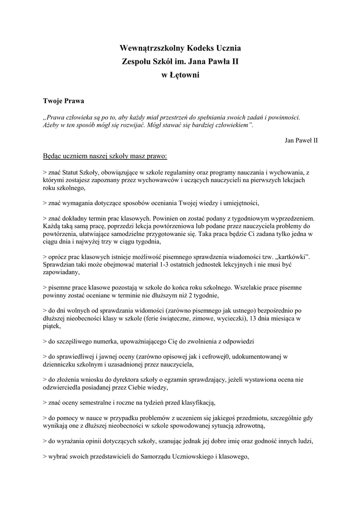 Wewnątrzszkolny Kodeks Ucznia Zespołu Szkół im. Jana Pawła II w Łętowni Twoje Prawa „Prawa człowieka są po to, aby każdy miał przestrzeń do spełniania swoich zadań i powinności. Ażeby w ten sposób mógł się rozwijać. Mógł stawać się bardziej człowiekiem”. Jan Paweł II Będąc uczniem naszej szkoły masz prawo: > znać Statut Szkoły, obowiązujące w szkole regulaminy oraz programy nauczania i wychowania, z którymi zostajesz zapoznany przez wychowawców i uczących nauczycieli na pierwszych lekcjach roku szkolnego, > znać wymagania dotyczące sposobów oceniania Twojej wiedzy i umiejętności, > znać dokładny termin prac klasowych. Powinien on zostać podany z tygodniowym wyprzedzeniem. Każdą taką samą pracę, poprzedzi lekcja powtórzeniowa lub podane przez nauczyciela problemy do powtórzenia, ułatwiające samodzielne przygotowanie się. Taka praca będzie Ci zadana tylko jedna w ciągu dnia i najwyżej trzy w ciągu tygodnia, > oprócz prac klasowych istnieje możliwość pisemnego sprawdzenia wiadomości tzw. „kartkówki”. Sprawdzian taki może obejmować materiał 1-3 ostatnich jednostek lekcyjnych i nie musi być zapowiadany, > pisemne prace klasowe pozostają w szkole do końca roku szkolnego. Wszelakie prace pisemne powinny zostać oceniane w terminie nie dłuższym niż 2 tygodnie, > do dni wolnych od sprawdzania widomości (zarówno pisemnego jak ustnego) bezpośrednio po dłuższej nieobecności klasy w szkole (ferie świąteczne, zimowe, wycieczki), 13 dnia miesiąca w piątek, > do szczęśliwego numerka, upoważniającego Cię do zwolnienia z odpowiedzi > do sprawiedliwej i jawnej oceny (zarówno opisowej jak i cefrowej0, udokumentowanej w dzienniczku szkolnym i uzasadnionej przez nauczyciela, > do złożenia wniosku do dyrektora szkoły o egzamin sprawdzający, jeżeli wystawiona ocena nie odzwierciedla posiadanej przez Ciebie wiedzy, > znać oceny semestralne i roczne na tydzień przed klasyfikacją, > do pomocy w nauce w przypadku problemów z uczeniem się jakiegoś przedmiotu, szczególnie gdy wynikają one z dłuższej nieobecności w szkole spowodowanej sytuacją zdrowotną, > do wyrażania opinii dotyczących szkoły, szanując jednak jej dobre imię oraz godność innych ludzi, > wybrać swoich przedstawicieli do Samorządu Uczniowskiego i klasowego, > do korzystania z wszelkich zajęć pozalekcyjnych wg. dokonanego wyboru > do poszanowania Twojej godności osobistej i pełnej tolerancji bez względu na Twoje osiągane wyniki nauczania, > do uczestniczenia w wycieczkach, przedstawieniach teatralnych, seansach filmowych i innych imprezach organizowanych w szkole, > do pełnej informacji ze strony nauczyciela w zakresie kwestii, których nie rozumiesz, > do korzystania z biblioteki, sali gimnastycznej. Twoje Obowiązki „Musicie od Siebie wymagać, nawet gdyby inni od Was nie wymagali” Jan Paweł II Nasza Szkoła wymaga od Ciebie: W zakresie obowiązków szkolnych: > dbaj o dobre imię Szkoły, wzbogacaj tradycję szkolną i szanuj symbole szkoły, > po przyjściu do szkoły jesteś zobowiązany do przebrania się w szatni, zmiany obuwia, > regularnie i punktualnie uczęszczaj na lekcje , a każdorazową nieobecność spowodowaną chorobą czy inną ważną przyczyną usprawiedliwiaj u wychowawcy klasy. Każda twoja nieobecność na zajęciach winna być usprawiedliwiona przez Twoich rodziców lub opiekunów (na piśmie), najpóźniej tydzień po absencji. > podczas lekcji pracuj sumiennie, koncentruj uwagę na omawianych zagadnieniach i przezwyciężaj wysiłkiem napotykane trudności, dbaj również o odpowiednią atmosferę pracy i bądź aktywny. To, czego nauczysz się w szkole, nie zajmie Ci tak wiele czasu w domu, > systematycznie odrabiaj prace domowe i rzetelnie przygotowuj się do zajęć szkolnych, > pracuj rzetelnie, stawiaj sobie wymagania proporcjonalnie do możliwości i uzdolnień. Staraj się mieć dziedzinę, w której naprawdę będziesz dobry, podnoś poziom swoich umiejętności. > regularnie i aktywnie uczestnicz w szkolnych Mszach św., rekolekcjach i uroczystościach szkolnych > przestrzegaj zarządzeń Dyrektora Szkoły, Rady Pedagogicznej i postanowień Rady Samorządu Uczniowskiego. > w czasie pobytu w Szkole masz obowiązek podporządkować się poleceniom nauczycieli i pracowników szkoły, > nie wolno Ci samowolnie opuszczać szkoły. > po zakończeniu zajęć obowiązkowych nie wolno Ci przebywać bez opieki dorosłych lub zgody nauczyciela na terenie szkoły > w czasie przerw pozalekcyjnych wolno Ci przebywać na korytarzu szkolnym, jednakże w trosce o bezpieczeństwo, nie wolno Ci po nim biegać. W zakresie postawy i kultury osobistej: > dbaj o kulturę słowa. Nie przeklinaj. Niech zwroty "proszę", "przepraszam", "dziękuję", "dzień dobry", "Szczęść Boże", "Niech będzie pochwalony Jezus Chrystus”... nie będą zwykłym konwenansem, ale wyrazem Twoich rzeczywistych uczuć. > troszcz się o zdrowie i higienę osobistą; miej charakter, czyli nie pal papierosów, nie oddawaj się innym nałogom. Staraj się innych przekonać o ich szkodliwym działaniu na organizm ludzki. Zwracaj tez uwagę na jakość słuchanej muzyki, której niektóre odmiany oddziałują szkodliwie. > dbaj o estetykę ubioru i fryzury; przychodź do szkoły schludnie i estetycznie ubrany - bez elementów subkultur młodzieżowych i biżuterii - w naszej szkole obowiązuje Cię przepisowy mundurek, bezwzględny zakaz makijażu. > dbaj o ład i estetykę szkoły, wykazuj troskę o sprzęt, czystość i porządek w klasach, na korytarzach, w łazienkach, w otoczeniu szkoły; każdą zniszczoną lekkomyślnie lub z premedytacją przez Ciebie rzecz, rodzice będą musieli uzupełnić, naprawić W zakresie postawy społeczno - moralnej: > Dbaj o dobrą atmosferę w klasie, by "wszyscy byli jedno”, staraj się o atmosferę życzliwości i zrozumienia. > Bądź koleżeński! Umiej poświęcić swój czas koledze, (