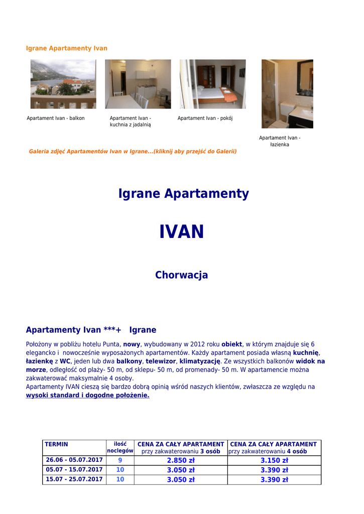 Igrane Apartamenty Ivan Apartament Ivan - balkon Apartament Ivan kuchnia z jadalnią Apartament Ivan - pokój Apartament Ivan łazienka Galeria zdjęć Apartamentów Ivan w Igrane...(kliknij aby przejść do Galerii) Igrane Apartamenty IVAN Chorwacja Apartamenty Ivan ***+ Igrane Położony w pobliżu hotelu Punta, nowy, wybudowany w 2012 roku obiekt, w którym znajduje się 6 elegancko i nowocześnie wyposażonych apartamentów. Każdy apartament posiada własną kuchnię, łazienkę z WC, jeden lub dwa balkony, telewizor, klimatyzację. Ze wszystkich balkonów widok na morze, odległość od plaży- 50 m, od sklepu- 50 m, od promenady- 50 m. W apartamencie można zakwaterować maksymalnie 4 osoby. Apartamenty IVAN cieszą się bardzo dobrą opinią wśród naszych klientów, zwłaszcza ze względu na wysoki standard i dogodne położenie. TERMIN 26.06 - 05.07.2017 05.07 - 15.07.2017 15.07 - 25.07.2017 ilość CENA ZA CAŁY APARTAMENT CENA ZA CAŁY APARTAMENT noclegów przy zakwaterowaniu 3 osób przy zakwaterowaniu 4 osób 9 10 10 2.850 zł 3.050 zł 3.050 zł 3.150 zł 3.390 zł 3.390 zł 25.07 - 04.08.2017 04.08 - 14.08.2017 14.08 - 24.08.2017 24.08 - 02.09.2017 10 10 10 9 3.050 3.050 3.050 2.850 zł zł zł zł 3.390 3.390 3.390 3.150 zł zł zł zł UWAGA: W apartamentach IVAN proponujemy Państwu również pobyt na dowolną ilość noclegów, które nie muszą pokrywać się z terminami naszych turnusów. W przypadku zainteresowania taką ofertą - prosimy o kontakt, przygotujemy indywidualne ceny. CENA ZAWIERA: ● ● ● ● ● ● zakwaterowanie w apartamencie taksę klimatyczną klimatyzację ubezpieczenie NNW + KL (NNW - następstw nieszczęśliwych wypadków, KL - kosztów leczenia) opiekę rezydenta podatek VAT WYŻYWIENIE: Istnieje możliwość wykupienia wyżywienia w Pensjonacie Mihaljević (w odl. 200m) w cenie: 15 Euro (HB - cała porcja), 8 Euro (HB - 1/2 porcji), 10 Euro (obiadokolacja - cała porcja), 6 Euro (obiadokolacja - 1/2 porcji). DOJAZD: Cena za przejazd autokarem, w obie strony: 350 zł / osoba. Wyjazdy z: Sosnowca, Katowic, Tychów, Pszczyny, Czechowic-Dziedzic, Bielska-Białej, Cieszyna. Odnośnie szczegółów dotyczących wyjazdu z tych miast - kliknij tutaj. W przypadku zainteresowania dojazdem z innych miast - kliknij tutaj. Apartamenty Ivan Igrane - rozmieszczenie w budynku tel./fax 33 8100 106 33 817 99 99
