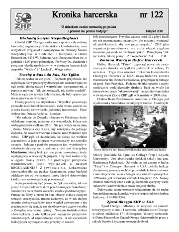 Kronika harcerska &Z dzieckiem swoim rozmawiaj po polsku i przeka# mu polskie tradycje& Obchody +wi/ta Niepodleg;o=ci Obw[d ZHP Chicago serdecznie zaprasza ca;' rodzin/ hareresk', organozacje wetera]skie i kombatanckie, oraz wszystkich przyjaci[; i sympatyk[w na obchody +wi/ta Noepodleg;o=ci w niedziel/, 11 listopada, w Domu Harcerskim, 6434 W. Belmont Ave. Uroczysta Msza =w. o godzinie 11.00 przed po;udniem. Po Mszy =w. akademia i program okoliczno=ciowy w wykonanu harcerskich zespo;[w &Wichry& i & Lechici&. Wst/p wolny. Troch/ o Nas i do Nas, Nie Tylko &Jak ci/ widz' tak ci/ pisz'&. To proste przys;owie, nie zag;/biaj'c si/ w przyczyny dlaczego, nie zastanawiaj'c si/ nad twoj' g;/bi' uczu\ i warto=ciami wewn/trznymi, a poprostu m[wi'c >&jak ci/ zobaczyli, tak ciebie os'dzili&. Mo#e te s'dy nie zawsze by;y s;uszne, ale by;y oparte cz/* sto na pierwszym wra#eniu.& Dzisiaj pos;u#/ si/ artyku;em z &W/ze;ka& powa#nego pisma dla instruktorek harcerskich, kt[re winno znalez\ si/ w r/ku ka#dej kierowniczki jednostek harcerskich. Pisze druhna hm. Danuta Andersz, Londyn> &My nale#'c do Zwi'zku Harcerstwa Polskiego, kiedy wk;adamy mundur, jeste=my dla wszystkich, kt[rzy nas widz' przedstawicielkami ZHP. Nie jest wa#ne nasze imi/ , Zosia, Marysia czy Kasia, my nale#ymy do jednego Zwi'zku, bo nasze zewn/trzne ubranie, nasz Mundur o tym m[wi. ZHP pgK od dziesi'tk[w lat cieszy si/ wielkim szacunkiem, a jego program wychowawczy ma szerokie uznanie. Jednym z punkt[w programu jest> wyrobienie w m;odzie#y dyscypliny, a jednym z nich jest dyscyplina Mundurowa Mundurowa, kt[rej brak jest specjalnie zauwa#ony, kiedy wyst/pujemy w wi/kszych grupach. Czy nam wolno i czy w og[le mamy prawo nie postrzega\ przepis[w mundurowych, jasno wypisanych w naszym REGULAMINIE@ Z pewno=ci' nie. Lekcewa#'c niewygodne dla nas punkty Regulaminu, coraz bardziej oddalamy si/ od wytycznych, kt[re kiedy= dobrowolnie ka#da z nas zobowi'za;a si/ przestrzega\. Jednego mo#emy by\ pewne, #e &jak nas widz', tak nas pisz'&. Grupa zw;aszcza du#a przedstawiaj'ca &kakofoni/& mundurow' nie wzbudzi szacunku i b/dzie poddana krytyce. Patrz'c na filmy z przed lat i na obecne videa z naszych r[#nych uroczysto=ci, trudno uwierzy\, #e w tak du#ym stopniu zlekcewa#yli=my nasz wygl'd zewn/trzny i nie przejmujemy si/ tym, #e nas si/ obserwuje i cz/sto wyrabia o Zwi'zku nies;uszn' opini/. Naszym instruktorskim obowi'zkiem (i nie tylko) jest wpajanie przepis[w mundurowych od najm;odszego zucha. A od wszystkich funkcyjnych wymaganie, aby przepisy te zawsze nr 122 listopad 2001 by;y przestrzegane. Przyk;ad zawsze musi i=\ z g[ry i je#eli my nie przestrzegamy przepis[w, nie mo#emy wymaga\ od podw;adnych, aby one przestrzega;y.& ZHP jako organizacja mundurowa, nie mo#e ulega\ ci'g;ym zmianom, jak moda na &wolnym rynku&. Pami/tajmy &Jak ci/ widz', tak ci/ pisz'&. Z &W/ze;ka&nr. 234. P.B. Zmiana Warty w Hufcu Harcerek Hufiec Harcerek &Tatry& rozpocz'; nowy rok pracy uroczyst' zbi[rk' wszystkich jednostek w sobot/ 15 wrze=nia. Tego dnia r[wnie# rozkazem komendantki Chor'gwi Harcerek w USA, now' hufcow' zosta;a mianowana hm. Beata Pawlikowska, przejmuj'c t/ funkcj/ od pwd. Basi Pacyniak. Podczas zbi[rki harcerki i zuchy serdecznie podzi/kowa;y druhnie Basi za wiele lat intensywnej pracy &ukoronowanej& uczestnictwem hufca w =wiatowym Zlocie ZHP pgK w Kanadzie w 2000 roku. Druhna Beata Pawlikowska, urodzona w Chicago, jest wychowank' harcerstwa na tutejszym terenie. Uko]czy;a Nowa hufcowa hm. Beata Pawlikowska prowadzi rad/ hufca szko;y jezuickie St. Ignatius Collage Prep i Loyola Uniwersity. Jest absolwentk' polskiej szko;y im. gen. Kazimierza Pu;askiego. Od wielu lat jest czynna w hufcu &Tatry& i w Chor'gwi Harcerek w USA, pe;ni;a funkcj/ dru#ynowej gromady zuch[w, prowadzi;a kolonie zuchowe i inne akcje letnie, m.in. chor'gwiany kurs dru#ynowych w 1998 roku, jest cz;onkini' Zarz'du Okr/gu w USA. Nowej druhnie hufcowej wraz z ca;' jej komend' #yczymy wiele sukces[w i zadowolenia z nowo podj/tej s;u#by. Dziewcz/ta zainteresowane w;'czeniem si/ do ruchu harcerskiego mog' kontaktowa\ si/ bezpo=rednio z druhn' hufcow' > 414*489*7346. Zjazd Okr/gu ZHP w USA Zjazd Okr/gu, od;o#ony ze wzgl/du na zamach terrorystyczny w dniu 11 wrze=nia, odb/dzie si/ w Chicago w sobot/ i niedziel/, 17 i 18 listopada. Witamy serdecznie w Domu Harcerskim Zarz'd Okr/gu i kierownik[w pracy z ca;ych Stan[w i #yczymy owocnych obrad. Witamy dwa nowe skrzaty... 29 wrze=nia w dalekiej Kalifornii przyszed; na =wiat Antoni Jan Toczyck, dumnym rodzicom druhostwu Ani i Robertowi, oraz szcz/=liwym dziadkom pp. Dembowskim i Toczyckim serdecznie gratulujemy. W Chicago w dniu 29 pa-dziernika urodzi; si/ :ukasz Andrzej Majsterek. T' drog' przekazujemy najszczersze gratulacje rodzicom Ali i Czesiowi, oraz babci druhnie Jasi Piotrowskiej. Obu ch;opaczkom ju# dzisiaj #yczymy, aby wyrosli na zdrowych i dzielnych skrzat[w. Bazar przedswiateczny Zarz'd Obwodu zaprasza serdecznie na doroczny bazar przed=wi'teczny w Domu Harcerskim, w sobot/ i niedziel/ 1 i 2 grudnia, od godz. 12* 6 po poludniu. Bazar to wyj'tkowa okazja, aby zaopatrzy\ si/ w kartki swiateczne, Druhna hm. Basia Link po radzie hufca w dniu 6 pa-dzirnika pokazuje druhnom jak robi\ zabawki na choink/ w swoich dru#ynach na bazar. Doch[d ze sprzeda#y jest na Dom Harc. op;atki, s;odycze, kalendarze, r/cznie robione ozdoby na choink/, polskie wyroby ludowe, drobne upominki, ksi'#ki. Przez caly czas czynna bedzie kawiarenka, mo#na spokojnie sia=\ i porozmawia\ z przyjaci[;mi, a przytem smacznie zje=\ domowej roboty potrawy i wypieki. ZAPRASZAMY! &Lechici& Wyst/puj' Harcerski Zesp[; Ta]ca Ludowego &Lechici& w;'czy; si/ energicznie w pa-dziernikowe obchody Miesi'ca Dziedzictwa Polskiego, wyst/puj'c ju# kilka razy w miejskich bibliotekach publicznych rozsianych po ca;ym mie=cie. &Lechici& wyst'pili we wtorek 30 pa-dziernika w bibliotece McKinley. Z ~a;obnej Kroniki.... Z r[#nych powod[w wiele naszych przyjaci[; nie mog;o z;o#y\ ostatnie modlitwy u trumn