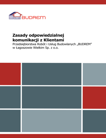 Zasady odpowiedzialnej komunikacji z Klientami Przedsiębiorstwa Robót i Usług Budowlanych „BUDREM” w Łagoszowie Wielkim Sp. z o.o. 1 „BUDREM” w Łagoszowie Wielkim Sp. z o.o. - przedsiębiorstwo odpowiedzialne społecznie – swoje działania i współpracę z Klientami opiera na zaufaniu i partnerstwie. W niniejszym dokumencie prezentujemy Państwu zasady odpowiedzialnej komunikacji z Klientami - Inwestorami i wynikające z nich nasze zobowiązania. Dokument ten kierujemy do firm, jednostek publicznych, osób indywidualnych oraz innych instytucji – naszych potencjalnych i obecnych Klientów Inwestorów celem zachęcenia do współpracy. Zapraszamy serdecznie! Jerzy Krotla Prezes Zarządu Marcin Krotla Wiceprezes Zarządu Misją BUDREM jest zapewnianie Klientom wysokiej jakości usług ogólnobudowlanych w sposób rzetelny, budujący wiarygodność i markę firmy. Pracujemy w oparciu o wartości etyczne i biznesowe, które odzwierciedlają naszą filozofię działania. Jesteśmy wiarygodnym i odpowiedzialnym partnerem – godnym Państwa zaufania. Gwarantujemy współpracę w oparciu o takie wartości, jak: solidność, odpowiedzialność, sprawne zarządzanie, uczciwość, szacunek dla Klientów, pracowników, partnerów biznesowych, konkurencji, społeczności lokalnych i środowiska. Rzetelność i dotrzymywanie zobowiązań stanowią naczelną zasadę budowania naszych relacji z Klientami. Świadcząc usługi, rzetelnie informujemy klientów o wszystkich aspektach tych usług, pracujemy zgodnie z wymaganymi standardami. Wszelkie informacje dotyczące współpracy z naszymi Klientami są poufne. 2 Cel odpowiedzialnej komunikacji z Klientami Celem odpowiedzialnej komunikacji z Klientami BUDREM jest rzetelne poinformowanie Klientów o zakresie i standardzie oferowanych usług oraz jakości wzajemnych relacji, jak również umożliwienie Klientom przekazywania opinii na temat działania firmy, dla doskonalenia jakości i zakresu usług, a także zapewnienia satysfakcji Klientom. Nasze zobowiązania 1. BUDREM zobowiązuje się do: zapewnienia Klientom rzeczowych i bezstronnych informacji o oferowanych usługach, w tym na temat bezpieczeństwa i zdrowia dla użytkowników, jeśli ma to zastosowanie; otwartego ujawniania całkowitych cen usług oraz innych opłat; prezentowania ofert w sposób przejrzysty; przedstawiania informacji w sposób zrozumiały, upewniając się, że Klient rozumie każdą przedstawioną informację; zachowania życzliwości i uprzejmości w kontaktach z Klientem. 2. BUDREM zapewnia Klientom dostęp do informacji o usługach i swojej ofercie za pośrednictwem: strony internetowej www.budrem.biz.pl, wkładek reklamowych, newsletterów, odpowiedzi na zapytania e-mailowe, odpowiedzi ustnych na zapytania, pisemnych ofert na życzenie Klienta i zgodnie z ustaleniami. 3. BUDREM zapewnia Klientom komunikację dwustronną poprzez: telefon i fax: tel./fax. (76) 831 14 80 od poniedziałku do piątku w godz. 700-1500; kom: 601 053 086, 607 580 850 od poniedziałku do soboty w godz. 700-1700, e-mail: [email protected], spotkanie bezpośrednie po uprzednim ustaleniu miejsca i czasu, wizytę osobistą w firmie. 4. BUDREM zobowiązuje się do udzielenia Klientowi informacji zwrotnej: poprzez kontakt bezpośredni; e-mailem w ciągu 24 godz. od potwierdzonego otrzymania zapytania ofertowego lub następnego dnia roboczego (w którym zostanie ustalony dalszy tok kontaktów i postępowania); poprzez komunikację telefoniczną – w ciągu 24 godz. od przeprowadzonej rozmowy i złożenia oficjalnego zapytania ofertowego; w innych przypadkach w ciągu 24 godz. lub następnego dnia roboczego. 5. BUDREM zobowiązuje się do stosowania uczciwych praktyk w zakresie umów zawieranych z Klientami, tj.: przedstawiania informacji w sposób zrozumiały dla Klienta, formułowania umów w drodze porozumienia stron, stałego udostępniania wzoru umowy w biurze firmy. 3 Zasady kontaktu bezpośredniego pracowników BUDREM z Klientami 1. Pracownicy BUDREM są do dyspozycji Klientów w godzinach i dniach pracy ustalonych przez Zarząd Spółki. 2. Pracownicy przedstawiają informację Klientowi zgodnie ze swoją specjalizacją, tak by udzielić jak najobszerniejszej i poprawnej informacji. 3. Pracownicy Budrem, posiadając odpowiednią wiedzę i doświadczenie, chętnie świadczą usługi doradcze – Klient może liczyć na fachową poradę z ich strony. 4. Kontakt bezpośredni z Klientem traktowany jest priorytetowo, pracownicy zawsze odnoszą się z życzliwością i cierpliwością do Klienta. Kontakt telefoniczny z Klientami BUDREM 1. Rozpoczynając rozmowę telefoniczną przedstawiciel BUDREM zawsze przedstawia się, aby Klient wiedział z kim rozmawia. 2. Pracownicy BUDREM mogą poprosić Klienta o kontakt zwrotny w celu przygotowania skrojonej na miarę oferty i późniejszy kontakt ze strony firmy. 3. Kontakt telefoniczny służy tylko i wyłącznie udzieleniu informacji, bądź potwierdzeniu złożonego za pośrednictwem poczty elektronicznej lub osobiście zapytania ofertowego. 4. Dane telefoniczne do kontaktu dla Klientów są zamieszczone na stronie internetowej firmy www.budrem.biz.pl, w materiałach reklamowych oraz w siedzibie firmy. Materiały reklamowe i ofertowe 1. Informacje umieszczane na materiałach reklamowych i ofertowych są: zgodne z prawdą i stanem faktycznym – zawierają prawdziwe opisy usług, cen i inne istotne dla Klienta informacje; sformułowane jednoznacznie i przejrzyście z uwzględnieniem zasad współpracy, gwarancji i reklamacji. 2. Materiały reklamowe i ofertowe są: dostosowane do potrzeb Klienta; estetyczne i funkcjonalne; aktualne. 4 Wykorzystanie wizerunku i materiałów BUDREM przez Klientów 1. W przypadku potrzeby przedstawienia prac zrealizowanych przez BUDREM udostępniamy naszym Klientom materiały przydatne do prezentacji naszych dokonań. Udzielamy zgody na wykorzystanie tych materiałów w celach zaprezentowania naszych dokonań na