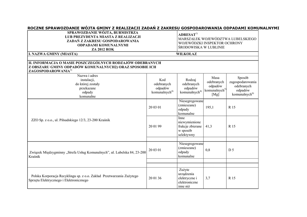 ROCZNE SPRAWOZDANIE WÓJTA GMINY Z REALIZACJI ZADAŃ Z ZAKRESU GOSPODAROWANIA ODPADAMI KOMUNALNYMI SPRAWOZDANIE WÓJTA, BURMISTRZA ADRESAT1) LUB PREZYDENTA MIASTA Z REALIZACJI 1) MARSZAŁEK WOJEWÓDZTWA LUBELSKIEGO ZADAŃ Z ZAKRESU GOSPODAROWANIA 2) WOJEWÓDZKI INSPEKTOR OCHRONY ODPADAMI KOMUNALNYMI ŚRODOWISKA W LUBLINIE ZA 2012 ROK I. NAZWA GMINY (MIASTA) WILKOŁAZ II. INFORMACJA O MASIE POSZCZEGÓLNYCH RODZAJÓW ODEBRANYCH Z OBSZARU GMINY ODPADÓW KOMUNALNYCH2) ORAZ SPOSOBIE ICH ZAGOSPODAROWANIA3) Nazwa i adres instalacji, Kod do której zostały odebranych przekazane odpadów odpady komunalnych4) komunalne 20 03 01 ZZO Sp. z o.o., ul. Piłsudskiego 12/3, 23-200 Kraśnik 20 01 99 Związek Międzygminny „Strefa Usług Komunalnych”, ul. Lubelska 84, 23-200 Kraśnik Polska Korporacja Recyklingu sp. z o.o. Zakład Przetwarzania Zużytego Sprzętu Elektrycznego i Elektronicznego Masa Sposób Rodzaj odebranych zagospodarowania odebranych odpadów odebranych odpadów 5) komunalnych odpadów komunalnych4) [Mg] komunalnych6) Niesegregowane (zmieszane) 195,1 odpady komunalne Inne niewymienione frakcje zbierane 41,3 w sposób selektywny R 15 R 15 20 03 01 Niesegregowane (zmieszane) 0,8 odpady komunalne D5 20 01 36 Zużyte urządzenia elektryczne i elektroniczne inne niż R 15 3,7 wymienione w 20 01 21, 20 01 23 i 20 01 35 Opakowania z tworzyw 4,1 sztucznych Opakowania ze 6,0 szkła Baterie i akumulatory łącznie z bateriami i akumulatorami wymienionymi w 16 06 01, 16 0,1 06 02 lub 16 06 03 oraz niesortowane baterie i akumulatory zawierające te baterie Masa Masa odpadów odebranych o kodzie 20 03 odpadów o 01 kodzie poddanych 20 03 015) składowaniu5) [Mg] [Mg] 15 01 02 P.P.H.U. T-GAZ s.c. Al. Młodości 39, 23-210 Kraśnik 15 01 07 REBA Organizacja Odzysku S.A. ul. Kubickiego 19 lok.16, 02-954 Warszawa Odebranych z obszarów miejskich Odebranych z obszarów wiejskich Liczba punktów selektywnego zbierania odpadów komunalnych, funkcjonujących na terenie gminy Nazwa i adres punktu 20 01 36 R 15 R 15 R 15 Masa odpadów o kodzie 20 03 01 poddanych innym niż składowanie procesom przetwarzania5) [Mg] 0 0 0 195,9 0,8 195,1 4 Kod Rodzaj zebranych Masa zebranych zebranych odpadów odpadów komunalnych4) komunalnych4) b. danych b. danych Szkoły z terenu gminy Wilkołaz III. INFORMACJA O MASIE ODPADÓW KOMUNALNYCH ULEGAJĄCYCH BIODEGRADACJI7) Łączna masa selektywnie odebranych odpadów komunalnych ulegających biodegradacji5) [Mg] a) przekazanych do składowania na składowisku odpadów Kod Nazwa i adres odebranych składowiska, na które odpadów przekazano odpady komunalnych komunalne ulegające ulegających biodegradacji biodegradacji4) 0 0 odpadów komunalnych5) [Mg] b. danych 3,3 Rodzaj odebranych odpadów komunalnych ulegających biodegradacji4) 0 Masa odpadów komunalnych ulegających biodegradacji przekazanych do składowania na składowisku odpadów5) [Mg] 0 b) nieprzekazanych do składowania na składowisku odpadów Nazwa i adres instalacji, do której przekazano odpady komunalne ulegające biodegradacji ZZO Sp. z o.o., ul. Piłsudskiego 12/3, 23-200 Kraśnik Kod odebranych odpadów komunalnych ulegających biodegradacji4) 15 01 01 Rodzaj odebranych odpadów komunalnych ulegających biodegradacji4) Opakowania z papieru i tektury IV. OSIĄGNIĘTY POZIOM OGRANICZENIA MASY ODPADÓW KOMUNALNYCH ULEGAJĄCYCH BIODEGRADACJI KIEROWANYCH DO SKŁADOWANIA9) Masa odpadów Sposób komunalnych zagospodarowania ulegających odpadów biodegradacji komunalnych nieprzekazanych ulegających do składowania biodegradacji8) na składowiska nieprzekazanych odpadów5) do składowania na [Mg] składowiska odpadów 0 3,3 21,14 V. POZIOM RECYKLINGU I PRZYGOTOWANIA DO PONOWNEGO UŻYCIA NASTĘPUJĄCYCH FRAKCJI ODPADÓW KOMUNALNYCH: PAPIERU, METALI, TWORZYW SZTUCZNYCH I SZKŁA10) ODEBRANYCH Z OBSZARU GMINY Łączna masa odebranych odpadów komunalnych5) [Mg] Rodzaj odebranych odpadów komunalnych4) Kod odebranych odpadów komunalnych4) 15 01 02 Opakowania z tworzyw sztucznych 11,0 15 01 07 Opakowania ze szkła 18,8 15 01 01 Opakowania z papieru i tektury 3,3 15 01 04 Opakowania z metali 4,1 Osiągnięty poziom recyklingu, przygotowania do ponownego użycia11) następujących frakcji 10,36 odpadów komunalnych: papieru, metali, tworzyw sztucznych i szkła [%] VI. POZIOM RECYKLINGU, PRZYGOTOWANIA DO PONOWNEGO UŻYCIA I ODZYSKU INNYMI METODAMI INNYCH NIŻ NIEBEZPIECZNE ODPADÓW BUDOWLANYCH I ROZBIÓRKOWYCH12) Z ODEBRANYCH Z OBSZARU GMINY ODPADÓW KOMUNALNYCH Kod odebranych odpadów4) 0 0 Osiągnięty poziom recyklingu, przygotowania do ponownego użycia i odzysku innymi metodami11) innych niż niebezpieczne odpadów budowlanych i rozbiórkowych [%] 0 0 0 Masa odpadów przygotowanych do ponownego użycia5) [Mg] 11,0 18,8 3,3 4,1 Masa odpadów poddanych odzyskowi innymi metodami niż recykling i ponowne użycie5) [Mg] Masa odpadów przygotowanych do ponownego użycia5) [Mg] Masa odpadów poddanych recyklingowi5) [Mg] Łączna masa odebranych odpadów5) [Mg] Rodzaj odebranych odpadów4) Masa odpadów poddanych recyklingowi5) [Mg] 11,0 18,8 3,3 4,1 0 0 VII. LICZBA WŁAŚCICIELI NIERUCHOMOŚCI, OD KTÓRYCH ZOSTAŁY ODEBRANE ODPADY KOMUNALNE 1017 VIII. LICZBA WŁAŚCICIELI NIERUCHOMOŚCI, KTÓRZY ZBIERAJĄ ODPADY KOMUNALNE W SPOSÓB NIEZGODNY Z REGULAMINEM UTRZYMANIA CZYSTOŚCI nie dotyczy I PORZĄDKU NA TERENIE GMINY13) IX. RODZAJ I ILOŚĆ NIECZYSTOŚCI CIEKŁYCH ODEBRANYCH Z OBSZARU GMINY Ilość odebranych z obszaru gminy Rodzaj odebranych z obszaru gminy nieczystości ciekłych5) 14) nieczystości ciekłych [m3] Ścieki bytowe 5712 X. DODATKOWE UWAGI XI. DANE OSOBY WYPEŁNIAJĄCEJ SPRAWOZDANIE Imię Grażyna Telefon służbowy15) 81 8217 982 Nazwisko Kamińska Faks służbowy15)- E-mail służbowy15) grazyna.kaminska @wilkolaz.pl Podpis i pieczątka wójta, burmistrza lub prezydenta miasta Data 15 marca 2013 r. Objaśnienia: Należy wpisać właściwego ze względu na położenie gminy marszałka województwa oraz 