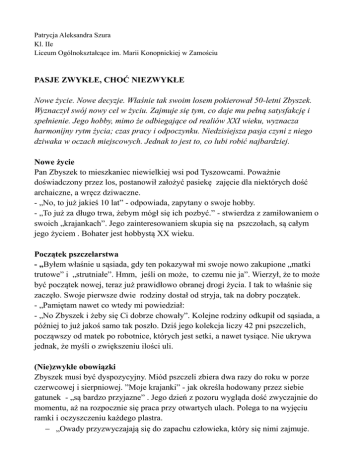 Patrycja Aleksandra Szura Kl. IIe Liceum Ogólnokształcące im. Marii Konopnickiej w Zamościu PASJE ZWYKŁE, CHOĆ NIEZWYKŁE Nowe życie. Nowe decyzje. Właśnie tak swoim losem pokierował 50-letni Zbyszek. Wyznaczył swój nowy cel w życiu. Zajmuje się tym, co daje mu pełną satysfakcję i spełnienie. Jego hobby, mimo że odbiegające od realiów XXI wieku, wyznacza harmonijny rytm życia; czas pracy i odpoczynku. Niedzisiejsza pasja czyni z niego dziwaka w oczach miejscowych. Jednak to jest to, co lubi robić najbardziej. Nowe życie Pan Zbyszek to mieszkaniec niewielkiej wsi pod Tyszowcami. Poważnie doświadczony przez los, postanowił założyć pasiekę zajęcie dla niektórych dość archaiczne, a wręcz dziwaczne. - „No, to już jakieś 10 lat” - odpowiada, zapytany o swoje hobby. - „To już za długo trwa, żebym mógł się ich pozbyć.” - stwierdza z zamiłowaniem o swoich „krajankach”. Jego zainteresowaniem skupia się na pszczołach, są całym jego życiem . Bohater jest hobbystą XX wieku. Początek pszczelarstwa - „Byłem właśnie u sąsiada, gdy ten pokazywał mi swoje nowo zakupione „matki trutowe” i „strutniałe”. Hmm, jeśli on może, to czemu nie ja”. Wierzył, że to może być początek nowej, teraz już prawidłowo obranej drogi życia. I tak to właśnie się zaczęło. Swoje pierwsze dwie rodziny dostał od stryja, tak na dobry początek. - „Pamiętam nawet co wtedy mi powiedział: - „No Zbyszek i żeby się Ci dobrze chowały”. Kolejne rodziny odkupił od sąsiada, a później to już jakoś samo tak poszło. Dziś jego kolekcja liczy 42 pni pszczelich, począwszy od matek po robotnice, których jest setki, a nawet tysiące. Nie ukrywa jednak, że myśli o zwiększeniu ilości uli. (Nie)zwykłe obowiązki Zbyszek musi być dyspozycyjny. Miód pszczeli zbiera dwa razy do roku w porze czerwcowej i sierpniowej. ”Moje krajanki” - jak określa hodowany przez siebie gatunek - „są bardzo przyjazne” . Jego dzień z pozoru wygląda dość zwyczajnie do momentu, aż na rozpocznie się praca przy otwartych ulach. Polega to na wyjęciu ramki i oczyszczeniu każdego plastra. „Owady przyzwyczajają się do zapachu człowieka, który się nimi zajmuje. Wtedy to właśnie już nie żądlą tak bardzo. Początkowo było bardzo źle”.Jeśli chodzi o osobę,która weszła do pasieki powinna zachowywać się spokojnie unikając gwałtownych ruchów i zakryć włosy(gdyż często mimowolnie się w nie wplątują).Jeśli się już zdarzy,że jakaś siądzie na ręce wystarczy delikatnie ją zrzucić z siebie. Ta praca wymaga od niego wiele wyrzeczeń. Zawsze na zimę ma dużo pracy począwszy od nakarmienia każdej rodziny 10 kilogramami cukru, po ocieplenie gniazda. - „Co trzy lata wymieniam, też matki, to bardzo ważne, gdyż one zawsze zapewniają wielkość rodziny w ulu”. Na ten rok zamówił już dziesięć „matek”. Wypuści je w okresie czerwienia, choć ma pewne obawy, czy owady je zaakceptują. „Często jest tak, że pszczoły same sobie wybierają królową i mianują ją, jednak muszą to robić co trzy lata, gdyż nie spełniają już swojej roli”. Jak mnie widzą? - „Co mówią o mnie inni, to sam nie wiem, nigdy się nie zastanawiałem” Bohater zajmuje się pracą pszczelarza, ponieważ sprawia mu wielką przyjemność. Spełnia przy tym swoje marzenia. Są jednak i tacy, którzy uważają to za dość archaiczne zajęcie. - „Trzeba popytać sąsiadów, choć jedną wypowiedź pamiętam dobrze; wszystkiego bym się po tobie spodziewał Zbychu, ale tego, że będziesz pszczoły hodował to w życiu! – wspomina. Bohater nie przejmuje się opinią innych. Przyznaje, iż jego hobby nie jest jednym z tych, które zasilają kręgi społeczeństwa, ale nie ma zamiaru rezygnować. Ma przy tym bardzo dużo pracy. Jednakże to jest to, co to najbardziej kocha w swoim życiu. „Moja dola” -„To nie jest tak, że robię to dla pieniędzy” - twierdzi sam bohater. Ma pewien dochód z tej działalności, jednak nie na tyle wysoki , by zapewniło mu dostateczny byt. -„Wiadomo jest jakiś zysk, ale ja się do moich pszczół po prostu przyzwyczaiłem” – odpowiada. Zajmują jego cały wolny czas. Ma nawet zwiększyć liczbę uli do 50. To jest jego konik, wie o nich wszystko. - „Oczywiście to, co w nie zainwestuje, zwraca się ze sprzedaży miodu, gorzej już z gołębiami. Wszyscy gdzieś tak gonią, a tam mam na wszystko czas”. Zbyszek teraz wie, że jego życie było pasmem bolesnych zdarzeń, które odcisnęły piętno na jego psychice. Pasja pozwoliła mu zapomnieć o przeszłości i rozwijać się. Z pewnością też wiąże z pszczelarstwem przyszłość, bo jak twierdzi; - „Za długo to już trwa, żebym mógł się ich pozbyć”.