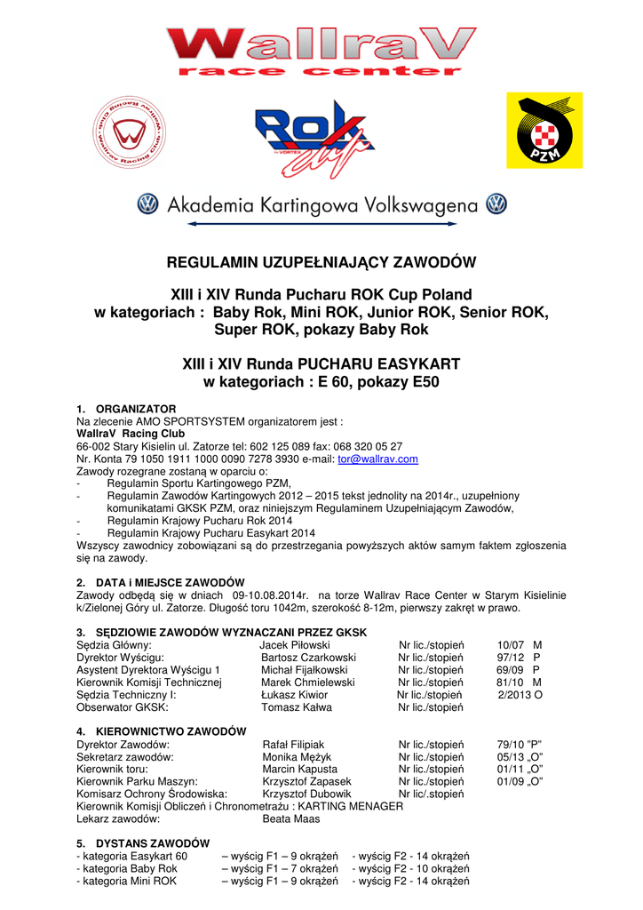 REGULAMIN UZUPEŁNIAJĄCY ZAWODÓW XIII i XIV Runda Pucharu ROK Cup Poland w kategoriach : Baby Rok, Mini ROK, Junior ROK, Senior ROK, Super ROK, pokazy Baby Rok XIII i XIV Runda PUCHARU EASYKART w kategoriach : E 60, pokazy E50 1. ORGANIZATOR Na zlecenie AMO SPORTSYSTEM organizatorem jest : WallraV Racing Club 66-002 Stary Kisielin ul. Zatorze tel: 602 125 089 fax: 068 320 05 27 Nr. Konta 79 1050 1911 1000 0090 7278 3930 e-mail: [email protected] Zawody rozegrane zostaną w oparciu o: Regulamin Sportu Kartingowego PZM, Regulamin Zawodów Kartingowych 2012 – 2015 tekst jednolity na 2014r., uzupełniony komunikatami GKSK PZM, oraz niniejszym Regulaminem Uzupełniającym Zawodów, Regulamin Krajowy Pucharu Rok 2014 Regulamin Krajowy Pucharu Easykart 2014 Wszyscy zawodnicy zobowiązani są do przestrzegania powyższych aktów samym faktem zgłoszenia się na zawody. 2. DATA i MIEJSCE ZAWODÓW Zawody odbędą się w dniach 09-10.08.2014r. na torze Wallrav Race Center w Starym Kisielinie k/Zielonej Góry ul. Zatorze. Długość toru 1042m, szerokość 8-12m, pierwszy zakręt w prawo. 3. SĘDZIOWIE ZAWODÓW WYZNACZANI PRZEZ GKSK Sędzia Główny: Jacek Piłowski Dyrektor Wyścigu: Bartosz Czarkowski Asystent Dyrektora Wyścigu 1 Michał Fijałkowski Kierownik Komisji Technicznej Marek Chmielewski Sędzia Techniczny I: Łukasz Kiwior Obserwator GKSK: Tomasz Kałwa Nr lic./stopień Nr lic./stopień Nr lic./stopień Nr lic./stopień Nr lic./stopień Nr lic./stopień 4. KIEROWNICTWO ZAWODÓW Dyrektor Zawodów: Rafał Filipiak Nr lic./stopień Sekretarz zawodów: Monika Mężyk Nr lic./stopień Kierownik toru: Marcin Kapusta Nr lic./stopień Kierownik Parku Maszyn: Krzysztof Zapasek Nr lic./stopień Komisarz Ochrony Środowiska: Krzysztof Dubowik Nr lic/.stopień Kierownik Komisji Obliczeń i Chronometrażu : KARTING MENAGER Lekarz zawodów: Beata Maas 5. DYSTANS ZAWODÓW - kategoria Easykart 60 - kategoria Baby Rok - kategoria Mini ROK – wyścig F1 – 9 okrążeń – wyścig F1 – 7 okrążeń – wyścig F1 – 9 okrążeń - wyścig F2 - 14 okrążeń - wyścig F2 - 10 okrążeń - wyścig F2 - 14 okrążeń 10/07 M 97/12 P 69/09 P 81/10 M 2/2013 O 79/10 ”P” 05/13 „O” 01/11 „O” 01/09 „O” - kategoria Junior ROK - kategoria Senior ROK - kategoria Super ROK – wyścig F1 – 10 okrążeń - wyścig F2 - 16 okrążeń – wyścig F1 – 12 okrążeń - wyścig F2 - 18 okrążeń – wyścig F1 – 12 okrążeń - wyścig F2 - 18 okrążeń. 6. ZGŁOSZENIA DO ZAWODÓW Obowiązują zgłoszenia pisemne, wyłącznie na obowiązujących drukach poświadczonych przez macierzyste kluby, które należy przesłać na adres organizatora w terminie do dnia 01.08.2014r. (decyduje data stempla pocztowego). Wpisowe przyjmowane będzie zgodnie z regulaminem. Zawodnicy zgłoszeni po terminie mogą być przyjęci pod warunkiem wpłacenia wpisowego w 2- krotnej wysokości. 7. WARUNKI UDZIAŁU 1. Zgłoszenie do zawodów (na obowiązującym formularzu) 2. Licencja kartingowa ważna na dany rok z wpisaną przynależnością klubową i numerem polisy ubezpieczeniowej, 3. Aktualna karta zdrowia potwierdzona przez lekarza posiadającego uprawnienia medycyny sportowej lub posiadającego certyfikat Państwowego Towarzystwa Medycyny Sportowej (w przypadku wpisu warunkowego obowiązkowy termin ważności) 4. Sprzęt zgodny z RZK i kartami technicznymi dla danej klasy i kategorii, 5. Opłacenie wpisowego. /organizator ma prawo odmówić przyjęcia zawodnika do zawodów jeżeli jego zgłoszenie wraz z wpisowym nie wpłynęło w terminie/. 8. PROTESTY I ODWOŁANIA Ewentualne protesty i odwołanie należy składać na piśmie wraz z poświadczeniem wpłaty kaucji na ręce Dyrektora Zawodów. Kaucja za protest wynosi 500 zł, za odwołanie 3 000 zł. 9. NAGRODY Nagrody zostaną przyznane zgodnie z RZK 2014r. 10. POSTANOWIENIA KOŃCOWE A/ obowiązuje bezwzględny zakaz jazdy kartami w parku maszyn B/ obowiązuje bezwzględny zakaz używania otwartego ognia w parku maszyn C/ korzystanie z toru w czasie innym niż przewiduje regulamin szczegółowy zawodów może nastąpić wyłącznie po uzgodnieniu z gospodarzem toru. D/ obowiązkowym paliwem na zawody jest paliwo o liczbie oktanowej 98 zakupione na stacji paliw ze wskazanego dystrybutora Stacji Paliw PKN ORLEN Nr 4025 Zielona Góra ul. Szosa Kisielińska (Osiedle Pomorskie). E/ organizator udostępni park maszyn i miejsce kempingowe od dnia 14.05.2014r., wcześniejsze przybycie należy uzgodnić z organizatorem. Ustawienie namiotów oraz samochodów, podłączeń prądu w parku maszyn można dokonać po uzgodnieniu z kierownikiem parku maszyn. F/ treningi przed zawodami będą się odbywały w następujących terminach: - środa, czwartek 06,07.08.2014r. – jazdy wolne w godz. 08.00 do 16.00 koszt 130 zł - piątek 08.08.2014r. – jazdy wolne w godz. 08.00 do 11.45 - koszt 80 zł G/ zawodnicy i mechanicy zobowiązani są, na terenie obiektu, do noszenia identyfikatorów przez cały czas trwania zawodów. H/ organizator nie bierze odpowiedzialności za szkody powstałe w czasie trwania zawodów oraz treningów w stosunku do zawodników i osób im towarzyszących oraz sprzętu przez nich posiadanego. I/ organizator ustala opłatę zgodnie z komunikatem nr 1.2014 GKSK za prowadzenie działalności handlowej w czasie trwania zawodów. J/ organizator zobowiązuje zawodników do posiadania i stosowania podłogi (podłoga namiotu, folia) w miejscu postoju karta. K/ obowiązuje bezwzględny zakaz wbijania haków i wiercenia dziur w nawierzchnię asfaltową w parku maszyn L/ Samochody osobowe nie będą wpuszczane na teren parku maszyn - nie zastosowanie się do powyższego może skutkować karą finansową nałożoną przez dyrektora zawodów. M/ Park Maszyn w godzinach 21.00 do 06.00 będzie zamknięty. ZAŁĄCZNIKI: Wykaz hoteli w miejscu zawodów, Program minutowy zawodów, Dyrektor Zawodów Rafał Filipiak Powyższy Regulamin został zatwierdzony przez GKSK w 