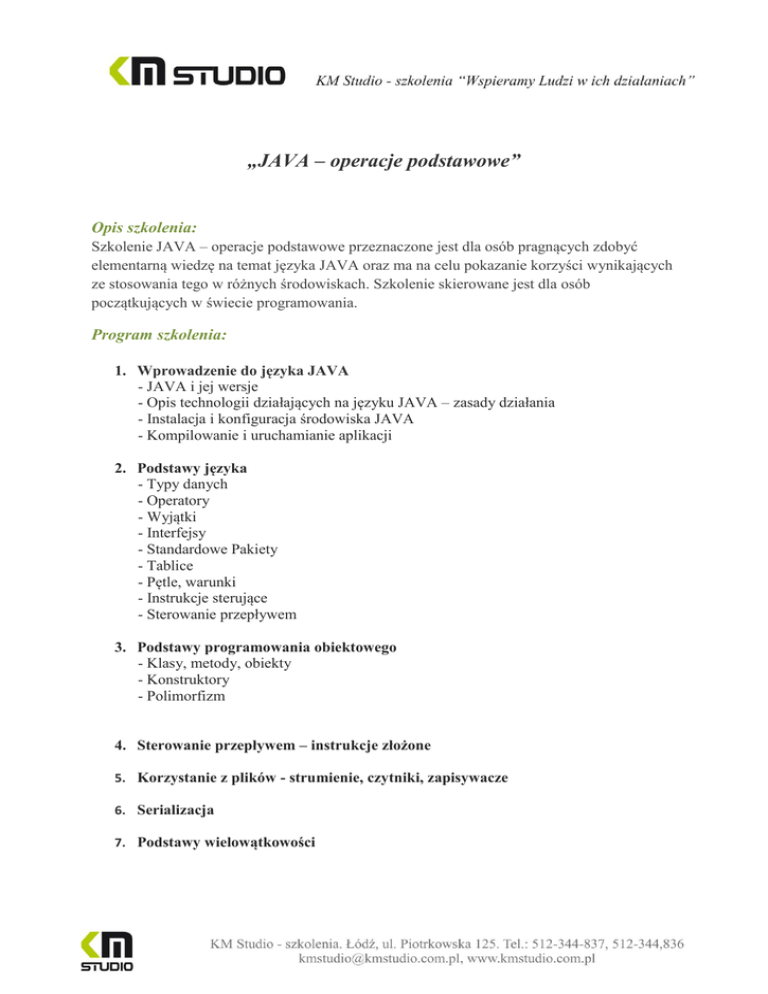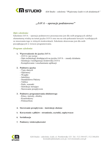 „JAVA – operacje podstawowe” Opis szkolenia: Szkolenie JAVA – operacje podstawowe przeznaczone jest dla osób pragnących zdobyć elementarną wiedzę na temat języka JAVA oraz ma na celu pokazanie korzyści wynikających ze stosowania tego w różnych środowiskach. Szkolenie skierowane jest dla osób początkujących w świecie programowania. Program szkolenia: 1. Wprowadzenie do języka JAVA - JAVA i jej wersje - Opis technologii działających na języku JAVA – zasady działania - Instalacja i konfiguracja środowiska JAVA - Kompilowanie i uruchamianie aplikacji 2. Podstawy języka - Typy danych - Operatory - Wyjątki - Interfejsy - Standardowe Pakiety - Tablice - Pętle, warunki - Instrukcje sterujące - Sterowanie przepływem 3. Podstawy programowania obiektowego - Klasy, metody, obiekty - Konstruktory - Polimorfizm 4. Sterowanie przepływem – instrukcje złożone 5. Korzystanie z plików - strumienie, czytniki, zapisywacze 6. Serializacja 7. Podstawy wielowątkowości 8. Kolekcje, a typy generyczne - wprowadzenie Metodologia: - mini wykłady w Power Point - ćwiczenia przy komputerach (każdy uczestnik pracuje na osobnym komputerze) - mini filmiki szkoleniowe Informacje organizacyjne: Ilość godzin szkolenia: 14 godzin / 2dni Godziny szkolenia: 9:15-16:15 Miejsce szkolenia: Łódź, ul Piotrkowska 125 – KM Studio - szkolenia