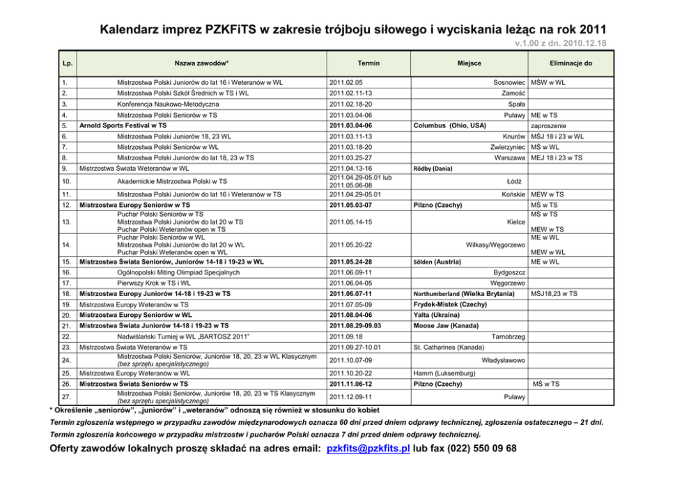 Kalendarz imprez PZKFiTS w zakresie trójboju siłowego i wyciskania leżąc na rok 2011 v.1.00 z dn. 2010.12.18 Nazwa zawodów* Lp. Termin 1. Mistrzostwa Polski Juniorów do lat 16 i Weteranów w WL 2011.02.05 2. Mistrzostwa Polski Szkół Średnich w TS i WL 2011.02.11-13 3. Konferencja Naukowo-Metodyczna 2011.02.18-20 4. Mistrzostwa Polski Seniorów w TS 2011.03.04-06 5. Arnold Sports Festival w TS 2011.03.04-06 6. Mistrzostwa Polski Juniorów 18, 23 WL 2011.03.11-13 7. Mistrzostwa Polski Seniorów w WL 2011.03.18-20 8. Mistrzostwa Polski Juniorów do lat 18, 23 w TS 2011.03.25-27 9. Mistrzostwa Świata Weteranów w WL 10. Akademickie Mistrzostwa Polski w TS 11. Mistrzostwa Polski Juniorów do lat 16 i Weteranów w TS 12. 13. 14. 15. Mistrzostwa Europy Seniorów w TS Puchar Polski Seniorów w TS Mistrzostwa Polski Juniorów do lat 20 w TS Puchar Polski Weteranów open w TS Puchar Polski Seniorów w WL Mistrzostwa Polski Juniorów do lat 20 w WL Puchar Polski Weteranów open w WL Mistrzostwa Świata Seniorów, Juniorów 14-18 i 19-23 w WL Miejsce Eliminacje do Sosnowiec MŚW w WL Zamość Spała Puławy ME w TS Columbus (Ohio, USA) zaproszenie Knurów MŚJ 18 i 23 w WL Zwierzyniec MŚ w WL Warszawa MEJ 18 i 23 w TS 2011.04.13-16 2011.04.29-05.01 lub 2011.05.06-08 2011.04.29-05.01 Rödby (Dania) 2011.05.03-07 Pilzno (Czechy) Łódź Końskie MEW w TS MŚ w TS MŚ w TS 2011.05.14-15 Kielce MEW w TS ME w WL Wilkasy/Węgorzewo 2011.05.20-22 2011.05.24-28 MEW w WL ME w WL Sölden (Austria) 16. Ogólnopolski Miting Olimpiad Specjalnych 2011.06.09-11 Bydgoszcz 17. Pierwszy Krok w TS i WL 2011.06.04-05 Węgorzewo 18. Mistrzostwa Europy Juniorów 14-18 i 19-23 w TS 2011.06.07-11 Northumberland (Wielka Brytania) 19. Mistrzostwa Europy Weteranów w TS 2011.07.05-09 Frydek-Mistek (Czechy) 20. Mistrzostwa Europy Seniorów w WL 2011.08.04-06 Yalta (Ukraina) 21. Mistrzostwa Świata Juniorów 14-18 i 19-23 w TS 2011.08.29-09.03 Moose Jaw (Kanada) 22. 23. 24. 25. 26. 27. Nadwiślański Turniej w WL „BARTOSZ 2011” 2011.09.18 MŚJ18,23 w TS Tarnobrzeg Mistrzostwa Świata Weteranów w TS Mistrzostwa Polski Seniorów, Juniorów 18, 20, 23 w WL Klasycznym (bez sprzętu specjalistycznego) Mistrzostwa Europy Weteranów w WL 2011.09.27-10.01 2011.10.20-22 Hamm (Luksemburg) Mistrzostwa Świata Seniorów w TS Mistrzostwa Polski Seniorów, Juniorów 18, 20, 23 w TS Klasycznym (bez sprzętu specjalistycznego) 2011.11.06-12 Pilzno (Czechy) St. Catharines (Kanada) Władysławowo 2011.10.07-09 2011.12.09-11 MŚ w TS Puławy * Określenie „seniorów”, „juniorów” i „weteranów” odnoszą się również w stosunku do kobiet Termin zgłoszenia wstępnego w przypadku zawodów międzynarodowych oznacza 60 dni przed dniem odprawy technicznej, zgłoszenia ostatecznego – 21 dni. Termin zgłoszenia końcowego w przypadku mistrzostw i pucharów Polski oznacza 7 dni przed dniem odprawy technicznej. Oferty zawodów lokalnych proszę składać na adres email: [email protected] lub fax (022) 550 09 68