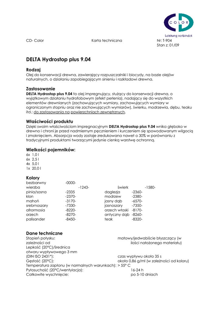 CD- Color Karta techniczna Nr: T-904 Stan z: 01/09 DELTA Hydrostop plus 9.04 Rodzaj Olej do konserwacji drewna, zawierający rozpuszczalniki i biocydy, na bazie olejów naturalnych, o działaniu zapobiegającym sinieniu i rozkładowi drewna. Zastosowanie DELTA Hydrostop plus 9.04 to olej impregnujący, służący do konserwacji drewna, o wyjątkowym działaniu hydrofobowym (efekt perlenia), nadający się do wszystkich elementów drewnianych (zachowujących wymiary, zachowujących wymiary w ograniczonym stopniu oraz nie zachowujących wymiarów), świerku, modrzewia, dębu, teaku itd.; do zastosowania na powierzchniach zewnętrznych. Właściwości produktu Dzięki swoim właściwościom impregnacyjnym DELTA Hydrostop plus 9.04 wnika głęboko w drewno i chroni je przed nadmiernym pęcznieniem i kurczeniem się spowodowanym wilgocią i zmoknięciem. Absorpcja wody zostaje zredukowana nawet o 30% w porównaniu z tradycyjnymi produktami tworzącymi jedynie cienką warstwę ochronną. Wielkości pojemników: 6x 6x 4x 1x 1,0 l 2,5 l 5,0 l 20,0 l Kolory bezbarwny wierzba pinia/sosna klon mahoń srebrnoszary afrormosia orzech palisander Dane techniczne -0000-2335 -2370-3170-7330-8220-8270-8450- -1243- świerk daglezja modrzew jasny dąb jasnoszary orzech włoski antyczny dąb teak Stopień połysku: zależności od Lepkość (20°C)/średnica otworu wypływowego 3 mm (DIN ISO 2431*): Gęstość (20°C): Temperatura zapłonu (w normalnych warunkach): Pyłosuchość (20°C/wentylacja): Całkowite wyschnięcie: -2360-2380-6570-7350-8170-8260-8320- -1580- matowy/jedwabiście błyszczący (w ilości nałożonego materiału) czas wypływu około 35 s około 0,86 g/ml (w zależności od koloru) > 55° C 16-24 h po 5-10 dniach Zużycie: zależności Zawartość LZO: Zawartość substancji aktywnych: Nakładanie: pędzlem/maczanie/polewanie Przechowywanie: 70-125 ml/m²/powłoka malarska (w od chłonności podłoża) - 450g/l 0,82% propikonazol 0,37% IPBC nakładanie w chłodnym i suchym miejscu Oryginalnie zamknięte pojemniki mogą być przechowywane przez okres co najmniej 12 miesięcy. Przygotowanie podłoża: Powierzchnia powinna być czysta, sucha i nośna przed rozpoczęciem malowania. Substancje osłabiające przyczepność, jak np.: wosk, środki pielęgnujące czy tłuszcze, należy wcześniej usunąć (patrz VOB, DIN 18363, część C). Należy sprawdzić nośność podłoża. DELTA Hydrostop plus 9.04 służy do pokrywania tylko i wyłącznie surowych drewnianych elementów budowlanych. Tarcicę struganą oraz szczelne podłoża pomalować 1x za pomocą DELTA Hydrostop 9.04, a następnie DELTA Active Lasur 5.11 (PowerTec System). Nakładając jako kolejną warstwę systemy zawierające rozpuszczalniki, minimalizujemy działanie hydrofobowe (efekt perlenia). Należy uważać, by produkt DELTA Hydrostop plus 9.04 nakładany był na powierzchnię równomiernie, bez i zacieków i grudek na powierzchni. Po przekroczeniu maksymalnego nasycenia należy usunąć nadmierną ilość materiału za pomocą szmatki/pędzla. Obciążone mechanicznie drewniane elementy budowlane (np. w meblach do siedzenia) nie nadają się do malowania ze względu na prawdopodobieństwo wycierania się powłoki. Wykonanie: Należy dokładnie zamieszać DELTA Hydrostop plus 9.04 przed użyciem. Produkt nadaje się do wykonania powłoki bazowej, międzywarstwowej i wykończeniowej (niem. Eintopfsystem). Zaleca się wykonanie malowania próbnego w celu sprawdzenia właściwości koloru. Należy ponadto używać tej samej partii materiału, ewentualnie zmieszać ze sobą różne partie materiału przed przystąpieniem do malowania, aby uzyskać jednorodną powłokę. W czasie malowania za pomocą DELTA Hydrostop plus 9.04 konieczne jest zastosowanie osobistego wyposażenia ochronnego (okulary ochronne, rękawiczki ochronne, itd.). Na podłoża pomalowane uprzednio lazurą nie należy nakładać DELTA Hydrostop plus 9.04. Układ warstw: System Standard Podłoże: Powłoka: Drewno surowe i tartaczne, np. świerk, sosna … 2/3-krotne malowanie za pomocą DELTA Hydrostop plus 9.04 Podłoże: Drewno heblowane, gładko oszlifowane lub wygładzone, takie jak np.: świerk, meranti … 1 malowanie za pomocą DELTA Hydrostop plus 9.04 + 1 malowanie za pomocą DELTA Active Lasur 5.11 Powłoka: System PowerTech Z powodu płynnej konsystencji oraz zawartości biobójczych substancji czynnych zaleca się stosowanie natrysku w ograniczonym stopniu, tylko i wyłącznie w zamkniętych pomieszczeniach przemysłowych. Rozcieńczanie materiału jest niedozwolone. Należy koniecznie zapobiegać tworzeniu się grudek na powierzchni. Należy pamiętać, że niekorzystne warunki, jak np.: duża wilgotność, niskie temperatury powietrza oraz/lub drewnianych elementów budowlanych oraz słaba cyrkulacja powietrza, mogą opóźniać proces schnięcia. Chociaż efekt perlenia dostrzegalny jest już przy nałożeniu niewielkich ilości produktu na powierzchnię, zaleca się jednak obfite nanoszenie materiału nawet do trzech warstw, w celu większej redukcji wchłaniania wody przez dany element budowlany. Szczególne wskazówki: - Do powierzchni zewnętrznych należy stosować tylko i wyłącznie kolorowy DELTA Hydrostop plus 9.04, nie bezbarwny. - Systemy olejów do konserwacji drewna wymagają częstszej renowacji powłoki niż lazury tworzące błonę lub farby kryjące. W przypadku DELTA Hydrostop plus 9.04 renowacja powłoki powinna odbywać się co 2 lata, aby utrzymywał się doskonały efekt perlenia, a drewno było trwale chronione. - Powierzchnie drewniane wymagają konserwacji i muszą być poddawane regularnej kontroli, aby można było zapobiegać uszkodzeniom drewnianych elementów budowlanych oraz powłoki. Wilgotność drewna powinna być nie większa niż 15% oraz nie mniejsza niż 8%. - Dlatego zaleca się regularną, profesjonalną kontrolę i ekspertyzę powlekanych powierzchni drewnianych (co najmniej raz w roku), oraz fachowe usu