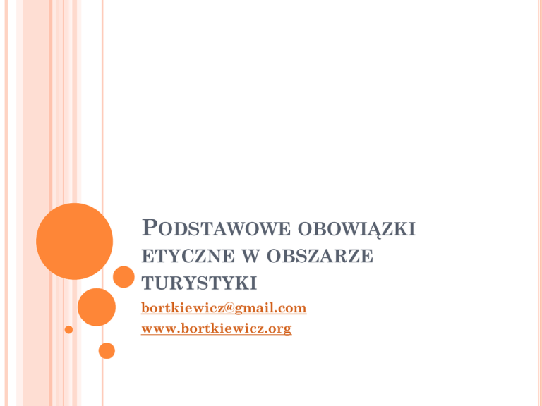 PODSTAWOWE OBOWIĄZKI ETYCZNE W OBSZARZE TURYSTYKI [email protected] www.bortkiewicz.org OBOWIĄZKI ETYCZNE TURYSTY WOBEC SAMEGO SIEBIE OBOWIĄZKI ETYCZNE TURYSTY WOBEC SAMEGO SIEBIE ŚWIADOMIE POZNAWAĆ jednym z podstawowych obowiązków moralnych człowieka jest poznawanie i coraz lepsze rozumienie otaczającego świata i siebie przebywając w określonych miejscach — turysta ma (mniejszą lub większą) możliwość poznania mieszkańców, ich zwyczajów i kultury, a także osobliwości przyrody. OBOWIĄZKI ETYCZNE TURYSTY WOBEC SAMEGO SIEBIE ŚWIADOMIE POZNAWAĆ możliwie najlepsze wykorzystanie tej szansy staje się obowiązkiem moralnym turysty wybrać najważniejsze, zrozumieć to, co się poznaje zrozumieć sposób myślenia mieszkańców odwiedzanych terenów, ich system wartości, to co stanowi dla nich Sacrum, ich normy moralne i obyczaje to, co odmienne od naszych przekonań, czy zwyczajów, ale i to, co podobne, może nawet identyczne, chociaż w inną ujęte formę. świadomie dokonywać wyboru tego, co chcemy przede wszystkim poznać, zrozumieć, nie kierując się jedynie sugestią treści przewodników OBOWIĄZKI ETYCZNE TURYSTY WOBEC SAMEGO SIEBIE ŚWIADOMIE POZNAWAĆ wysiłek poznania i zrozumienia można traktować jako obowiązek etyczny odpowiednie i wcześniejsze przygotowanie = wcześniejsza wstępna wiedza o regionie czy kraju, do którego się udajemy. OBOWIĄZKI ETYCZNE TURYSTY WOBEC SAMEGO SIEBIE ŚWIADOMIE POZNAWAĆ turysta może wiele nauczyć się od ludności miejscowej, może i powinien uważnie słuchać i obserwować zapoznać się lokalnymi zwyczajami wykorzystać możliwość dialogu z mieszkańcami terenów odwiedzanych OBOWIĄZKI ETYCZNE TURYSTY WOBEC SAMEGO SIEBIE ŚWIADOMIE POZNAWAĆ Wyjazd turystyczny – wypoczynkowy/pielgrzymkowy = okazja do głębszej refleksji, do kontemplacji nawet człowiek wierzący będzie próbował - dostrzec oblicze Boga lepsze poznanie samego siebie „odkrycie samego siebie” OBOWIĄZKI ETYCZNE TURYSTY WOBEC SAMEGO SIEBIE WŁAŚCIWIE KORZYSTAĆ Z WOLNOŚCI wyjazd turystyczny - kojarzony z pewnego rodzaju wolnością od reguł życia codziennego i od kontroli, jakiej jesteśmy poddawani, w miejscu stałego zamieszkania Z tej wolności można korzystać do pewnych granic - pozostawać wiernym swoim wartościom; „wewnątrz — sterowność” w sposób niemal nieograniczony = wolność „od” „zewnątrz — sterowność” Por. poczucie zwolnienia od obowiązku wierności w stosunku do najbliższych OBOWIĄZKI ETYCZNE TURYSTY WOBEC SAMEGO SIEBIE WŁAŚCIWIE KORZYSTAĆ Z WOLNOŚCI turystyka „seksualna” - szczególnie tragiczna w przypadku seksualnego wykorzystania dzieci tzw. „turystyka aborcyjna” turysta – jest w trakcie wyjazdu postrzegany przez mieszkańców, a także przez towarzyszy podróży jako „reprezentant” określonego narodu na podstawie jego zachowania często urabia się opinię o całym narodzie „Pijany jak Polak” odpowiedzialność za to, jaki pozostawimy obraz Polaka OBOWIĄZKI ETYCZNE TURYSTY WOBEC SAMEGO SIEBIE ROZUMNIE WYPOCZYWAĆ Wyjazd turystyczny regeneracja sił fizycznych i psychicznych, poprawie stanu zdrowia wykorzystanie tego w sposób właściwy Por. turysta w wyniku określonego trybu życia, nie tylko nie odpoczywa, ale jest bardziej zmęczony niż przed urlopem J. Krippendorf (1984) przypadki „choroby urlopowej”, którą trzeba leczyć w trakcie całego roku pracy, aby wypocząć przed trudami następnego urlopu OBOWIĄZKI ETYCZNE TURYSTY WOBEC SAMEGO SIEBIE WZMACNIAĆ WIĘZI RODZINNE wyjazdy urlopowe są bardzo często- wyjazdami rodzinnymi taki rodzinny wyjazd stanowi znakomitą okazję do większej integracji rodziny bywa bowiem i tak, że każdy z członków wspólnie wyjeżdżającej rodziny, spędzając czas oddzielnie spotykają się ewentualnie przy posiłkach, czy dopiero wieczorem = marnowanie okazji „patologicznym” przypadkiem - doprowadzanie do konfliktów z powodów błahych OBOWIĄZKI ETYCZNE TURYSTY WOBEC SAMEGO SIEBIE PRACOWAĆ TWÓRCZO wyjazd okazją nie tylko do wypoczynku w wielu przypadkach - zwłaszcza w odniesieniu do ludzi wykonujących tzw. „pracę twórczą” – wyjazd stanowić może doskonałą okazję do pracy twórczej obowiązek etyczny wykorzystania, nie zmarnowania tej okazji OBOWIĄZKI ETYCZNE TURYSTY WOBEC MIESZKAŃCÓW OBOWIĄZKI ETYCZNE TURYSTY WOBEC MIESZKAŃCÓW DAWAĆ ŚWIADECTWO turysta jest przez mieszkańców, zwłaszcza młodych, intensywnie obserwowany wpływ na zachowanie mieszkańca zwłaszcza gdy różnica kulturowa jest duża być odpowiedzialnym za słowa i gesty OBOWIĄZKI ETYCZNE TURYSTY WOBEC MIESZKAŃCÓW RESPEKTOWAĆ WARTOŚCI Turysta zwiedza wiele obiektów sakralnych dla niego mogą stanowić jedynie atrakcję turystyczną dla ludności miejscowej są rzeczywistymi przedmiotami kultu W „Annapurna Conservation Arca” - „Nepal jest po to, aby ciebie zmienić, a nie dla ciebie, aby zmienić Nepal”. W „Himalayan Tourist Code”: „Szanuj lokalną tradycję i kulturę. Respektuj miejsca święte, nie zabieraj przedmiotów religijnych. Respektuj zwyczaje (np. używaj tylko prawej ręki do jedzenia i pozdrawiania)” w niektórych krajach takie zachowanie turysty, jak fotografowanie mieszkańców bez ich zgody, czy nawet głośny śmiech turysty w miejscach publicznych lub obnażanie się — mogą obrażać przekonania ludności miejscowej OBOWIĄZKI ETYCZNE TURYSTY WOBEC MIESZKAŃCÓW NIE RANIĆ, NIE ZABIJAĆ FIZYCZNIE ANI MORALNIE turystyka współczesna walnie przyczyniła się do rozpowszechniania narkotyków wśród ludności miejscowej. „turystyka seksualna” j- zorganizowanym i dobrze funkcjonującym przemysłem rozpowszechnianie się zachorowań na AIDS seksualne wykorzystywanie dzieci obojga płci OBOWIĄZKI ETYCZNE TURYSTY WOBEC MIESZKAŃCÓW NIE RANIĆ, NIE ZABIJAĆ FIZYCZNIE ANI MORALNIE mieszkańców terenów odwiedzanych – traktować podmiotowo, a nie przedmiotowo nie wolno