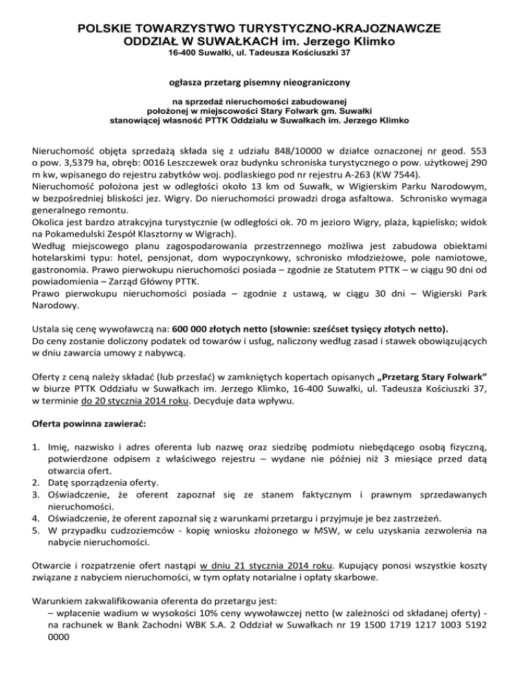POLSKIE TOWARZYSTWO TURYSTYCZNO-KRAJOZNAWCZE ODDZIAŁ W SUWAŁKACH im. Jerzego Klimko 16-400 Suwałki, ul. Tadeusza Kościuszki 37 ogłasza przetarg pisemny nieograniczony na sprzedaż nieruchomości zabudowanej położonej w miejscowości Stary Folwark gm. Suwałki stanowiącej własność PTTK Oddziału w Suwałkach im. Jerzego Klimko Nieruchomość objęta sprzedażą składa się z udziału 848/10000 w działce oznaczonej nr geod. 553 o pow. 3,5379 ha, obręb: 0016 Leszczewek oraz budynku schroniska turystycznego o pow. użytkowej 290 m kw, wpisanego do rejestru zabytków woj. podlaskiego pod nr rejestru A-263 (KW 7544). Nieruchomość położona jest w odległości około 13 km od Suwałk, w Wigierskim Parku Narodowym, w bezpośredniej bliskości jez. Wigry. Do nieruchomości prowadzi droga asfaltowa. Schronisko wymaga generalnego remontu. Okolica jest bardzo atrakcyjna turystycznie (w odległości ok. 70 m jezioro Wigry, plaża, kąpielisko; widok na Pokamedulski Zespół Klasztorny w Wigrach). Według miejscowego planu zagospodarowania przestrzennego możliwa jest zabudowa obiektami hotelarskimi typu: hotel, pensjonat, dom wypoczynkowy, schronisko młodzieżowe, pole namiotowe, gastronomia. Prawo pierwokupu nieruchomości posiada – zgodnie ze Statutem PTTK – w ciągu 90 dni od powiadomienia – Zarząd Główny PTTK. Prawo pierwokupu nieruchomości posiada – zgodnie z ustawą, w ciągu 30 dni – Wigierski Park Narodowy. Ustala się cenę wywoławczą na: 600 000 złotych netto (słownie: sześćset tysięcy złotych netto). Do ceny zostanie doliczony podatek od towarów i usług, naliczony według zasad i stawek obowiązujących w dniu zawarcia umowy z nabywcą. Oferty z ceną należy składać (lub przesłać) w zamkniętych kopertach opisanych „Przetarg Stary Folwark” w biurze PTTK Oddziału w Suwałkach im. Jerzego Klimko, 16-400 Suwałki, ul. Tadeusza Kościuszki 37, w terminie do 20 stycznia 2014 roku. Decyduje data wpływu. Oferta powinna zawierać: 1. Imię, nazwisko i adres oferenta lub nazwę oraz siedzibę podmiotu niebędącego osobą fizyczną, potwierdzone odpisem z właściwego rejestru – wydane nie później niż 3 miesiące przed datą otwarcia ofert. 2. Datę sporządzenia oferty. 3. Oświadczenie, że oferent zapoznał się ze stanem faktycznym i prawnym sprzedawanych nieruchomości. 4. Oświadczenie, że oferent zapoznał się z warunkami przetargu i przyjmuje je bez zastrzeżeń. 5. W przypadku cudzoziemców - kopię wniosku złożonego w MSW, w celu uzyskania zezwolenia na nabycie nieruchomości. Otwarcie i rozpatrzenie ofert nastąpi w dniu 21 stycznia 2014 roku. Kupujący ponosi wszystkie koszty związane z nabyciem nieruchomości, w tym opłaty notarialne i opłaty skarbowe. Warunkiem zakwalifikowania oferenta do przetargu jest: – wpłacenie wadium w wysokości 10% ceny wywoławczej netto (w zależności od składanej oferty) na rachunek w Bank Zachodni WBK S.A. 2 Oddział w Suwałkach nr 19 1500 1719 1217 1003 5192 0000 przy czym najpóźniej w dniu poprzedzającym otwarcie ofert pieniądze muszą faktycznie wpłynąć na podany rachunek. Wpłacone wadium podlega: – zaliczaniu na poczet ceny nabycia nieruchomości w przypadku wygrania przetargu, – przepadkowi w razie uchylenia się uczestnika, który wygrał przetarg od zawarcia umowy notarialnej, w terminie określonym przez organizatora przetargu, – przepadkowi w razie nie uzyskania zezwolenia MSW na zakup nieruchomości przez cudzoziemca w terminie ustawowym, – zwrotowi uczestnikom, którzy przetargu nie wygrają (wadium zwraca się niezwłocznie, jednak nie później niż przed upływem 3 dni od dnia: odwołania przetargu, zamknięcia przetargu, unieważnienia przetargu, zakończenia przetargu wynikiem negatywnym). Uczestnik przetargu, którego oferta zostanie przyjęta zobowiązany jest do dokonania pełnej wpłaty oferowanej w przetargu kwoty, nie później niż na dzień przed dniem podpisania notarialnej umowy o nabycie (pieniądze muszą wpłynąć na konto PTTK Oddział w Suwałkach im. J. Klimko). Niedopełnienie tego obowiązku uprawnia PTTK Oddział w Suwałkach im. J. Klimko do sprzedaży nieruchomości kolejnym oferentom. PTTK Oddział w Suwałkach im. J. Klimko zastrzega sobie prawo do unieważnienia przetargu bez wyboru oferty, bez podania przyczyn i bez ponoszenia jakichkolwiek skutków prawnych i finansowych tego unieważnienia. Dodatkowych informacji w sprawie przetargu oraz możliwości obejrzenia przeznaczonej do sprzedaży nieruchomości udzielają pracownicy biura Oddziału PTTK w Suwałkach im. J. Klimko ul. T. Kościuszki 37, tel. 87 566 59 61, 603 093 723, e-mail: [email protected].