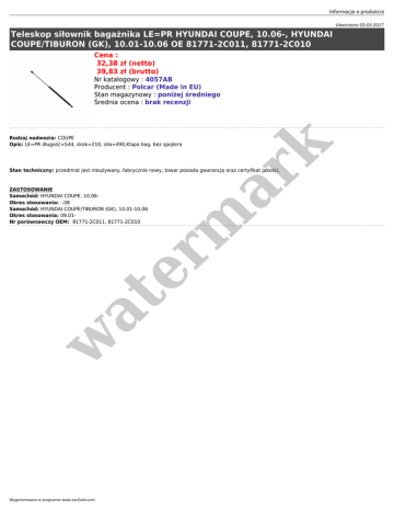Informacje o produkcie Utworzono 03-03-2017 Teleskop siłownik bagażnika LE=PR HYUNDAI COUPE, 10.06-, HYUNDAI COUPE/TIBURON (GK), 10.01-10.06 OE 81771-2C011, 81771-2C010 Cena : 32,38 zł (netto) 39,83 zł (brutto) Nr katalogowy : 4057AB Producent : Polcar (Made in EU) Stan magazynowy : poniżej średniego Średnia ocena : brak recenzji er m ar k Rodzaj nadwozia: COUPE Opis: LE=PR długość=544, skok=210, siła=490,Klapa bag. bez spojlera Stan techniczny: przedmiot jest nieużywany, fabrycznie nowy, towar posiada gwarancję oraz certyfikat jakości. w at ZASTOSOWANIE Samochód: HYUNDAI COUPE, 10.06Okres stosowania: -.08 Samochód: HYUNDAI COUPE/TIBURON (GK), 10.01-10.06 Okres stosowania: 09.01Nr porównawczy OEM: 81771-2C011, 81771-2C010 Wygenerowano w programie www.oscGold.com