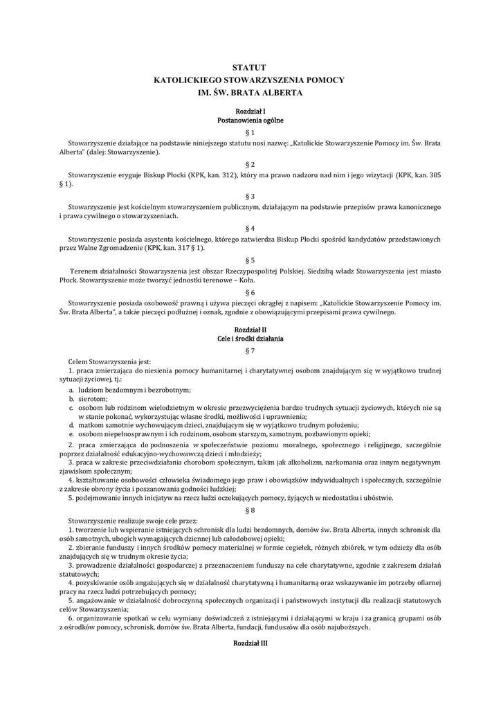 STATUT KATOLICKIEGO STOWARZYSZENIA POMOCY IM. ŚW. BRATA ALBERTA Rozdział I Postanowienia ogólne §1 Stowarzyszenie działające na podstawie niniejszego statutu nosi nazwę: „Katolickie Stowarzyszenie Pomocy im. Św. Brata Alberta” (dalej: Stowarzyszenie). §2 Stowarzyszenie eryguje Biskup Płocki (KPK, kan. 312), który ma prawo nadzoru nad nim i jego wizytacji (KPK, kan. 305 § 1). §3 Stowarzyszenie jest kościelnym stowarzyszeniem publicznym, działającym na podstawie przepisów prawa kanonicznego i prawa cywilnego o stowarzyszeniach. §4 Stowarzyszenie posiada asystenta kościelnego, którego zatwierdza Biskup Płocki spośród kandydatów przedstawionych przez Walne Zgromadzenie (KPK, kan. 317 § 1). §5 Terenem działalności Stowarzyszenia jest obszar Rzeczypospolitej Polskiej. Siedzibą władz Stowarzyszenia jest miasto Płock. Stowarzyszenie może tworzyć jednostki terenowe – Koła. §6 Stowarzyszenie posiada osobowość prawną i używa pieczęci okrągłej z napisem: „Katolickie Stowarzyszenie Pomocy im. Św. Brata Alberta”, a także pieczęci podłużnej i oznak, zgodnie z obowiązującymi przepisami prawa cywilnego. Rozdział II Cele i środki działania §7 Celem Stowarzyszenia jest: 1. praca zmierzająca do niesienia pomocy humanitarnej i charytatywnej osobom znajdującym się w wyjątkowo trudnej sytuacji życiowej, tj.: a. ludziom bezdomnym i bezrobotnym; b. sierotom; c. osobom lub rodzinom wielodzietnym w okresie przezwyciężenia bardzo trudnych sytuacji życiowych, których nie są w stanie pokonać, wykorzystując własne środki, możliwości i uprawnienia; d. matkom samotnie wychowującym dzieci, znajdującym się w wyjątkowo trudnym położeniu; e. osobom niepełnosprawnym i ich rodzinom, osobom starszym, samotnym, pozbawionym opieki; 2. praca zmierzająca do podnoszenia w społeczeństwie poziomu moralnego, społecznego i religijnego, szczególnie poprzez działalność edukacyjno-wychowawczą dzieci i młodzieży; 3. praca w zakresie przeciwdziałania chorobom społecznym, takim jak alkoholizm, narkomania oraz innym negatywnym zjawiskom społecznym; 4. kształtowanie osobowości człowieka świadomego jego praw i obowiązków indywidualnych i społecznych, szczególnie z zakresie obrony życia i poszanowania godności ludzkiej; 5. podejmowanie innych inicjatyw na rzecz ludzi oczekujących pomocy, żyjących w niedostatku i ubóstwie. §8 Stowarzyszenie realizuje swoje cele przez: 1. tworzenie lub wspieranie istniejących schronisk dla ludzi bezdomnych, domów św. Brata Alberta, innych schronisk dla osób samotnych, ubogich wymagających dziennej lub całodobowej opieki; 2. zbieranie funduszy i innych środków pomocy materialnej w formie cegiełek, różnych zbiórek, w tym odzieży dla osób znajdujących się w trudnym okresie życia; 3. prowadzenie działalności gospodarczej z przeznaczeniem funduszy na cele charytatywne, zgodnie z zakresem działań statutowych; 4. pozyskiwanie osób angażujących się w działalność charytatywną i humanitarną oraz wskazywanie im potrzeby ofiarnej pracy na rzecz ludzi potrzebujących pomocy; 5. angażowanie w działalność dobroczynną społecznych organizacji i państwowych instytucji dla realizacji statutowych celów Stowarzyszenia; 6. organizowanie spotkań w celu wymiany doświadczeń z istniejącymi i działającymi w kraju i za granicą grupami osób z ośrodków pomocy, schronisk, domów św. Brata Alberta, fundacji, funduszów dla osób najuboższych. Rozdział III Członkowie, ich prawa i obowiązki §9 Członkowie Stowarzyszenia dzielą się na: 1. zwyczajnych; 2. wspierających; 3. honorowych. § 10 Członkiem zwyczajnym Stowarzyszenia może być każda osoba pełnoletnia, która złoży wypełnioną deklarację członkowską i zostanie przyjęta przez Zarząd. § 11 Członek zwyczajny ma prawo: 1. wybierać i być wybieranym do władz Stowarzyszenia; 2. uczestniczyć z głosem stanowczym w Walnym Zgromadzeniu, zgłaszać wnioski i postulaty, dotyczące działalności Stowarzyszenia; 3. korzystać z pomocy Stowarzyszenia. § 12 Do obowiązków członka zwyczajnego należy: 1. przestrzeganie postanowień statutu, regulaminów i uchwał Stowarzyszenia; 2. czynne uczestnictwo w realizacji celów statutowych Stowarzyszenia; 3. regularne opłacanie składek członkowskich. § 13 Członkiem wspierającym Stowarzyszenia może zostać osoba fizycznie prawna zainteresowana działalnością Stowarzyszenia, która deklaruje pomoc finansową lub rzeczową i zostanie przyjęta przez Zarząd na podstawie pisemnej deklaracji. Członek wspierający posiada prawo, określone w § 11 pkt 3. Może także uczestniczyć w Walnym Zgromadzeniu z głosem doradczym. Członek wspierający, jeśli jest osobą prawną, działa w Stowarzyszeniu za pośrednictwem swego przedstawiciela. § 14 Członkiem honorowym Stowarzyszenia może zostać osoba fizyczna, zasłużona w realizacji celów statutowych Stowarzyszenia. Członkostwo honorowe nadaje Walne Zgromadzenie na wniosek Zarządu. Członek honorowy posiada wszystkie prawa i obowiązki członka zwyczajnego, z wyjątkiem obowiązku płacenia składek członkowskich. § 15 Członkostwo w Stowarzyszeniu ustaje na skutek: 1. dobrowolnego wystąpienia, zgłoszonego na piśmie do Zarządu; 2. skreślenia przez Zarząd z powodu niepłacenia składek członkowskich przez okres trzech miesięcy, po uprzednim upomnieniu; 3. wykluczenia uchwałą Zarządu z powodu nieprzestrzegania postanowień statutu, regulaminów, uchwał władz Stowarzyszenia lub działania na szkodę Stowarzyszenia oraz publicznego odstąpienia od wiary katolickiej (KPK, kan. 316 § 1-2); 4. utraty osobowości prawnej przez członka wspierającego osobą prawną. Od uchwały w przedmiocie skreślenia lub wykluczenia przysługuje odwołanie w terminie 30 dni od Walnego Zgromadzenia, którego uchwała jest ostateczna. Rozdział IV § 16 Władzami Stowarzyszenia są: 1. Walne Zgromadzenie; 2. Zarząd; 3. Komis