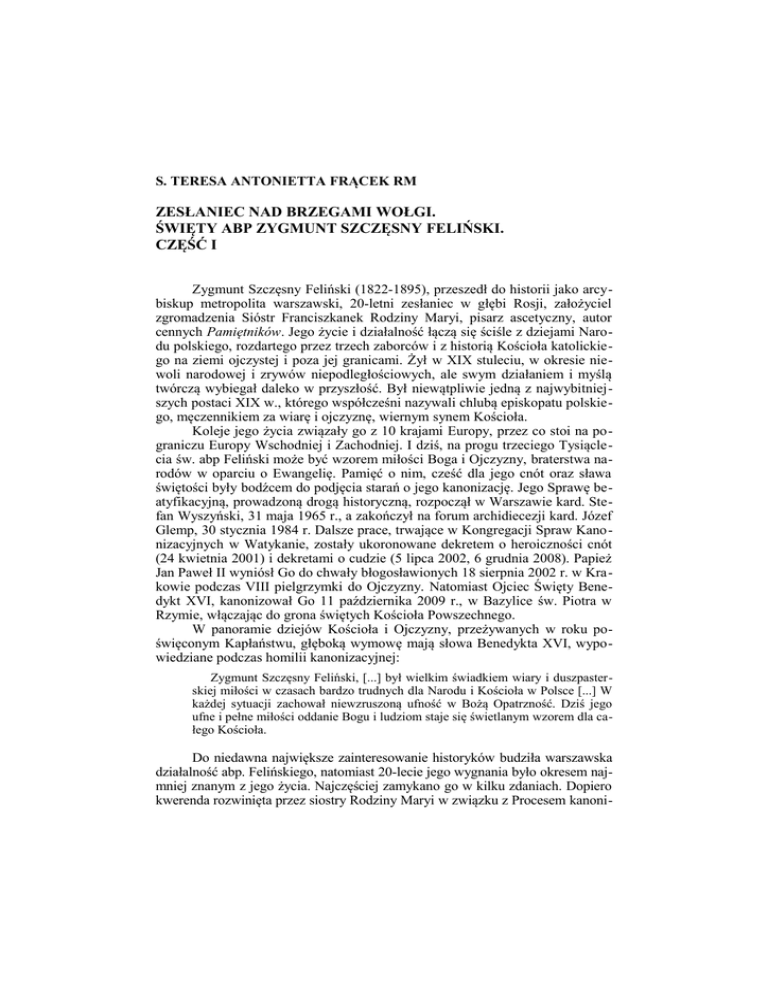 S. TERESA ANTONIETTA FRĄCEK RM ZESŁANIEC NAD BRZEGAMI WOŁGI. ŚWIĘTY ABP ZYGMUNT SZCZĘSNY FELIŃSKI. CZĘŚĆ I Zygmunt Szczęsny Feliński (1822-1895), przeszedł do historii jako arcybiskup metropolita warszawski, 20-letni zesłaniec w głębi Rosji, założyciel zgromadzenia Sióstr Franciszkanek Rodziny Maryi, pisarz ascetyczny, autor cennych Pamiętników. Jego życie i działalność łączą się ściśle z dziejami Narodu polskiego, rozdartego przez trzech zaborców i z historią Kościoła katolickiego na ziemi ojczystej i poza jej granicami. Żył w XIX stuleciu, w okresie niewoli narodowej i zrywów niepodległościowych, ale swym działaniem i myślą twórczą wybiegał daleko w przyszłość. Był niewątpliwie jedną z najwybitniejszych postaci XIX w., którego współcześni nazywali chlubą episkopatu polskiego, męczennikiem za wiarę i ojczyznę, wiernym synem Kościoła. Koleje jego życia związały go z 10 krajami Europy, przez co stoi na pograniczu Europy Wschodniej i Zachodniej. I dziś, na progu trzeciego Tysiąclecia św. abp Feliński może być wzorem miłości Boga i Ojczyzny, braterstwa narodów w oparciu o Ewangelię. Pamięć o nim, cześć dla jego cnót oraz sława świętości były bodźcem do podjęcia starań o jego kanonizację. Jego Sprawę beatyfikacyjną, prowadzoną drogą historyczną, rozpoczął w Warszawie kard. Stefan Wyszyński, 31 maja 1965 r., a zakończył na forum archidiecezji kard. Józef Glemp, 30 stycznia 1984 r. Dalsze prace, trwające w Kongregacji Spraw Kanonizacyjnych w Watykanie, zostały ukoronowane dekretem o heroiczności cnót (24 kwietnia 2001) i dekretami o cudzie (5 lipca 2002, 6 grudnia 2008). Papież Jan Paweł II wyniósł Go do chwały błogosławionych 18 sierpnia 2002 r. w Krakowie podczas VIII pielgrzymki do Ojczyzny. Natomiast Ojciec Święty Benedykt XVI, kanonizował Go 11 października 2009 r., w Bazylice św. Piotra w Rzymie, włączając do grona świętych Kościoła Powszechnego. W panoramie dziejów Kościoła i Ojczyzny, przeżywanych w roku poświęconym Kapłaństwu, głęboką wymowę mają słowa Benedykta XVI, wypowiedziane podczas homilii kanonizacyjnej: Zygmunt Szczęsny Feliński, [...] był wielkim świadkiem wiary i duszpasterskiej miłości w czasach bardzo trudnych dla Narodu i Kościoła w Polsce [...] W każdej sytuacji zachował niewzruszoną ufność w Bożą Opatrzność. Dziś jego ufne i pełne miłości oddanie Bogu i ludziom staje się świetlanym wzorem dla całego Kościoła. Do niedawna największe zainteresowanie historyków budziła warszawska działalność abp. Felińskiego, natomiast 20-lecie jego wygnania było okresem najmniej znanym z jego życia. Najczęściej zamykano go w kilku zdaniach. Dopiero kwerenda rozwinięta przez siostry Rodziny Maryi w związku z Procesem kanoni- zacyjnym ich Założyciela przyniosła rewelacyjne odkrycia. 1 O bogactwie posiadanych obecnie materiałów z okresu 20-letniego wygnania świadczą następujące dane: 170 listów abp. Felińskiego, prywatnych i urzędowych w większości autografy; 2 urywki z jego Pamiętników, pisanych na wygnaniu; 142 dokumenty Stolicy Apostolskiej, w tym 2 allokucje i 2 encykliki (1864-1867) Piusa IX oraz Memoriał mons. Symeoni do kanclerza Rosji Al. Gorczakowa, korespondencja sekretarza stanu i nuncjusza wiedeńskiego wraz z urzędowymi relacjami Kongregacji Nadzwyczajnych Spraw Kościoła (AA.EE.SS.), obejmująca około 40 pism; 101 listów biskupów, księży i świeckich oraz relacji bezimiennych, skierowanych do Stolicy Apostolskiej, obfita dokumentacja z rozmów prowadzonych za Leona XIII przez przedstawicieli Rosji i Watykanu w Wiedniu i Rzymie (1879-1882), które doprowadziły do podpisania porozumienia i uwolnienia abp. Felińskiego z wygnania w 1883 r. Ponadto zespół ten wzbogacają różne dokumenty przechowywane w Państwowym Archiwum Historycznym Rosji: w Jarosławiu, Moskwie, a zwłaszcza w Petersburgu; wśród nich znajduje się urzędowa korespondencja cesarza Aleksandra II, namiestnika Królestwa Polskiego, departamentu wyznań w Ministerstwie Spraw Wewnętrznych, wydziału kultu w komisji Wyznań Religijnych i Oświecenia Publicznego (WR i OP), a następnie departamentu wyznań, pisma i raporty gubernatora i policji Jarosławia; w tej grupie dokumentów znajdują się także listy abp. Felińskiego skierowane do władz w Petersburgu, do pełnomocników w Warszawie, do gubernatora Jarosławia i tamtejszej policji. Cenne materiały historyczne dotyczące zesłanego arcybiskupa znajdują się również w Archiwum Akt Dawnych (AGAD) w Warszawie w zbiorach: „Centralne władze wyznaniowe w Królestwie Polskim”, w dwóch woluminach: „Fundusze arcybiskupa warszawskiego”, sygn. 278 279 i „Rada Administracyjna Królestwa Polskiego” oraz „Szczątkowe akta powstania styczniowego”. Korespondencja prywatna, przechowywana w bibliotekach państwowych, kościelnych i prywatnych dostarcza obfitych drobnych informacji i opinii różnych osób o zesłanym arcybiskupie; wzmianki o nim znajdują się w 20 pamiętnikach i wspomnieniach różnych osób; uzupełniają te materiały artykuły i notatki kronikarskie zamieszczone w prasie polskiej i zagranicznej. 2 W niniejszym artykule zwrócono główną uwagę na zesłanie abp. Felińskiego, poprzedzając go syntetycznym szkicem o jego życiu i pracy, poczynając od domu rodzinnego, poprzez studia i podróże na Wschodzie i na Zachodzie, ukazując jego działalność jako kapłana w Petersburgu i arcybiskupa w Warszawie, a kończąc na ostatnich latach życia, które spędził w Dźwiniaczce na Podolu. Mając do dyspozycji duży zbiór dokumentów, wzbogaconych przez łatwiej1 Hieronim Eug. Wyczawski OFM, Arcybiskup Zygmunt Szczęsny Feliński 18221895, Warszawa 1986, dalej cytujemy: Wyczawski, Arcybiskup... 2 Dokumentacja zebrana podczas kwerendy w archiwach i bibliotekach krajowych i zagranicznych, przechowywana jest w Archiwum Głównym Zgro