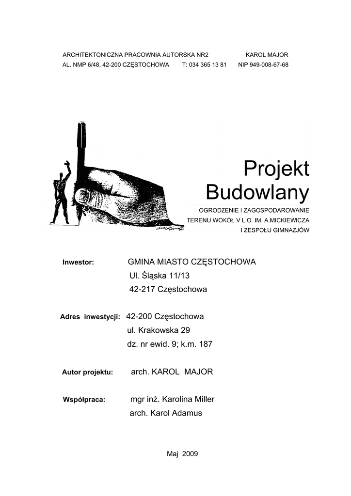 ARCHITEKTONICZNA PRACOWNIA AUTORSKA NR2 AL. NMP 6/48, 42-200 CZĘSTOCHOWA Inwestor: T: 034 365 13 81 KAROL MAJOR NIP 949-008-67-68 GMINA MIASTO CZĘSTOCHOWA Ul. Śląska 11/13 42-217 Częstochowa Adres inwestycji: 42-200 Częstochowa ul. Krakowska 29 dz. nr ewid. 9; k.m. 187 Autor projektu: arch. KAROL MAJOR Współpraca: mgr inż. Karolina Miller arch. Karol Adamus Maj 2009 Projekt ogrodzenia oraz zagospodarowania terenu strona 2 ZAWARTOŚĆ OPRACOWANIA: PROJEKT ZAGOSPODAROWANIA TERENU • Opis projektu zagospodarowania działki • Część rysunkowa projektu: 1. Projekt zagospodarowania działki 1:500................................................PZT-1 PROJEKT OGRODZENIA - CZĘŚĆ ARCHITEKTONICZNA • Opis techniczny projektu budowlanego • Część rysunkowa projektu: 1. Rzut fundamentów 1:200.................................................................................1 2. Rzut ogrodzenia i zagospodarowanie terenu 1:200..........................................2 3. Elewacje 1:100.................................................................................................3 4. Przekroje poprzeczne przez drogi wewnętrzne i chodniki 1:25........................4 5. Przekrój A – A 1:200.........................................................................................5 PROJEKT OGRODZENIA - CZĘŚĆ KONSTRUKCYJNA • Opis techniczny projektu budowlanego • Część rysunkowa projektu: 1. Przęsła typowe nr1, nr5 i nr10 – zbrojenie 1:50,1:25…................................K-1 2. Przęsła typowe nr2-nr4 i nr9 – zbrojenie 1:50,1:25…...................................K-2 3. Przęsło typowe nr6 – zbrojenie 1:50,1:25,1:10......…...................................K-3 4. Przęsło typowe nr7 i nr8 – zbrojenie 1:50,1:25….........................................K-4 5. Przęsła typowe nr11-nr13 – zbrojenie 1:50,1:25….......................................K-5 6. Narożnik – zbrojenie 1:50,1:25,1:10......…...................................................K-6 7. Słupek nr1 – zbrojenie 1:50,1:25,1:10......…................................................K-7 8. Słupek nr2 – zbrojenie 1:50,1:25,1:10......…................................................K-8 9. Część wjazdowa ogrodzenia od ul.Krakowskiej – zbrojenie1:50,1:25 1:10....K-9 10. Część wejściowa ogrodzenia – zbrojenie1:50,1:25 1:10............................K-10 Architektoniczna Pracownia Autorska Nr 2 - Częstochowa 2009 Projekt ogrodzenia oraz zagospodarowania terenu strona 3 11. Schody nr1 – zbrojenie 1:50,1:25,1:10.....…..............................................K-11 12. Schody nr2 – zbrojenie 1:50,1:25,1:10.....…..............................................K-12 13. Przęsła typowe 1:20,1:5…..........................................................................K-13 14. Przęsło typowe nr6 i nr7 1:20,1:5…............................................................K-14 15. Element dekoracyjny D1 i D2 1:20,1:5…....................................................K-15 16. Element dekoracyjny D3 i D4 1:20,1:5…....................................................K-16 17. Brama przesuwna B1 1:20,1:5…................................................................K-17 18. Brama B2, furtka F1 i F2 1:20,1:5…...........................................................K-18 19. Barierka Br1 i Br2 1:20,1:5…......................................................................K-19 • Załączniki: 1. Zestawienie stali zbrojeniowej do rys. K-1…....................….........................Z-1 2. Zestawienie stali zbrojeniowej do rys. K-2…....................…...........…...........Z-2 3. Zestawienie stali zbrojeniowej do rys. K-3…....................…...........…...........Z-3 4. Zestawienie stali zbrojeniowej do rys. K-4…....................…...........…...........Z-4 5. Zestawienie stali zbrojeniowej do rys. K-5…....................…...........…...........Z-5 6. Zestawienie stali zbrojeniowej do rys. K-6…....................…...........…...........Z-6 7. Zestawienie stali zbrojeniowej do rys. K-7…....................…...........…...........Z-7 8. Zestawienie stali zbrojeniowej do rys. K-8….................…..............…...........Z-8 9. Zestawienie stali zbrojeniowej do rys. K-9….................…..............…...........Z-9 10. Zestawienie stali zbrojeniowej do rys. K-10….............…..............…...........Z-10 11. Zestawienie stali zbrojeniowej do rys. K-11…................…...........…...........Z-11 12. Zestawienie stali zbrojeniowej do rys. K-12…................…...........…...........Z-12 13. Zestawienie stali zbrojeniowej do rys. K-13…...................…........…...........Z-13 14. Zestawienie stali zbrojeniowej do rys. K-14….................…..........…...........Z-14 15. Zestawienie stali zbrojeniowej do rys. K-15….............…..............…...........Z-15 16. Zestawienie stali zbrojeniowej do rys. K-16….............…..............…...........Z-16 17. Zestawienie stali zbrojeniowej do rys. K-17…................…...........…...........Z-17 18. Zestawienie stali zbrojeniowej do rys. K-18…....................…...........….......Z-18 19. Zestawienie stali zbrojeniowej do rys. K-19…....................…........…..........Z-19 Architektoniczna Pracownia Autorska Nr 2 - Częstochowa 2009 Projekt ogrodzenia oraz zagospodarowania terenu strona 4 Opis PROJEKTU ZAGOSPODAROWANIA DZIAŁKI Inwestor: GMINA MIASTO CZĘSTOCHOWA Ul. Śląska 11/13 42-217 Częstochowa Adres inwestycji: 42-200 Częstochowa ul. Krakowska 29 dz. nr ewid. 9; k.m. 187 Architektoniczna Pracownia Autorska Nr 2 - Częstochowa 2009 Projekt ogrodzenia oraz zagospodarowania terenu strona 5 1. Podstawa opracowania - Zlecenie oraz uzgodnienia z inwestorem; - Mapa sytuacyjno - wysokościowa 1:500; - Wizja lokalna w terenie. 2. Przedmiot i zakres opracowania Przedmiotem opraco