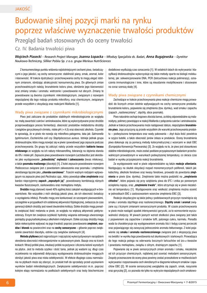 Jakość Budowanie silnej pozycji marki na rynku poprzez właściwe wyznaczenie trwałości produktów Przegląd badań stosowanych do oceny trwałości Cz. IV. Badania trwałości piwa Wojciech Piasecki – Research Project Manager, Joanna Łopacka – Młodszy Specjalista ds. Badań, Anna Bugajewska – Dyrektor Naukowo-Techniczny, Silliker Polska Sp. z o.o. grupa Merieux NutriSciences Z konsumenckiego punktu widzenia najistotniejszymi cechami piwa, świadczącymi o jego jakości, są cechy sensoryczne: stabilność piany, smak, aromat, kolor i klarowność. W trakcie dystrybucji i przechowywania cechy te mogą ulegać istotnym zmianom, obniżając atrakcyjność konsumencką piwa. Do głównych zmian przechowalniczych należą: brunatnienie koloru piwa, obniżenie jego klarowności oraz zmiany smaku i aromatu: wietrzenie i powstawanie nut obcych. Zmiany te powodowane są dwoma czynnikami: mikrobiologicznym, związanym z rozwojem niepożądanej dla tego rodzaju produktu mikroflory, oraz chemicznym, związanym przede wszystkim z oksydacją oraz reakcjami Maillarda [1]. Wady piwa związane z czynnikami mikrobiologicznymi Piwo jest zaliczane do produktów stabilnych mikrobiologicznie ze względu na: małą zawartość cukrów i aminokwasów, które są wykorzystywane przez drożdże przeprowadzające proces fermentacji, obecność produktów metabolizmu drożdży i związków goryczkowych chmielu, niskie pH (<4,5) oraz obecność alkoholu. Czynniki te sprawiają, że w piwie nie rozwija się mikroflora patogenna, taka jak: Salmonella typhimurium, Escherichia coli czy Staphylococcus aureus. Istnieje jednak grupa drobnoustrojów, które mogą rozwijać się w piwie i powodować jego zepsucie podczas przechowywania. Do grupy tej zaliczyć należy przede wszystkim bakterie kwasu mlekowego ze względu na ich naturę mikroaerofilną, tolerancję na stężenia etanolu do 6% i niskie pH. Zepsucie piwa powodowane rozwojem Lactobacillus jest określane jako występowanie „jedwabistej” mętności i zakwaszenia (kwas mlekowy), a także posmaku maślanego (diacetyl) [1]. Z kolei zepsucie powodowane rozwojem Pediococcus związane jest z powstaniem zakwaszenia oraz posmaku i zmętnienia określanego łącznie jako „choroba sarcinowa”. Trzecim ważnym rodzajem wpływającym na zepsucie piwa jest Pectinatus spp., który powoduje silne zmętnienie oraz bardzo nieprzyjemny zapach „zepsutych jaj”, powodowany kombinacją różnych kwasów tłuszczowych, siarkowodoru oraz merkaptanu metylu. Drożdże mogą stanowić nawet 40% ogólnej ilości zakażeń występujących w browarnictwie. Nie wszystkie z nich obniżają jakość piwa, ale ich obecność świadczy o wystąpieniu infekcji. Ponadto mogą one konkurować ze szczepami piwowarskimi, szczególnie w przypadkach ich osłabionej aktywności fizjologicznej, zwłaszcza że czas generacji dzikich drożdży jest nawet dwukrotnie krótszy. Dzikie drożdże mogą ponadto zwiększać ilość metanolu w piwie, ze względu na większą aktywność pektynoesterazy. Enzym ten zwiększa szybkość hydrolizy wiązania estrowego utworzonego pomiędzy grupą karboksylową a alkoholem metylowym. Dzikie szczepy drożdży mogą także niekorzystnie wpływać na jego trwałość poprzez powstawanie zmętnień, osadów i błonek na powierzchni oraz na cechy sensoryczne – głównie poprzez zwiększenie zawartości diacetylu, estrów czy związków siarkowych [4]. Metoda płytkowa jest najprostszym i najczęściej wykorzystywanym narzędziem określenia obecności mikroorganizmów w pakowanym piwie. Bazuje ona na trzech krokach: filtracji próbki piwa, inkubacji próbki na pożywce i zliczeniu kolonii wyrosłych na płytce. Jest to metoda szybka i dość tania, jednak jej wadami są: długi czas oczekiwania na odpowiedź dotyczącą występowania drobnoustrojów mogących obniżyć jakość piwa oraz niska selektywność. W efekcie długiego czasu namnażania na płytkach może się zdarzyć, że produkt trafi do sprzedaży przed uzyskaniem wyników badań mikrobiologicznych. Zwiększenie selektywności m.in. poprzez kolejne etapy namnażania na podłożach selektywnych oraz testy biochemiczne 6 dodatkowo wydłużają czas oznaczenia [1]. W ostatnich latach do wykrywania i klasyfikacji drobnoustrojów wykorzystuje się także metody oparte na biologii molekularnej, jak: sekwencjonowanie DNA, PCR (łańcuchowa reakcja polimerazy), oznaczenia immunologiczne i inne, które są nieustannie modyfikowane i stosowane na coraz szerszą skalę [4]. Wady piwa związane z czynnikami chemicznymi Zachodzące w trakcie przechowywania piwa reakcje chemiczne mogą prowadzić do licznych zmian istotnie wpływających na cechy sensoryczne produktu: brunatnienie koloru, pojawienie się zmętnienia (tzw. dymku), wad smaku i zapachu (zapach „nasłoneczniony”, stęchły, obce posmaki). Piwo naturalnie cechuje brązowo-złocista barwa, za którą odpowiedzialne są malanoidyny, polimery powstające w reakcji Maillarda z połączenia cukrów i aminokwasów. Jednak w trakcie przechowywania może następować dalsze, niepożądane brunatnienie piwa. Jego przyczyną są przede wszystkim złe warunki przechowywania produktu – podwyższona temperatura oraz wady pakowania – zbyt duża ilość powietrza w szyjce butelki, a także obecność jonów żelaza w produkcie. Oceny brunatnienia piwa dokonuje się za pomocą metody kolorymetrycznej z wzorcami w skali EBC (Europejska Konwencja Piwowarska) [3]. Ze względu na to, że piwo jest stosunkowo stabilne mikrobiologicznie, może zostać poddane przyspieszonym badaniom przechowalniczym prowadzonym w warunkach podwyższonej temperatury, co skraca czas badań w wyniku przyspieszenia reakcji brunatnienia. Za występowanie wad w piwie odpowiedzialne są także reakcje utleniania. Następujący na skutek oksydacji rozpad monomerycznych polifenoli, takich jak: katechiny, alkohole fenolowe oraz kwasy fenolowe, prowadzi do powstania zmętnienia w p