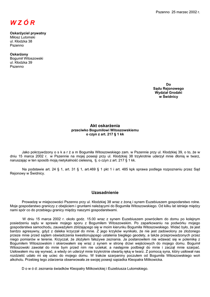 Pszenno 25 marzec 2002 r. WZÓR Oskarżyciel prywatny Miłosz Lutomski ul. Kłodzka 38 Pszenno Oskarżony Bogumił Witoszowski ul. Kłodzka 39 Pszenno Do Sądu Rejonowego Wydział Grodzki w Świdnicy Akt oskarżenia przeciwko Bogumiłowi Witoszowskiemu o czyn z art. 217 § 1 kk Jako pokrzywdzony o s k a r ż a m Bogumiła Witoszowskiego zam. w Pszennie przy ul. Kłodzkiej 39, o to, że w dniu 15 marca 2002 r. w Pszennie na mojej posesji przy ul. Kłodzkiej 38 trzykrotnie uderzył mnie dłonią w twarz, naruszając w ten sposób moją nietykalność cielesną, tj. o czyn z art. 217 § 1 kk. Na podstawie art. 24 § 1, art. 31 § 1, art.469 § 1 pkt 1 i art. 485 kpk sprawa podlega rozpoznaniu przez Sąd Rejonowy w Świdnicy. Uzasadnienie Prowadzę w miejscowości Pszenno przy ul. Kłodzkiej 38 wraz z żoną i synem Euzebiuszem gospodarstwo rolne. Moje gospodarstwo graniczy z obejściem i gruntami należącymi do Bogumiła Witoszowskiego. Od kilku lat istnieje między nami spór co do przebiegu granicy między naszymi gospodarstwami. W dniu 15 marca 2002 r. około godz. 15.00 wraz z synem Euzebiuszem powróciłem do domu po kolejnym posiedzeniu sądu w sprawie mojego sporu z Bogumiłem Witoszowskim. Po zaparkowaniu na podwórku mojego gospodarstwa samochodu, zauważyłem zbliżającego się w moim kierunku Bogumiła Witoszowskiego. Widać było, że jest bardzo agresywny, gdyż z daleka krzyczał do mnie. Z jego krzyków wynikało, że nie jest zadowolony ze złożonego przeze mnie przed sądem oświadczenia kwestionującego ustalenia biegłego geodety, a także przeprowadzonych przez niego pomiarów w terenie. Krzyczał, że złożyłem fałszywe zeznania. Ja postanowiłem nie wdawać się w polemikę z Bogumiłem Witoszowskim i skierowałem się wraz z synem w stronę drzwi wejściowych do mojego domu. Bogumił Witoszowski zawołał do mnie bym przed nim nie uciekał, a następnie podbiegł do mnie i zaczął mnie szarpać. Usiłowałem mu się wyrwać, a wtedy on uderzył mnie trzykrotnie otwartą ręką w twarz. Z pomocą syna, który usiłował nas rozdzielić udało mi się uciec do mojego domu. W trakcie szarpaniny poczułem od Bogumiła Witoszowskiego woń alkoholu. Przebieg tego zdarzenia obserwowała ze swojej posesji sąsiadka Kleopatra Milikowicka. D o w ó d: zeznania świadków Kleopatry Milikowickiej i Euzebiusza Lutomskiego. Tego samego dnia w godzinach wieczornych Bogumił Witoszowski przebywał w restauracji „Pod Lutym Turem” w Pszennie, gdzie opowiadał w jaki sposób się ze mną rozprawił. Świadkiem tego była barmanka w tym lokalu Danuta Spychowska. D o w ó d: zeznanie świadka Danuty Spychowskiej. Trzykrotne uderzenie w twarz stanowi naruszenie nietykalności cielesnej i wyczerpuje znamiona przestępstwa określonego w art. 217 § 1 kk. Miłosz Lutomski Załączniki: 1. lista osób wnioskowanych do wezwania na rozprawę: a) oskarżony: Bogumił Witoszowski zam. Pszenno ul. Kłodzka 39, b) oskarżyciel prywatny: Miłosz Lutomski zam. Pszenno ul. Kłodzka 38, c) świadkowie: Euzebiusz Lutomski zam. Pszenno ul. Kłodzka 38, Kleopatra Milikowicka zam. Pszenno ul. Kłodzka 37, Danuta Spychowska zam. Pszenno ul. Marcinowicka 6, 2. dowód wpłacenia do kasy sądu zryczałtowanej równowartości wydatków. DODATKOWE INFORMACJE 1. Podmiotem uprawnionym do wniesienia prywatnego aktu oskarżenia jest pokrzywdzony 2. Prywatny akt oskarżenia powinien spełniać ogólne warunki pisma procesowego określone w art. 119 § 1 kpk. Zgodnie z treścią art. 487 kpk akt oskarżenia może ograniczyć się do wskazania osoby oskarżonego, zarzucanego mu czynu oraz wskazania dowodów, na których opiera się oskarżenie. 3. Wniesienie prywatnego aktu oskarżenia wymaga wpłacenia do kasy sądu zryczałtowanej równowartości wydatków (art. 621 § 1 kpk) 4. Termin przedawnienia przestępstwa ściganego w trybie prywatnoskargowym określony został w art. 101 § 2 kk., wedle którego to przepisu, karalność takiego przestępstwa ustaje z upływem roku od czasu, gdy pokrzywdzony dowiedział się o osobie sprawcy przestępstwa, nie później jednak niż z upływem 3 lat od czasu jego popełnienia. 5. Skutkiem wniesienia prywatnego aktu oskarżenia jest rozpoznanie przez sąd sprawy.