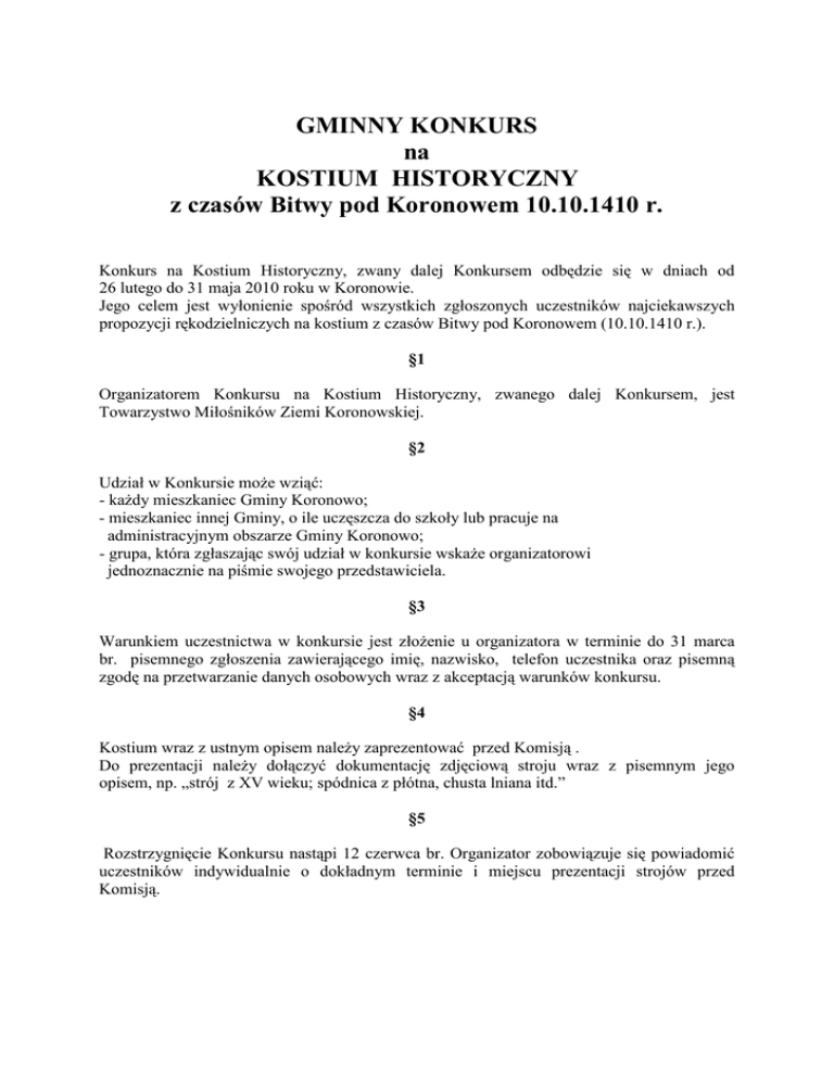 GMINNY KONKURS na KOSTIUM HISTORYCZNY z czasów Bitwy pod Koronowem 10.10.1410 r. Konkurs na Kostium Historyczny, zwany dalej Konkursem odbędzie się w dniach od 26 lutego do 31 maja 2010 roku w Koronowie. Jego celem jest wyłonienie spośród wszystkich zgłoszonych uczestników najciekawszych propozycji rękodzielniczych na kostium z czasów Bitwy pod Koronowem (10.10.1410 r.). §1 Organizatorem Konkursu na Kostium Historyczny, zwanego dalej Konkursem, jest Towarzystwo Miłośników Ziemi Koronowskiej. §2 Udział w Konkursie może wziąć: - każdy mieszkaniec Gminy Koronowo; - mieszkaniec innej Gminy, o ile uczęszcza do szkoły lub pracuje na administracyjnym obszarze Gminy Koronowo; - grupa, która zgłaszając swój udział w konkursie wskaże organizatorowi jednoznacznie na piśmie swojego przedstawiciela. §3 Warunkiem uczestnictwa w konkursie jest złożenie u organizatora w terminie do 31 marca br. pisemnego zgłoszenia zawierającego imię, nazwisko, telefon uczestnika oraz pisemną zgodę na przetwarzanie danych osobowych wraz z akceptacją warunków konkursu. §4 Kostium wraz z ustnym opisem należy zaprezentować przed Komisją . Do prezentacji należy dołączyć dokumentację zdjęciową stroju wraz z pisemnym jego opisem, np. „strój z XV wieku; spódnica z płótna, chusta lniana itd.” §5 Rozstrzygnięcie Konkursu nastąpi 12 czerwca br. Organizator zobowiązuje się powiadomić uczestników indywidualnie o dokładnym terminie i miejscu prezentacji strojów przed Komisją. §6 Zgłoszone do Konkursu stroje oceniać będzie, powołana przez TMZK Komisja Konkursowa. Komisja będzie oceniać stroje w dwóch kategoriach: * realizm historyczny * pomysłowość §7 Komisja wyłoni laureatów I, II i III miejsca w dwóch kategoriach: indywidualnej i grupowej. Dla laureatów przewidziane zostały nagrody. Komisja może przyznać również wyróżnienia. Organizator nabywa prawa majątkowe do nagrodzonych strojów. §8 Wyniki będą ogłoszone po zakończeniu konkursu oraz opublikowane na stronie internetowej www.koronowo.pl i w prasie lokalnej. §9 Stroje ocenione przez Komisję zaprezentowane będą w korowodzie historycznym, który odbędzie się 07 – 08 sierpnia 2010 r. w Koronowie w ramach Festynu Cysterskiego oraz w październiku b.r., na uroczystym zakończeniu obchodów rocznicy 600 lecia Bitwy pod Koronowem. §10 Przystąpienie do Konkursu jest jednoznaczne z zaakceptowaniem warunków Regulaminu Konkursu. Informacje o konkursie można uzyskać w siedzibie TMZK (ul. Pomianowskiego 23/21, 86-010 Koronowo) oraz pod numerami telefonów: * 602 458 197 * 608 317 453 Organizator konkursu Towarzystwo Miłośników Ziemi Koronowskiej