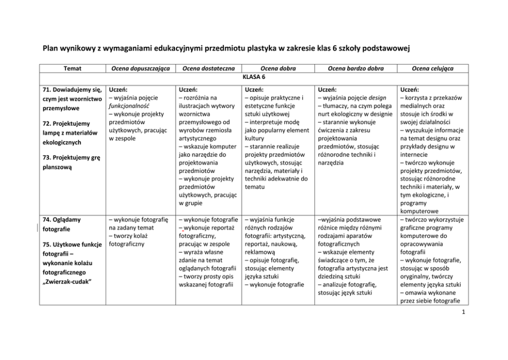 Plan wynikowy z wymaganiami edukacyjnymi przedmiotu plastyka w zakresie klas 6 szkoły podstawowej Temat 71. Dowiadujemy się, czym jest wzornictwo przemysłowe 72. Projektujemy lampę z materiałów ekologicznych Ocena dopuszczająca 75. Użytkowe funkcje fotografii – wykonanie kolażu fotograficznego „Zwierzak-cudak” Ocena dobra KLASA 6 Ocena bardzo dobra Ocena celująca Uczeń: – korzysta z przekazów medialnych oraz stosuje ich środki w swojej działalności – wyszukuje informacje na temat designu oraz przykłady designu w internecie – twórczo wykonuje projekty przedmiotów, stosując różnorodne techniki i materiały, w tym ekologiczne, i programy komputerowe – twórczo wykorzystuje graficzne programy komputerowe do opracowywania fotografii – wykonuje fotografie, stosując w sposób oryginalny, twórczy elementy języka sztuki – omawia wykonane przez siebie fotografie Uczeń: – wyjaśnia pojęcie funkcjonalność – wykonuje projekty przedmiotów użytkowych, pracując w zespole Uczeń: – rozróżnia na ilustracjach wytwory wzornictwa przemysłowego od wyrobów rzemiosła artystycznego – wskazuje komputer jako narzędzie do projektowania przedmiotów – wykonuje projekty przedmiotów użytkowych, pracując w grupie Uczeń: – opisuje praktyczne i estetyczne funkcje sztuki użytkowej – interpretuje modę jako popularny element kultury – starannie realizuje projekty przedmiotów użytkowych, stosując narzędzia, materiały i techniki adekwatnie do tematu Uczeń: – wyjaśnia pojęcie design – tłumaczy, na czym polega nurt ekologiczny w designie – starannie wykonuje ćwiczenia z zakresu projektowania przedmiotów, stosując różnorodne techniki i narzędzia – wykonuje fotografię na zadany temat – tworzy kolaż fotograficzny – wykonuje fotografie – wykonuje reportaż fotograficzny, pracując w zespole – wyraża własne zdanie na temat oglądanych fotografii – tworzy prosty opis wskazanej fotografii – wyjaśnia funkcje różnych rodzajów fotografii: artystyczną, reportaż, naukową, reklamową – opisuje fotografię, stosując elementy języka sztuki – wykonuje fotografie –wyjaśnia podstawowe różnice między różnymi rodzajami aparatów fotograficznych – wskazuje elementy świadczące o tym, że fotografia artystyczna jest dziedziną sztuki – analizuje fotografię, stosując język sztuki 73. Projektujemy grę planszową 74. Oglądamy fotografie Ocena dostateczna 1 76. Opis fotografii 77. Dowiadujemy się, co wspólnego mają sztuka i komputer 78. Projektujemy okładkę na zeszyt przedmiotowy 79. Media w sztuce 80. Dzień prezentacji „Moja szkoła” 81. Dowiadujemy się , jak powstaje film 82. Poznajemy gatunki filmowe – – wymienia korzyści i zagrożenia płynące z korzystania z internetu – wykonuje ćwiczenie na zadany temat – wyjaśnia, jak można wykorzystać komputer jako narzędzie do tworzenia sztuki – wykonuje projekt okładki, stosując wskazane narzędzia, materiały i techniki – poznaje programy do tworzenia prezentacji multimedialnych i animacji – wymienia narzędzia do tworzenia sztuki multimedialnej – wykonuje jedno z ćwiczeń składających się na projekt Moja szkoła, pracując w zespole – wyjaśnia pojęcie sztuki nowych mediów – stosuje w zadaniu wskazane techniki, narzędzia i materiały – rozróżnia gatunki filmowe – wykonuje plakat do wybranego filmu – wyjaśnia pojęcie filmu – opisuje funkcje kamery i projektora – wykonuje plakat do – rozpoznaje dzieło artystycznej grafiki komputerowej – korzysta z programu do tworzenia prezentacji multimedialnych – wykonuje projekt okładki, stosując narzędzia, materiały i techniki adekwatnie do tematu – wymienia funkcje graficznych programów komputerowych – wyjaśnia pojęcie sztuki multimedialnej – wymienia przykłady sztuki multimedialnej – wykonuje elementy ćwiczeń składających się na zespołowy projekt Moja szkoła adekwatnie do tematu – opisuje czynności, które w pracy nad filmem wykonują: scenograf, scenarzysta, operator, reżyser, kostiumolog, – opisuje rolę, funkcję i wygląd stron internetowych – starannie wykonuje projekt okładki, stosując narzędzia, materiały i techniki adekwatnie do tematu –wykonuje komiks za pomocą programu Comic Life – twórczo wykonuje zadania, korzystając z graficznych programów komputerowych – wyjaśnia pojęcie performance – starannie wykonuje ćwiczenia składające się na zespołowy projekt Moja szkoła, stosując różne techniki, narzędzia, materiały – twórczo realizuje zadania projektu zespołowego Moja szkoła, stosując narzędzia do tworzenia sztuki multimedialnej – wyszukuje i systematyzuje informacje na temat filmu i prezentuje je w formie plakatu, portfolio lub prezentacji multimedialnej – wykonuje animację filmową, stosując komputerowy program do tworzenia animacji – twórczo i ze 2 wykonanie plakatu filmowego 83. Przyglądamy się sztuce ludowej 84–85. Wizyta w izbie regionalnej, muzeum etnograficznym, skansenie lub u twórcy ludowego albo: Wykonujemy zakładkę do książki – praca inspirowana sztuką ludową filmu, łącząc obraz z tekstem – podaje przykłady dyscyplin sztuki, w których można odnaleźć elementy sztuki ludowej – wykonuje zadania i prace na zadany temat, inspirowane sztuką ludową – odczytuje na mapie tradycyjne regiony Polski – stosuje w zadaniach i we własnych pracach plastycznych wskazane techniki, narzędzia i materiały – rozróżnia na – wyjaśnia pojęcie charakteryzator, kompozytor muzyki – wykonuje plakat do filmu ze świadomością roli obrazu i tekstu, stosując wskazane techniki i narzędzia adekwatnie do tematu – rozpoznaje zabytki budownictwa ludowego – wymienia miejsca gromadzenia zbiorów sztuki ludowej – omawia dzieło sztuki ludowej, podając daną dziedzinę sztuki i materiał, z którego zostało zrobione – wykonuje różnorodne zadania i prac