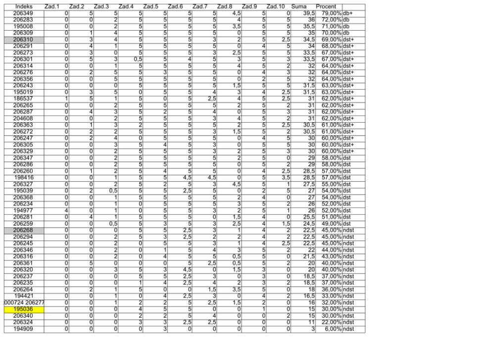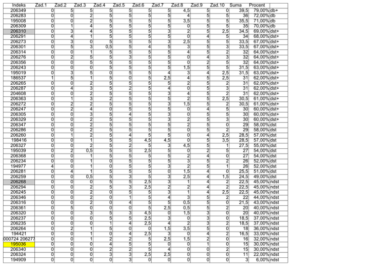 Indeks Zad.1 206349 206283 195008 206309 206310 206291 206273 206301 206314 206276 206356 206243 195019 186537 206265 206287 204608 206363 206272 206247 206305 206329 206347 206286 206260 198416 206327 195039 206368 206234 194977 206281 206259 206268 206294 206245 206346 206316 206361 206320 206237 206235 206264 194421 k000724 206277 195036 206340 206324 194909 Zad.2 0 0 0 0 0 0 0 0 0 0 0 0 0 1 0 0 0 0 0 0 0 0 0 0 0 0 0 0 0 0 4 0 0 0 0 0 0 0 0 0 0 0 0 0 0 0 0 0 0 Zad.3 5 0 0 1 3 4 3 5 0 2 0 0 3 5 0 4 0 1 2 2 0 0 0 0 1 0 0 2 0 0 0 4 0 0 0 0 0 0 5 0 0 0 2 0 0 0 0 0 0 Zad.4 5 2 2 4 4 1 0 3 1 5 5 0 5 1 2 3 2 3 2 4 3 2 2 2 2 1 2 0,5 1 1 1 1 0,5 0 2 2 2 2 0 3 0 0 1 1 1 0 0 0 0 Zad.5 5 5 5 5 5 5 5 0,5 5 5 5 5 0 5 5 5 5 2 5 0 5 5 5 5 5 5 5 5 5 0 0 5 5 5 5 0 0 0 0 5 5 1 5 0 2 4 2 3 0 Zad.6 5 5 5 5 5 5 5 5 5 3 5 5 5 0 5 2 5 5 5 5 4 5 5 5 4 5 2 5 5 5 5 5 3 5 3 5 1 4 0 3 5 4 0 4 2 5 2 3 3 Zad.7 5 5 5 5 5 5 5 4 5 5 5 5 5 5 5 5 5 5 5 5 5 5 5 5 5 4,5 5 2,5 5 5 5 5 5 2,5 2,5 5 5 5 5 4,5 2,5 2,5 0 2,5 5 5 5 2,5 0 Zad.8 5 5 5 5 3 5 3 5 5 5 5 5 4 2,5 5 4 3 5 3 5 3 3 5 5 5 4,5 3 5 5 5 3 0 3 3 2 3 4 5 2,5 0 3 4 1,5 3 2,5 0 4 2,5 0 Zad.9 4,5 4 3,5 0 2 0 2,5 3 4 0 0 1,5 3 4 2 0 4 2 1,5 0 0 2 2 0 0 0 4,5 0 2 3 2 1,5 2,5 1 2 1 3 0,5 0,5 1,5 0 2 3,5 0 1,5 0 0 0 0 Zad.10 5 5 5 5 5 4 5 5 5 4 2 5 4 5 5 5 5 5 5 4 5 5 5 5 4 5 5 2 4 5 5 4 4 4 4 4 5 5 5 3 3 3 5 4 2 1 0 0 0 0 5 5 5 2,5 5 5 3 2 3 5 5 2,5 2,5 2 3 2 2,5 2 5 5 3 0 2 2,5 3,5 1 5 0 2 1 0 1,5 2 2 2,5 2 0 2 0 0 2 0 2 0 0 2 0 0 Suma Procent 39,5 79,00% db+ 36 72,00% db 35,5 71,00% db 35 70,00% db 34,5 69,00% dst+ 34 68,00% dst+ 33,5 67,00% dst+ 33,5 67,00% dst+ 32 64,00% dst+ 32 64,00% dst+ 32 64,00% dst+ 31,5 63,00% dst+ 31,5 63,00% dst+ 31 62,00% dst+ 31 62,00% dst+ 31 62,00% dst+ 31 62,00% dst+ 30,5 61,00% dst+ 30,5 61,00% dst+ 30 60,00% dst+ 30 60,00% dst+ 30 60,00% dst+ 29 58,00% dst 29 58,00% dst 28,5 57,00% dst 28,5 57,00% dst 27,5 55,00% dst 27 54,00% dst 27 54,00% dst 26 52,00% dst 26 52,00% dst 25,5 51,00% dst 24,5 49,00% dst 22,5 45,00% ndst 22,5 45,00% ndst 22,5 45,00% ndst 22 44,00% ndst 21,5 43,00% ndst 20 40,00% ndst 20 40,00% ndst 18,5 37,00% ndst 18,5 37,00% ndst 18 36,00% ndst 16,5 33,00% ndst 16 32,00% ndst 15 30,00% ndst 15 30,00% ndst 11 22,00% ndst 3 6,00% ndst