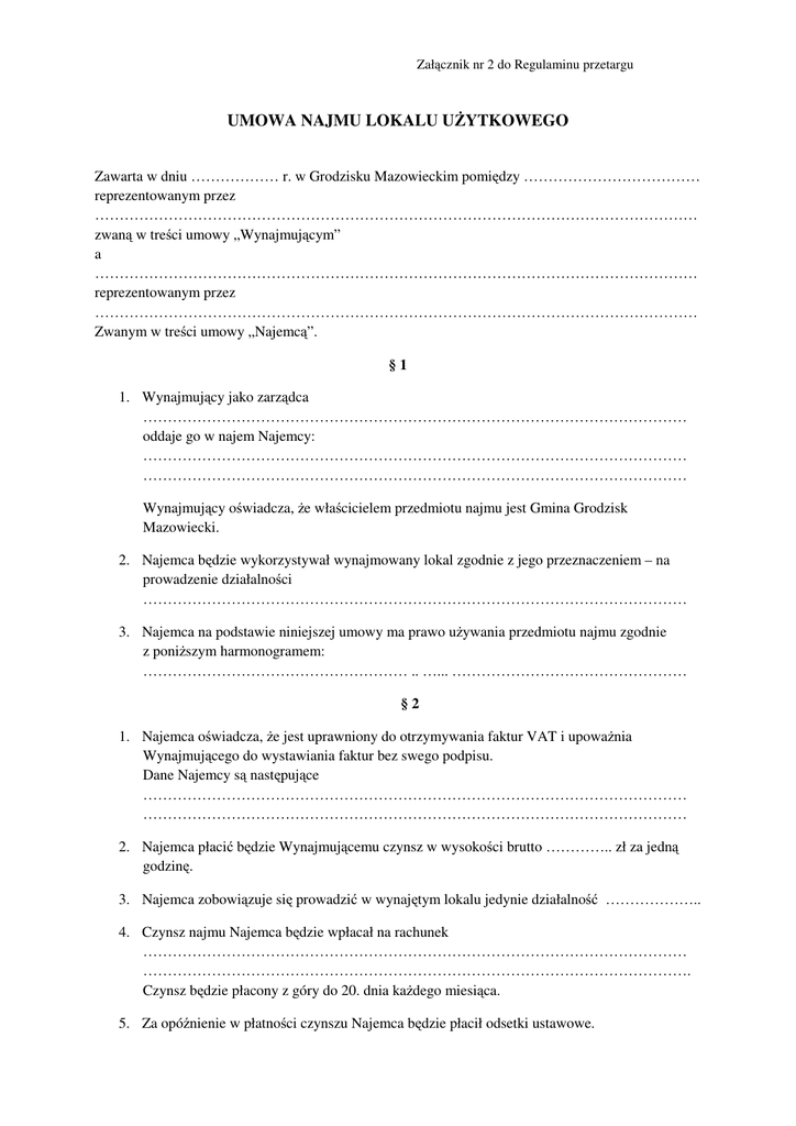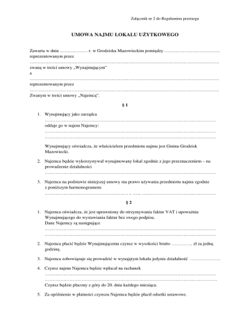 Załącznik nr 2 do Regulaminu przetargu UMOWA NAJMU LOKALU UŻYTKOWEGO Zawarta w dniu ……………… r. w Grodzisku Mazowieckim pomiędzy ……………………………… reprezentowanym przez …………………………………………………………………………………………………………… zwaną w treści umowy „Wynajmującym” a …………………………………………………………………………………………………………… reprezentowanym przez …………………………………………………………………………………………………………… Zwanym w treści umowy „Najemcą”. §1 1. Wynajmujący jako zarządca ………………………………………………………………………………………………… oddaje go w najem Najemcy: ………………………………………………………………………………………………… ………………………………………………………………………………………………… Wynajmujący oświadcza, że właścicielem przedmiotu najmu jest Gmina Grodzisk Mazowiecki. 2. Najemca będzie wykorzystywał wynajmowany lokal zgodnie z jego przeznaczeniem – na prowadzenie działalności ………………………………………………………………………………………………… 3. Najemca na podstawie niniejszej umowy ma prawo używania przedmiotu najmu zgodnie z poniższym harmonogramem: ……………………………………………… .. …... ………………………………………… §2 1. Najemca oświadcza, że jest uprawniony do otrzymywania faktur VAT i upoważnia Wynajmującego do wystawiania faktur bez swego podpisu. Dane Najemcy są następujące ………………………………………………………………………………………………… ………………………………………………………………………………………………… 2. Najemca płacić będzie Wynajmującemu czynsz w wysokości brutto ………….. zł za jedną godzinę. 3. Najemca zobowiązuje się prowadzić w wynajętym lokalu jedynie działalność ……………….. 4. Czynsz najmu Najemca będzie wpłacał na rachunek ………………………………………………………………………………………………… …………………………………………………………………………………………………. Czynsz będzie płacony z góry do 20. dnia każdego miesiąca. 5. Za opóźnienie w płatności czynszu Najemca będzie płacił odsetki ustawowe. 6. Do dnia ………………………….. Najemca zobowiązuje się przelać na konto Wynajmującego kaucję w wysokości miesięcznego czynszu. Kaucja rozliczona zostanie w przypadku rozwiązania umowy na poczet ostatniego należnego czynszu lub na pokrycie szkód wyrządzonych przez Najemcę. §3 Bez zgody Wynajmującego Najemca nie może lokalu w całości ani w części podnająć lub użyczyć osobie trzeciej. Zgody Wynajmującego wymagają wszystkie zmiany i ulepszenia przedmiotu najmu. §4 1. Lokal zostanie przekazany Wynajmującemu z wyposażeniem podstawowym: stoły i krzesła. 2. Naruszenie przez Najemcę postanowienia § 3 uzasadnia roszczenie Wynajmującego o przywrócenie stanu poprzedniego lub roszczenie odszkodowawcze. 3. Osoby korzystające z usług Najemcy mają prawo do korzystania z ogólnodostępnych sanitariatów znajdujących się na terenie obiektu. 4. Najemca ponosi całkowitą odpowiedzialność wobec odpowiednich organów administracji za skutki materialne i prawne naruszania w lokalu użytkowym obowiązujących przepisów ochrony: sanitarnych, porządkowych, przeciwpożarowych itp. §5 Najemca zobowiązany jest uzyskać wszelkie pozwolenia na użytkowanie obiektu na cel w zakresie programu działalności jaką ma prowadzić. §6 Umowa zostaje zawarta na okres ……………………………………………………, z zastrzeżeniem 14-dniowego okresu wypowiedzenia. §7 1. W przypadku podjęcia przez Najemcę innej działalności niż wyszczególniona w § 1 pkt 2 lub zawieszenia działalności przynajmniej na jeden miesiąc oraz zaległości z czynszem co najmniej 1 miesiąc bądź dopuszczenia się dewastacji przedmiotu najmu Wynajmujący może rozwiązać niniejszą umowę ze skutkiem natychmiastowym. 2. Wynajmujący może wypowiedzieć Najemcy, bez zachowania terminów wypowiedzenia, umowę również wtedy gdy Najemca przez swoje niewłaściwe zachowanie czyni uciążliwym korzystanie z innych lokali znajdujących się w jego sąsiedztwie. §8 Prowadzący zajęcia z dziećmi odpowiada za ich bezpieczeństwo. Przychodzi do szkoły 10 minut przed rozpoczęciem zajęć i opuszcza budynek po wyjściu ze szkoły ostatniego uczestnika zajęć. §9 Zmiany umowy wymagają formy pisemnej. § 10 Po zakończeniu okresu umowy najmu Najemca opuści lokal oraz opróżni go na swój koszt z własnych rzeczy tam wniesionych. Zwróci Wynajmującemu lokal w stanie nie pogorszonym, z uwzględnieniem dokonanych adaptacji i normatywnego zużycia przedmiotu najmu wynikającego z prawidłowej eksploatacji. § 11 W sprawach nie unormowanych niniejszą umową mają zastosowanie przepisy Kodeksu Cywilnego, a w szczególności Tytuł XVII „ Najem i Dzierżawa”. § 12 Ewentualne spory, jakie mogą wyniknąć na tle stosowania niniejszej umowy rozstrzygać będzie właściwy sąd. § 13 Umowę spisano w dwóch jednobrzmiących egzemplarzach po jednym dla każdej ze stron. Wynajmujący Najemca