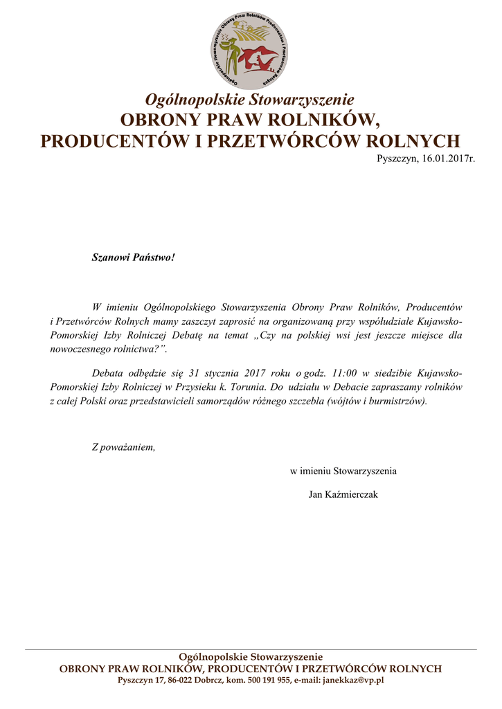 Ogólnopolskie Stowarzyszenie OBRONY PRAW ROLNIKÓW, PRODUCENTÓW I PRZETWÓRCÓW ROLNYCH Pyszczyn, 16.01.2017r. Szanowi Państwo! W imieniu Ogólnopolskiego Stowarzyszenia Obrony Praw Rolników, Producentów i Przetwórców Rolnych mamy zaszczyt zaprosić na organizowaną przy współudziale KujawskoPomorskiej Izby Rolniczej Debatę na temat „Czy na polskiej wsi jest jeszcze miejsce dla nowoczesnego rolnictwa?”. Debata odbędzie się 31 stycznia 2017 roku o godz. 11:00 w siedzibie KujawskoPomorskiej Izby Rolniczej w Przysieku k. Torunia. Do udziału w Debacie zapraszamy rolników z całej Polski oraz przedstawicieli samorządów różnego szczebla (wójtów i burmistrzów). Z poważaniem, w imieniu Stowarzyszenia Jan Kaźmierczak Ogólnopolskie Stowarzyszenie OBRONY PRAW ROLNIKÓW, PRODUCENTÓW I PRZETWÓRCÓW ROLNYCH Pyszczyn 17, 86-022 Dobrcz, kom. 500 191 955, e-mail: [email protected]