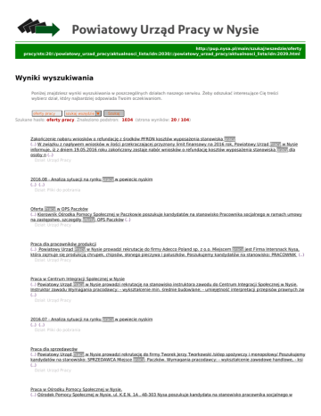 http://pup.nysa.pl/main/szukaj/wszedzie/oferty pracy/sts:20/:/powiatowy_urzad_pracy/aktualnosci_lista/idn:2030/:/powiatowy_urzad_pracy/aktualnosci_lista/idn:2039.html Wyniki wyszukiwania Poniżej znajdziesz wyniki wyszukiwania w poszczególnych działach naszego serwisu. Żeby odszukać interesujące Cię treści wybierz dział, który najbardziej odpowiada Twoim oczekiwaniom. oferty pracy szukaj wszędzie ▼ Szukaj Szukane hasło: oferty pracy. Znaleziono podstron: 1034 (strona wyników: 20 / 104) 191 Zakończenie naboru wniosków o refundację z środków PFRON kosztów wyposażenia stanowiska pracy (..) W związku z napływem wniosków w ilości przekraczającej przyznany limit finansowy na 2016 rok, Powiatowy Urząd Pracy w Nysie informuje, iż z dniem 19.05.2016 roku zakończony zostaje nabór wniosków o refundację kosztów wyposażenia stanowiska pracy dla osoby n (..) Dział: Urząd Pracy 192 2016.08 - Analiza sytuacji na rynku pracy w powiecie nyskim (..) (..) Dział: Pliki do pobrania 193 Oferta Pracy w OPS Paczków (..) Kierownik Ośrodka Pomocy Społecznej w Paczkowie poszukuje kandydatów na stanowisko Pracownika socjalnego w ramach umowy na zastępstwo. szczegóły oferty: OPS Paczków (..) Dział: Urząd Pracy 194 Praca dla pracowników produkcji (..) Powiatowy Urząd Pracy w Nysie prowadzi rekrutację do firmy Adecco Poland sp. z o.o. Miejscem pracy jest Firma Intersnack Nysa, która zajmuje się produkcją chrupek, chipsów, słonego pieczywa i paluszków. Poszukujemy kandydatów na stanowisko: PRACOWNIK (..) Dział: Urząd Pracy 195 Praca w Centrum Integracji Społecznej w Nysie (..) Powiatowy Urząd Pracy w Nysie prowadzi rekrutację na stanowisko instruktora zawodu do Centrum Integracji Społecznej w Nysie. Instruktor zawodu Wymagania pracodawcy: - wykształcenie min. średnie budowlane; - umiejętność interpretacji przepisów prawnych zw (..) Dział: Urząd Pracy 196 2016.07 - Analiza sytuacji na rynku pracy w powiecie nyskim (..) (..) Dział: Pliki do pobrania 197 Praca dla sprzedawców (..) Powiatowy Urząd Pracy w Nysie prowadzi rekrutację do firmy Tworek Jerzy Tworkowski /sklep spożywczy i monopolowy/ Poszukujemy kandydatów na stanowisko: SPRZEDAWCA Miejsce pracy: Paczków. Wymagania pracodawcy: - wykształcenie zawodowe handlowe, - ksi (..) Dział: Urząd Pracy 198 Praca w Ośrodku Pomocy Społecznej w Nysie. (..) Ośrodek Pomocy Społecznej w Nysie, ul. K.E.N. 1A , 48-303 Nysa poszukuje kandydata na stanowisko pracownika socjalnego w Dziale Pomocy Środowiskowej, na zastępstwo pracownika w okresie jego usprawiedliwionej nieobecności w pracy. 1. Stanowisko pracy: prac (..) Dział: Urząd Pracy 199 Zapraszamy do udziału w projekcie (..) Zapraszamy do udziału w projekcie „(Od)Ważni na rynku pracy – aktywizacja społeczna i zawodowa osób z niepełnosprawnością intelektualną i niepełnosprawnościami sprzężonymi z terenu woj. opolskiego” Celem głównym realizacji projektu jest zwiększen (..) Dział: Urząd Pracy 200 Poszukujemy pracowników na stanowisko: operatora linii produkcyjnej (..) Powiatowy Urząd Pracy w Nysie prowadzi rekrutację do renomowanej firmy SCA w Oławie, zajmującej się produkcją asortymentów higienicznych (chusteczek, pieluszek itp.). Poszukujemy pracowników na stanowisko:OPERATORA LINII PRODUKCYJNEJ Zakres obowiązków: (..) Dział: Urząd Pracy ● ● ● ● ● ● ● ● ● ● ● ● ● ● ● « Pierwsza < Poprzednia 15 16 17 18 19 20 21 22 23 24 25 Następna > Ostatnia »
