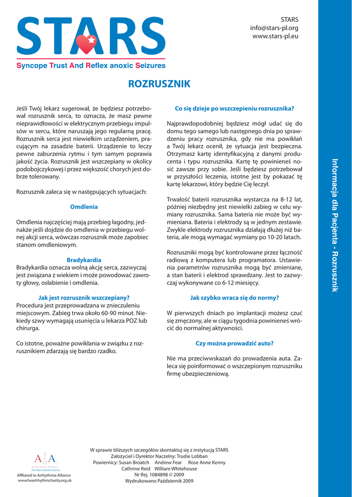 STARS [email protected] www.stars-pl.eu ROZRUSZNIK Rozrusznik zaleca się w następujących sytuacjach: Omdlenia Omdlenia najczęściej mają przebieg łagodny, jednakże jeśli dojdzie do omdlenia w przebiegu wolnej akcji serca, wówczas rozrusznik może zapobiec stanom omdleniowym. Bradykardia Bradykardia oznacza wolną akcję serca, zazwyczaj jest związana z wiekiem i może powodować zawroty głowy, osłabienie i omdlenia. Jak jest rozrusznik wszczepiany? Procedura jest przeprowadzana w znieczuleniu miejscowym. Zabieg trwa około 60-90 minut. Niekiedy szwy wymagają usunięcia u lekarza POZ lub chirurga. Co istotne, poważne powikłania w związku z rozrusznikiem zdarzają się bardzo rzadko. The Heart Rhythm Charity Affiliated to Arrhythmia Alliance www.heartrhythmcharity.org.uk Co się dzieje po wszczepieniu rozrusznika? Najprawdopodobniej będziesz mógł udać się do domu tego samego lub następnego dnia po sprawdzeniu pracy rozrusznika, gdy nie ma powikłań a Twój lekarz ocenił, że sytuacja jest bezpieczna. Otrzymasz kartę identyfikacyjną z danymi producenta i typu rozrusznika. Kartę tę powinieneś nosić zawsze przy sobie. Jeśli będziesz potrzebował w przyszłości leczenia, istotne jest by pokazać tę kartę lekarzowi, który będzie Cię leczył. Trwałość baterii rozrusznika wystarcza na 8-12 lat, później niezbędny jest niewielki zabieg w celu wymiany rozrusznika. Sama bateria nie może być wymieniana. Bateria i elektrody są w jednym zestawie. Zwykle elektrody rozrusznika działają dłużej niź bateria, ale mogą wymagać wymiany po 10-20 latach. Rozruszniki mogą być kontrolowane przez łączność radiową z komputera lub programatora. Ustawienia parametrów rozrusznika mogą być zmieniane, a stan baterii i elektrod sprawdzany. Jest to zazwyczaj wykonywane co 6-12 miesięcy. Jak szybko wraca się do normy? W pierwszych dniach po implantacji możesz czuć się zmęczony, ale w ciągu tygodnia powinieneś wrócić do normalnej aktywności. Czy można prowadzić auto? Nie ma przeciwwskazań do prowadzenia auta. Zaleca się poinformować o wszczepionym rozruszniku firmę ubezpieczeniową. W sprawie bliższych szczegółów skontaktuj się z instytucją STARS Założyciel i Dyrektor Naczelny: Trudie Lobban Powiernicy: Susan Broatch Andrew Fear Rose Anne Kenny Cathrine Reid William Whitehouse Nr Rej. 1084898 © 2009 Wydrukowano Październik 2009 Informacja dla Pacjenta - Rozrusznik Jeśli Twój lekarz sugerował, że będziesz potrzebował rozrusznik serca, to oznacza, że masz pewne nieprawidłowości w elektrycznym przebiegu impulsów w sercu, które naruszają jego regularną pracę. Rozrusznik serca jest niewielkim urządzeniem, pracującym na zasadzie baterii. Urządzenie to leczy pewne zaburzenia rytmu i tym samym poprawia jakość życia. Rozrusznik jest wszczepiany w okolicy podobojczykowej i przez większość chorych jest dobrze tolerowany. STARS [email protected] www.stars-pl.eu Ważna informacja Powinieneś unikać rezonansu magnetycznego (NMR) a jeśli masz wyznaczone badanie musisz koniecznie poinformować technika i lekarza, że masz rozrusznik serca. Autor: Dr hab. med. Małgorzata Lelonek Zatwierdzenie: STARS Medical Advisory Committee The Heart Rhythm Charity Affiliated to Arrhythmia Alliance www.heartrhythmcharity.org.uk W sprawie bliższych szczegółów skontaktuj się z instytucją STARS Założyciel i Dyrektor Naczelny: Trudie Lobban Powiernicy: Susan Broatch Andrew Fear Rose Anne Kenny Cathrine Reid William Whitehouse Nr Rej. 1084898 © 2009 Wydrukowano Październik 2009 Informacja dla Pacjenta - Rozrusznik Wskazanym jest sprawdzenie parametrów rozrusznika przed pójściem do szpitala na badania czy operację, która nie jest powiązana z rozrusznikiem.