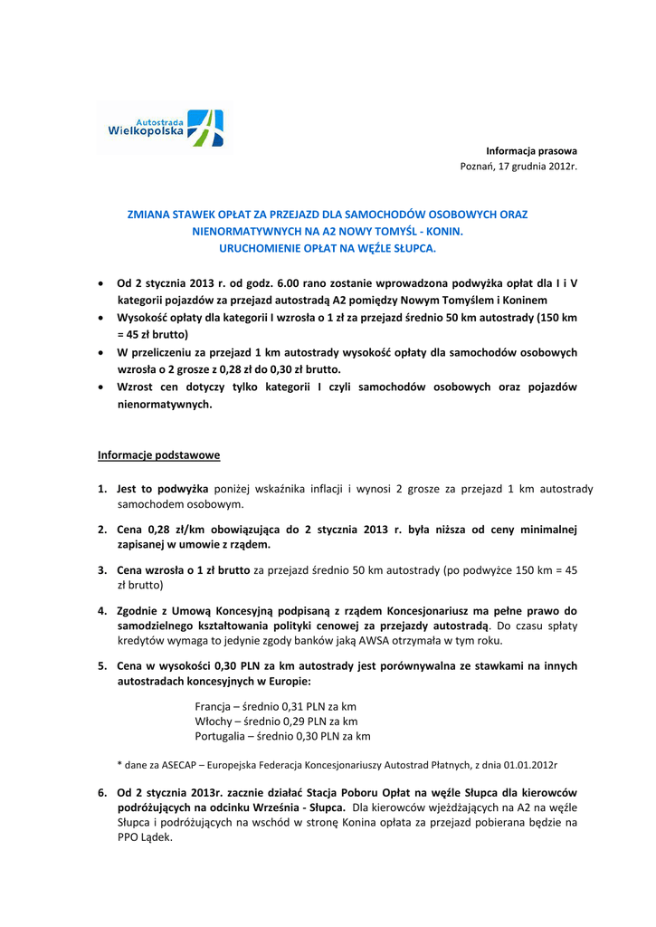 Informacja prasowa Poznań, 17 grudnia 2012r. ZMIANA STAWEK OPŁAT ZA PRZEJAZD DLA SAMOCHODÓW OSOBOWYCH ORAZ NIENORMATYWNYCH NA A2 NOWY TOMYŚL - KONIN. URUCHOMIENIE OPŁAT NA WĘŹLE SŁUPCA. Od 2 stycznia 2013 r. od godz. 6.00 rano zostanie wprowadzona podwyżka opłat dla I i V kategorii pojazdów za przejazd autostradą A2 pomiędzy Nowym Tomyślem i Koninem Wysokość opłaty dla kategorii I wzrosła o 1 zł za przejazd średnio 50 km autostrady (150 km = 45 zł brutto) W przeliczeniu za przejazd 1 km autostrady wysokość opłaty dla samochodów osobowych wzrosła o 2 grosze z 0,28 zł do 0,30 zł brutto. Wzrost cen dotyczy tylko kategorii I czyli samochodów osobowych oraz pojazdów nienormatywnych. Informacje podstawowe 1. Jest to podwyżka poniżej wskaźnika inflacji i wynosi 2 grosze za przejazd 1 km autostrady samochodem osobowym. 2. Cena 0,28 zł/km obowiązująca do 2 stycznia 2013 r. była niższa od ceny minimalnej zapisanej w umowie z rządem. 3. Cena wzrosła o 1 zł brutto za przejazd średnio 50 km autostrady (po podwyżce 150 km = 45 zł brutto) 4. Zgodnie z Umową Koncesyjną podpisaną z rządem Koncesjonariusz ma pełne prawo do samodzielnego kształtowania polityki cenowej za przejazdy autostradą. Do czasu spłaty kredytów wymaga to jedynie zgody banków jaką AWSA otrzymała w tym roku. 5. Cena w wysokości 0,30 PLN za km autostrady jest porównywalna ze stawkami na innych autostradach koncesyjnych w Europie: Francja – średnio 0,31 PLN za km Włochy – średnio 0,29 PLN za km Portugalia – średnio 0,30 PLN za km * dane za ASECAP – Europejska Federacja Koncesjonariuszy Autostrad Płatnych, z dnia 01.01.2012r 6. Od 2 stycznia 2013r. zacznie działać Stacja Poboru Opłat na węźle Słupca dla kierowców podróżujących na odcinku Września - Słupca. Dla kierowców wjeżdżających na A2 na węźle Słupca i podróżujących na wschód w stronę Konina opłata za przejazd pobierana będzie na PPO Lądek. Wpływy z opłat przeznaczane są na: 1. Bieżącą spłatę kredytów zaciągniętych na budowę autostrady w EBI i bankach komercyjnych. 2. Utrzymanie autostrady na wymaganym umową z rządem poziomie. 3. Odkładanie środków na przyszłe inwestycje m.in. dobudowę trzeciego pasa na obwodnicy Poznania, remonty i modernizacje itp. Przyczyny podwyżki opłat: utrzymanie płynności finansowej czyli bieżąca obsługa kredytów zaciągniętych na budowę autostrady (kredyt z Europejskiego Banku Inwestycyjnego oraz banków komercyjnych) wskaźnik inflacji Uruchomienie poboru opłat nastąpiło 06.01.2003r. i wówczas stawka opłat wynosiła 10 zł brutto, w tym VAT 7% tj. 9,35 zł netto. Od 1 stycznia 2003r. do 29 lutego 2012r. inflacja wyniosła 32% (wg GUS); jeśli urealnić wartość netto opłaty ze stycznia 2003r. do wartości z lutego 2012r. otrzymamy 9,35 x 1,32 = 12,34 zł netto + 23% VAT co daje 15,18 zł brutto. plan finansowy uzgodniony z rządem zakłada podwyżkę stawek opłat również w 2013r. nowe inwestycje na A2 Nowy Tomyśl – Konin AWSA zobowiązana jest do odkładania konkretnych środków finansowych na nowe inwestycje na autostradzie, na które tylko w 2011 i 2012r. przewidziano i wydatkowano kwotę ponad 150 mln zł (m.in. węzeł Poznań Zachód, Poznań Wschód, Słupca); wszystkie inwestycje realizowane są z przychodów z opłat za korzystanie z autostrady. brak dotacji Państwa – w przeciwieństwie do autostrad publicznych, autostrady koncesyjne nie są dotowane. Koszty eksploatacji odcinków koncesyjnych pokrywa w 100% koncesjonariusz. 23% podatek VAT – od lipca 2011r. stawki opłat na odcinkach publicznych są kwotami netto. Stawki opłat na odcinkach koncesyjnych są kwotami brutto zawierającymi 23% podatku VAT odprowadzanego do Skarbu Państwa. Opłaty dla odcinka A2 Nowy Tomyśl – Konin Obowiązują od 2 stycznia 2013r. godz. 6.00 rano 2 WYPOWIEDZI DO WYKORZYSTANIA: „Zapisy umowy nakładają na koncesjonariusza szereg obowiązków związanych z bieżącym utrzymaniem autostrady, realizację nowych inwestycji oraz spłatą kredytów. Należy podkreślić, że wszelkie inwestycje na odcinku zarządzanym przez Autostradę Wielkopolską pokrywane są w 100% z budżetu pochodzącego z przychodu z opłat za przejazd. Tylko w 2011 i 2012 roku wydatkowano ponad 150 mln złotych na inwestycje związane z przebudową węzła Słupca oraz przedłużeniem bezpłatnej obwodnicy Poznania z 13 do 25 km – dzięki oddaniu do ruchu całkowicie nowych węzłów: Poznań Zachód oraz Poznań Wschód. Przed nami kolejna inwestycja – budowa 3 pasa wzdłuż obwodnicy miasta, która także zostanie sfinansowana wyłącznie z budżetu Autostrady Wielkopolskiej – wylicza Zofia Kwiatkowska, Rzecznik Prasowy AWSA. „Należy zwrócić uwagę na różnice w ustalaniu stawek za przejazd pomiędzy autostradami publicznymi a koncesyjnymi. Autostrady publiczne dotowane są z podatków, z czego pokrywane są m.in. koszty eksploatacji oraz niezbędnego ciężkiego i lekkiego utrzymania autostrady. Ponadto, od lipca 2011r. stawki opłat obowiązujące na autostradach publicznych są kwotami netto, a kierowca zwolniony jest z regulowania podatku VAT w wysokości 23%. Umowy koncesjonariuszy, działające na zasadach rynkowych nie zezwalają na rezygnację z odprowadzania podatku VAT. Dlatego stawki obowiązujące na autostradach zarządzanych przez koncesjonariuszy są kwotami brutto – zawierają 23% podatek VAT odprowadzany do Skarbu Państwa” – wyjaśnia Zofia Kwiatkowska, Rzecznik Prasowy AWSA. Więcej informacji: Zofia Kwiatkowska, Rzecznik Prasowy, Autostrada Wielkopolska SA tel. +48 608 479 541, email: [email protected] Odwiedź Autostradę Wielkopolską w mediach społecznościowych: 3