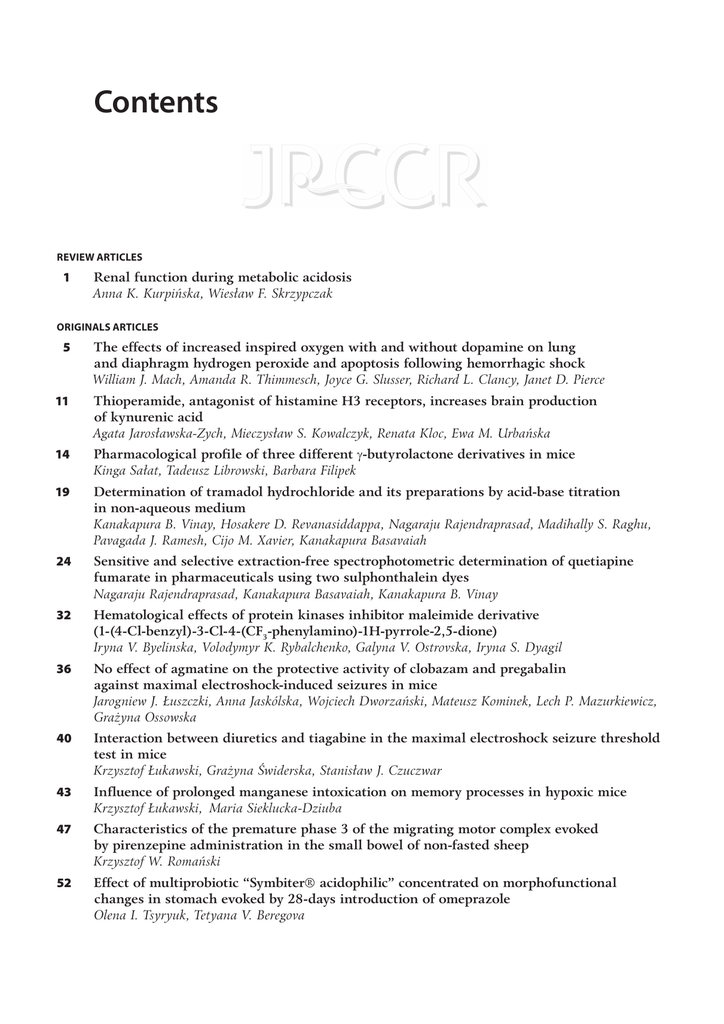 Contents REVIEW ARTICLES 1 Renal function during metabolic acidosis Anna K. Kurpińska, Wiesław F. Skrzypczak ORIGINALS ARTICLES 5 The effects of increased inspired oxygen with and without dopamine on lung and diaphragm hydrogen peroxide and apoptosis following hemorrhagic shock William J. Mach, Amanda R. Thimmesch, Joyce G. Slusser, Richard L. Clancy, Janet D. Pierce 11 Thioperamide, antagonist of histamine H3 receptors, increases brain production of kynurenic acid Agata Jarosławska-Zych, Mieczysław S. Kowalczyk, Renata Kloc, Ewa M. Urbańska 14 Pharmacological profile of three different γ-butyrolactone derivatives in mice Kinga Sałat, Tadeusz Librowski, Barbara Filipek 19 Determination of tramadol hydrochloride and its preparations by acid-base titration in non-aqueous medium Kanakapura B. Vinay, Hosakere D. Revanasiddappa, Nagaraju Rajendraprasad, Madihally S. Raghu, Pavagada J. Ramesh, Cijo M. Xavier, Kanakapura Basavaiah 24 Sensitive and selective extraction-free spectrophotometric determination of quetiapine fumarate in pharmaceuticals using two sulphonthalein dyes Nagaraju Rajendraprasad, Kanakapura Basavaiah, Kanakapura B. Vinay 32 Hematological effects of protein kinases inhibitor maleimide derivative (1-(4-Cl-benzyl)-3-Cl-4-(CF3-phenylamino)-1H-pyrrole-2,5-dione) Iryna V. Byelinska, Volodymyr K. Rybalchenko, Galyna V. Ostrovska, Iryna S. Dyagil 36 No effect of agmatine on the protective activity of clobazam and pregabalin against maximal electroshock-induced seizures in mice Jarogniew J. Łuszczki, Anna Jaskólska, Wojciech Dworzański, Mateusz Kominek, Lech P. Mazurkiewicz, Grażyna Ossowska 40 Interaction between diuretics and tiagabine in the maximal electroshock seizure threshold test in mice Krzysztof Łukawski, Grażyna Świderska, Stanisław J. Czuczwar 43 Influence of prolonged manganese intoxication on memory processes in hypoxic mice Krzysztof Łukawski, Maria Sieklucka-Dziuba 47 Characteristics of the premature phase 3 of the migrating motor complex evoked by pirenzepine administration in the small bowel of non-fasted sheep Krzysztof W. Romański 52 Effect of multiprobiotic “Symbiter® acidophilic” concentrated on morphofunctional changes in stomach evoked by 28-days introduction of omeprazole Olena I. Tsyryuk, Tetyana V. Beregova 57 Effect of dietary fat type on plasma lipid profile and leptin concentration in rats fed on high-sucrose diets Agata Krawczyńska, Katarzyna Okręglicka, Elżbieta Olczak, Joanna Gromadzka-Ostrowska 63 Analysis of nutrition of children in Warsaw day nurseries in view of current recommendations Halina Weker, Jadwiga Hamułka, Małgorzata Więch, Kamila Głowacka 68 Do and to what extent non-dietary factors affect nutritional habits of men with coronary heart disease? Alicja Solik-Tomassi, Anna Harton, Lucyna Narojek, Joanna Myszkowska-Ryciak, Danuta Gajewska 74 Sudden cardiac arrest induced by hypoglycemia and hypokalemia in a chronic alcoholic patient Andrzej Prystupa, Katarzyna Kucharska, Hussain Darbar, Neeraj Parmar, Rajit Parmar, Wojciech Załuska, Jerzy Mosiewicz CASE REPORTS 77 Spinal arachnoid cysts – a report of two cases and a review of the literature Samit Mehta, S. Dharmarajan, Michał Brzozowski, Tomasz Trojanowski MISCELLANEA 79 Preparations for euthanasia in Nazi Germany 1938-1939 Michael Tregenza