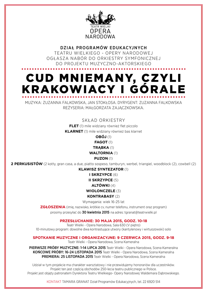 dz i a ł p r o g ra m ów e d u kacyjnych T E AT RU W I E L K I EG O - O P E RY N ARODOWEJ ogłasza na b ó r do orkiestry sy mfoni cznej do projektu muz yc z no -aktors kiego C u d m n i e m a n y, c z y l i K ra kow i acy i G ó ra l e Muzyka: Zuzanna Falkowska, Jan Stokłosa. Dyrygent: Zuzanna Falkowska Reżyseria: Małgorzata Zajączkowska. Sk ład orkiestry flet (1) mile widziany również flet piccolo klarnet (1) mile widziany również bas klarnet obój (1) fagot (1) trąbka (1) waltornia (1) puzon (1) 2 perkusistów (2 kotły, gran casa, a due, piatto sospeso, tamburyn, werbel, triangiel, woodblock (2), cowbell (2) klawisz syntezator (1) I skrzypce (6) II skrzypce (5) altówki (4) wiolonczele (3) kontrabasy (2) Wymagania: wiek 16-25 lat Zgłoszenia (imię, nazwisko, krótkie cv, numer telefonu, instrument oraz program) prosimy przesyłać do 30 kwietnia 2015 na adres: [email protected] Przesłuchanie: 30 maja 2015, godz. 10-18 Teatr Wielki - Opera Narodowa, Sala 630 (V piętro) 10-minutowy program: dowolne dwa kontrastujące utwory (kantylenowy i wirtuozowski) solo Spotkanie muzyczne i organizacyjne: 9 czerwca 2015, godz. 9-18 Teatr Wielki - Opera Narodowa, Scena Kameralna Pierwsze próby muzyczne: 1-14 lipca 2015 Teatr Wielki - Opera Narodowa, Scena Kameralna Końcowe próby: 16-24 listopada 2015 Teatr Wielki - Opera Narodowa, Scena Kameralna Premiera: 25 listopada 2015 Teatr Wielki - Opera Narodowa, Scena Kameralna Udział w tym projekcie ma charakter warsztatowy i nie przewidujemy honorariów dla uczestników. Projekt ten jest częścią obchodów 250-lecia teatru publicznego w Polsce. Projekt jest objęty patronatem Dyrektora Teatru Wielkiego- Opery Narodowej Waldemara Dąbrowskiego. Kontakt Tamara Granat Dział Programów Edukacyjnych, tel. 22 6920 514