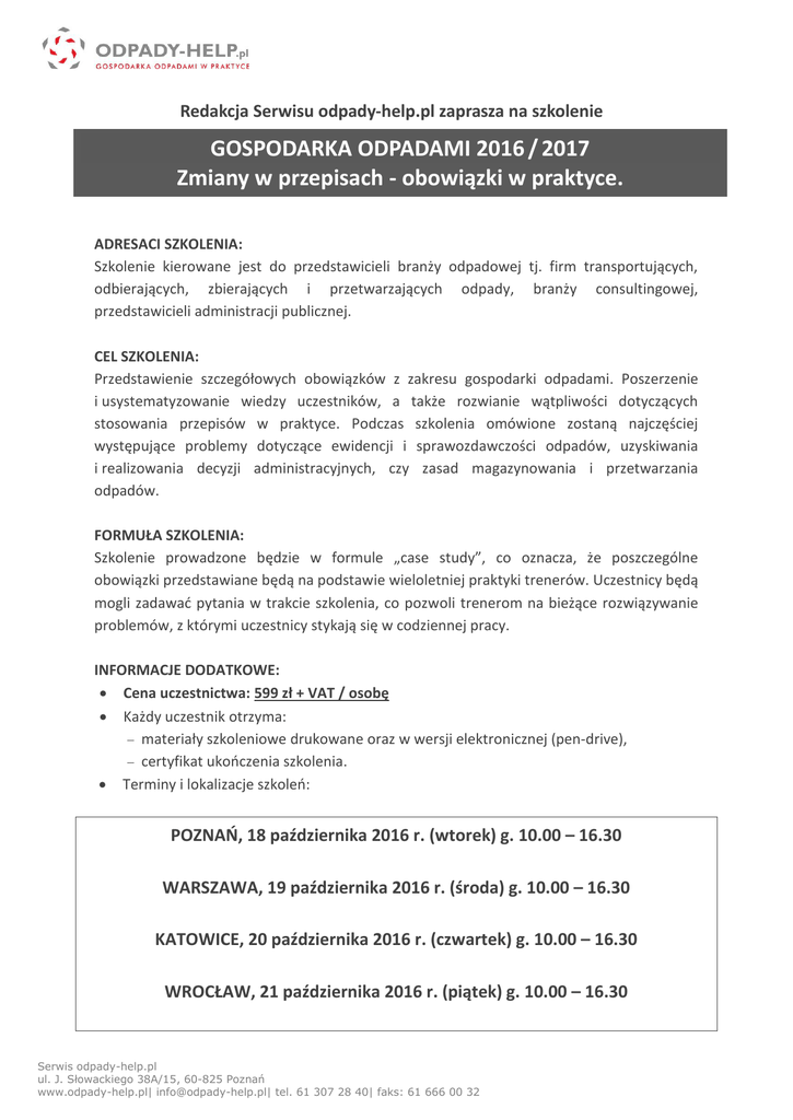 Redakcja Serwisu odpady-help.pl zaprasza na szkolenie GOSPODARKA ODPADAMI 2016 / 2017 Zmiany w przepisach - obowiązki w praktyce. i obowiązki przedsiębiorców z branży odpadowej ADRESACI SZKOLENIA: Szkolenie kierowane jest do przedstawicieli branży odpadowej tj. firm transportujących, odbierających, zbierających i przetwarzających odpady, branży consultingowej, przedstawicieli administracji publicznej. CEL SZKOLENIA: Przedstawienie szczegółowych obowiązków z zakresu gospodarki odpadami. Poszerzenie i usystematyzowanie wiedzy uczestników, a także rozwianie wątpliwości dotyczących stosowania przepisów w praktyce. Podczas szkolenia omówione zostaną najczęściej występujące problemy dotyczące ewidencji i sprawozdawczości odpadów, uzyskiwania i realizowania decyzji administracyjnych, czy zasad magazynowania i przetwarzania odpadów. FORMUŁA SZKOLENIA: Szkolenie prowadzone będzie w formule „case study”, co oznacza, że poszczególne obowiązki przedstawiane będą na podstawie wieloletniej praktyki trenerów. Uczestnicy będą mogli zadawać pytania w trakcie szkolenia, co pozwoli trenerom na bieżące rozwiązywanie problemów, z którymi uczestnicy stykają się w codziennej pracy. INFORMACJE DODATKOWE: Cena uczestnictwa: 599 zł + VAT / osobę Każdy uczestnik otrzyma: materiały szkoleniowe drukowane oraz w wersji elektronicznej (pen-drive), certyfikat ukończenia szkolenia. Terminy i lokalizacje szkoleń: POZNAŃ, 18 października 2016 r. (wtorek) g. 10.00 – 16.30 WARSZAWA, 19 października 2016 r. (środa) g. 10.00 – 16.30 KATOWICE, 20 października 2016 r. (czwartek) g. 10.00 – 16.30 WROCŁAW, 21 października 2016 r. (piątek) g. 10.00 – 16.30 Serwis odpady-help.pl ul. J. Słowackiego 38A/15, 60-825 Poznań www.odpady-help.pl| [email protected]| tel. 61 307 28 40| faks: 61 666 00 32 PROGRAM SZKOLENIA 10.00 – 11.30 11.30 – 11.45 11.45 – 13.00 13.00 – 13.45 13.45 – 15.15 15.15 – 15.30 15.30 – 16.30 BLOK I – Pozwolenia, zezwolenia, procedury administracyjne w praktyce Procedury uzyskania pozwolenia na wytwarzanie odpadów, zezwoleń na transport, zbieranie i przetwarzanie odpadów. Organy wydające decyzje – czas na rozpatrzenie wniosków i uzupełnień, nietypowe interpretacje, decyzje odmowne i wstrzymanie postępowania. Przygotować wniosek samodzielnie, czy zlecić to specjalistycznej firmie? Praktyczne wskazówki przy tworzeniu wniosków. Jakie działania możemy zaliczyć do procesu R3, a jakie do R5? Kiedy mówimy o odzysku, a kiedy o recyklingu? Decyzje środowiskowe jako istotny element w postępowaniach administracyjnych związanych z gospodarowaniem odpadami. Miejscowe plany zagospodarowania przestrzennego kluczem dla planowania inwestycji w gospodarowaniu odpadami. Na co zwrócić uwagę przed uprawomocnieniem się decyzji administracyjnej. Przerwa kawowa BLOK II - Przepisy szczegółowe w ujęciu praktycznym Magazynowanie odpadów w praktyce. Ściek czy odpad płynny? Prawne i ekonomiczne aspekty klasyfikacji frakcji płynnych. Wytwarzanie odpadów w ramach świadczenia usług. Odzysk a recykling. Omówienie na przykładach. Proces R12 w praktyce. Odzysk poza instalacjami po zmianach. Kiedy należy prowadzić monitoring? Nowe obowiązki dla PSZOK i RIPOK – jakie dane muszą gromadzić prowadzący? Przekazywanie odpadów osobom fizycznym wg nowych zasad. Odzysk w urządzeniach mobilnych. Przepisy w starciu z interpretacjami urzędów. Produkt uboczny i utrata statusu odpadów – omówienie na przykładach. Instalacje MBP bez przepisów szczegółowych – jakich wymogów muszą przestrzegać RiPOKi? Przerwa obiadowa BLOK III – Ewidencja i sprawozdawczość – CASE STUDY Kto jest zobowiązany do prowadzenia ewidencji odpadów – podstawy prawne obowiązku. Zwolnienia z ewidencji i sprawozdawczości – wg ustawy oraz rozporządzenia. Jakie podmioty mogą prowadzić uproszczoną ewidencję odpadów? Zasady wystawiania KPO oraz prowadzenia KEO. Wymogi ustawowe kontra codzienna praktyka. Ewidencja odpadów zebranych i przetwarzanych – błędy i interpretacje. Formularz przyjęcia odpadów metali – czy wystawia się go również w PSZOK? Ewidencja ZSEiE i zużytych baterii, akumulatorów. Kto powinien wypełniać DPUOM/DPUOW – spalarnia czy zbierający? Zasady wystawiania DPO/DPR. Zestawienia zbiorcze – wypełnianie działu dotyczącego przetwarzania odpadów w instalacjach. Nowe sprawozdania półroczne dla odbierających odpady komunalne z terenów gmin. Sprawozdanie zerowe – nowy obowiązek. Przerwa kawowa BLOK IV – Kontrole, kary i planowane zmiany na 2016-2018 Jak uniknąć kar finansowych w gospodarowaniu odpadami? Kiedy trzeba naliczyć opłatę za magazynowanie odpadów w niewłaściwy sposób, jak to zrobić? Kontrola WIOŚ przed wydaniem zezwolenia na przetwarzanie odpadów – nowy element przy wydawaniu decyzji. Prawa i obowiązki kontrolowanego – jakich argumentów używać w dyskusji z inspektorem WIOŚ, czy pracownikiem urzędu marszałkowskiego lub starostwa? Planowane zmiany w gospodarce odpadami na lata 2017 / 2018 – nowe obowiązki transportujących odpady, rejestr marszałkowski, nowe plany gospodarki odpadami, nowy katalog ZSEiE. Zmiany w zasadach prowadzenia kontroli od 2017 r. – nowe prawa i obowiązki organów kontrolnych i przedsiębiorców. Program stanowi zarys tematyki jaka będzie prezentowana podczas szkolenia. PRELEGENCI: Artur Domaszewicz - Redaktor naczelny Serwisu odpady-help.pl. Absolwent Wydziału Chemii Uniwersytetu im. Adama Mickiewicza w Poznaniu. Doktorant Wydziału Chemii UAM. Uczestnik posiedzeń i autor opinii sejmowej Komisji Ochrony Środowiska i Zasobów Naturalnych. Ukończył szkolenie pt. Weryfikator systemu EMAS w oparciu o program zatwierdzony przez Ministerstwo Środowiska. Autor publikacji dotyczących zagadnień prawnych w ochronie środowiska. Autor oprogramowania w zakresie ewidencji odpadów oraz emisji. Właściciel firmy doradczej Effeko sp