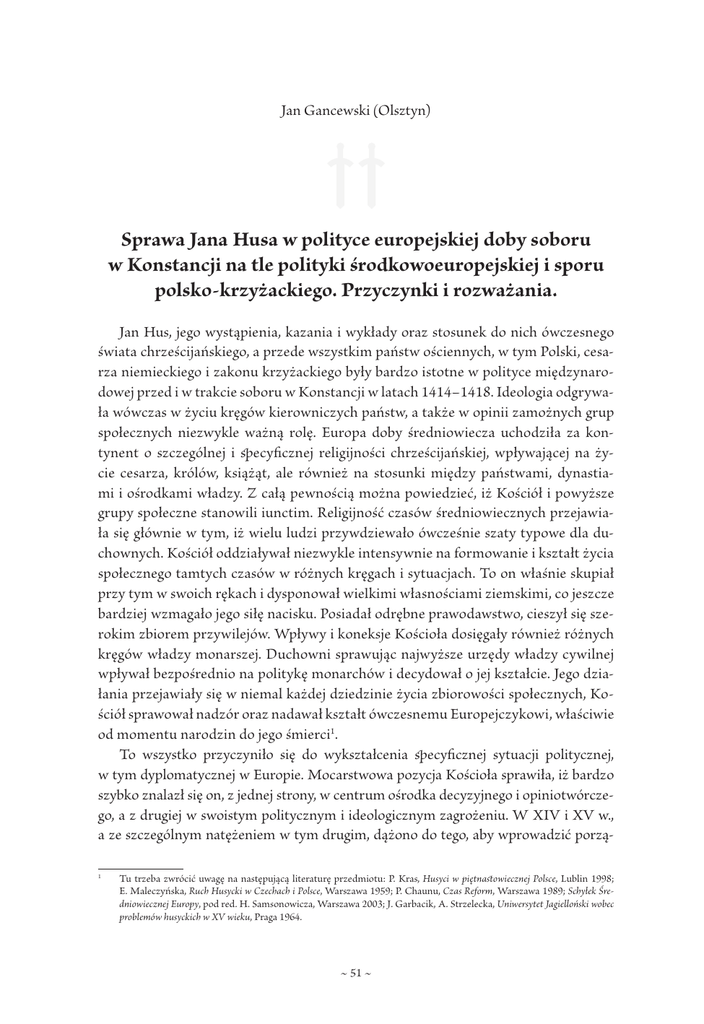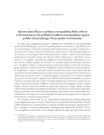 Jan Gancewski (Olsztyn) Sprawa Jana Husa w polityce europejskiej doby soboru w Konstancji na tle polityki środkowoeuropejskiej i sporu polsko-krzyżackiego. Przyczynki i rozważania. Jan Hus, jego wystąpienia, kazania i wykłady oraz stosunek do nich ówczesnego świata chrześcijańskiego, a przede wszystkim państw ościennych, w tym Polski, cesarza niemieckiego i zakonu krzyżackiego były bardzo istotne w polityce międzynarodowej przed i w trakcie soboru w Konstancji w latach 1414–1418. Ideologia odgrywała wówczas w życiu kręgów kierowniczych państw, a także w opinii zamożnych grup społecznych niezwykle ważną rolę. Europa doby średniowiecza uchodziła za kontynent o szczególnej i specyficznej religijności chrześcijańskiej, wpływającej na życie cesarza, królów, książąt, ale również na stosunki między państwami, dynastiami i ośrodkami władzy. Z całą pewnością można powiedzieć, iż Kościół i powyższe grupy społeczne stanowili iunctim. Religijność czasów średniowiecznych przejawiała się głównie w tym, iż wielu ludzi przywdziewało ówcześnie szaty typowe dla duchownych. Kościół oddziaływał niezwykle intensywnie na formowanie i kształt życia społecznego tamtych czasów w różnych kręgach i sytuacjach. To on właśnie skupiał przy tym w swoich rękach i dysponował wielkimi własnościami ziemskimi, co jeszcze bardziej wzmagało jego siłę nacisku. Posiadał odrębne prawodawstwo, cieszył się szerokim zbiorem przywilejów. Wpływy i koneksje Kościoła dosięgały również różnych kręgów władzy monarszej. Duchowni sprawując najwyższe urzędy władzy cywilnej wpływał bezpośrednio na politykę monarchów i decydował o jej kształcie. Jego działania przejawiały się w niemal każdej dziedzinie życia zbiorowości społecznych, Kościół sprawował nadzór oraz nadawał kształt ówczesnemu Europejczykowi, właściwie od momentu narodzin do jego śmierci1. To wszystko przyczyniło się do wykształcenia specyficznej sytuacji politycznej, w tym dyplomatycznej w Europie. Mocarstwowa pozycja Kościoła sprawiła, iż bardzo szybko znalazł się on, z jednej strony, w centrum ośrodka decyzyjnego i opiniotwórczego, a z drugiej w swoistym politycznym i ideologicznym zagrożeniu. W XIV i XV w., a ze szczególnym natężeniem w tym drugim, dążono do tego, aby wprowadzić porzą 1 Tu trzeba zwrócić uwagę na następującą literaturę przedmiotu: P. Kras, Husyci w piętnastowiecznej Polsce, Lublin 1998; E. Maleczyńska, Ruch Husycki w Czechach i Polsce, Warszawa 1959; P. Chaunu, Czas Reform, Warszawa 1989; Schyłek Średniowiecznej Europy, pod red. H. Samsonowicza, Warszawa 2003; J. Garbacik, A. Strzelecka, Uniwersytet Jagielloński wobec problemów husyckich w XV wieku, Praga 1964. ~ 51 ~ NOWE STUDIA GRUNWALDZKIE – TOM 1 dek i harmonię w hierarchii kościelnej. Coraz wyraźniej i mocniej przemawiały niektóre głosy, iż w momencie, kiedy spora część reprezentantów duchowieństwa wiodło niezwykle wystawne i „światowe” życie oraz nie świeciło dobrym przykładem godnym zbawienia i skromnego chrześcijanina; niezwłocznie trzeba było w takim wypadku odnieść się do powtórnie do kart Biblii i z jej kart spróbować ponownie odczytać znaki i życiowe drogowskazy. Osoby, które rozpowszechniały tego typu poglądy i szerzyły oparte na nich „nową” ideologię, określano mianem „heretyków”, a więc zwolenników fałszywych i grożących według Kościoła jego stabilności – doktryn i nowych wykładni ideologicznych religii chrześcijańskiej. Za jednego nich był w pewnym momencie swojej działalności (raczej po 1412 r.) uważany również Jan Hus. Jan Hus urodził się w niewielkiej miejscowości w Czechach około 1369 r. w niezamożnej rodzinie. Studia w zakresie nauk humanistycznych i teologicznych ukończył na Uniwersytecie Karola w Pradze, gdzie niebawem zaczął pełnić funkcje dziekana, zaś następnie rektora. W tym samym czasie zaczął analizować działalność angielskiego XIV-wiecznego reformatora Jana Wiklifa. W 1402 r. czeski władca Wacław IV powołał go na stanowisko duchownego w kaplicy betlejemskiej w Pradze. To tam właśnie zaczął głosić swoje odważne, do pewnego stopnia nowatorskie, ale i kontrowersyjne dla Kościoła kazania, w których niezwykle zacięcie żądał zaprzestania postępującego zepsucia w łonie kościoła. Stawał również w obronie interesów narodu czeskiego w cesarstwie niemieckim. Jego determinacja i nieustępliwa postawa przyczyniły się do zwrócenia uwagi na jego działalność ze strony hierarchii kościelnej, w tym przede wszystkim kurii rzymskiej i papiestwa. Ale dopiero po około 4 latach od zdecydowanego wystąpienia reformatorskiego Husa, gdyż w 1411 r. nałożono na niego karę ekskomuniki. Odeszła także od niego spora część wspierającej jego działania i wyznająca, te same co on, poglądy część czeskiego społeczeństwa. W tym samym czasie zaczął mieć coraz więcej zwolenników wśród decydentów w Europie. W związku z tym przyszło mu przez jakiś czas żyć w ukryciu, korzystając z gościny u swych zwolenników, lecz w chwili, gdy wezwano go na sobór w Konstancji (a właściwie został zaproszony przez Zygmunta Luksemburskiego, w celu przedstawienia swoich poglądów), pomimo zrozumiałego i uzasadnionego zagrożenia, odpowiedział na te wezwanie i zjawił się na soborze. Specjalnie na tę okoliczność Zygmunt Luksemburski wydał mu list żelazny, który jednak okazał się bezużyteczny i bezsilny względem zaciekłych oponentów i wrogów Jana Husa w kurii rzymskiej i ze strony papieża. Został osadzony w więzieniu i poddany torturom. Nie zrezygnował jednak ze swoich przekonań i ideologii głoszonej nauki, czego następstwem był wyrok spalenia na stosie. Egzekucja odbyła się w dniu 6 lipca 1415 r. Jeden z jego podstawowych postulatów, aby wszyscy ludzie świeccy mieli możliwość przyj