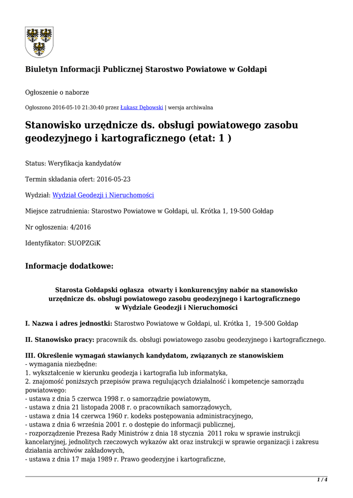 Biuletyn Informacji Publicznej Starostwo Powiatowe w Gołdapi Ogłoszenie o naborze Ogłoszono 2016-05-10 21:30:40 przez Łukasz Dębowski | wersja archiwalna Stanowisko urzędnicze ds. obsługi powiatowego zasobu geodezyjnego i kartograficznego (etat: 1 ) Status: Weryfikacja kandydatów Termin składania ofert: 2016-05-23 Wydział: Wydział Geodezji i Nieruchomości Miejsce zatrudnienia: Starostwo Powiatowe w Gołdapi, ul. Krótka 1, 19-500 Gołdap Nr ogłoszenia: 4/2016 Identyfikator: SUOPZGiK Informacje dodatkowe: Starosta Gołdapski ogłasza otwarty i konkurencyjny nabór na stanowisko urzędnicze ds. obsługi powiatowego zasobu geodezyjnego i kartograficznego w Wydziale Geodezji i Nieruchomości I. Nazwa i adres jednostki: Starostwo Powiatowe w Gołdapi, ul. Krótka 1, 19-500 Gołdap II. Stanowisko pracy: pracownik ds. obsługi powiatowego zasobu geodezyjnego i kartograficznego. III. Określenie wymagań stawianych kandydatom, związanych ze stanowiskiem - wymagania niezbędne: 1. wykształcenie w kierunku geodezja i kartografia lub informatyka, 2. znajomość poniższych przepisów prawa regulujących działalność i kompetencje samorządu powiatowego: - ustawa z dnia 5 czerwca 1998 r. o samorządzie powiatowym, - ustawa z dnia 21 listopada 2008 r. o pracownikach samorządowych, - ustawa z dnia 14 czerwca 1960 r. kodeks postępowania administracyjnego, - ustawa z dnia 6 września 2001 r. o dostępie do informacji publicznej, - rozporządzenie Prezesa Rady Ministrów z dnia 18 stycznia 2011 roku w sprawie instrukcji kancelaryjnej, jednolitych rzeczowych wykazów akt oraz instrukcji w sprawie organizacji i zakresu działania archiwów zakładowych, - ustawa z dnia 17 maja 1989 r. Prawo geodezyjne i kartograficzne, 1/4 - rozporządzenie Ministra Administracji i Cyfryzacji z dnia 5 września 2013 r. w sprawie organizacji i trybu prowadzenia państwowego zasobu geodezyjnego i kartograficznego, - Regulamin Organizacyjny Starostwa Powiatowego w Gołdapi, - Regulamin Pracy Starostwa Powiatowego w Gołdapi, - Statut Powiatu Gołdapskiego. 3. obywatelstwo polskie, 4. prawo do korzystania z pełni praw publicznych, 5. pełna zdolność do czynności prawnych, 6. brak prawomocnego skazania wyrokiem sądowym za umyśle przestępstwo skarbowe bądź przestępstwo z oskarżenia publicznego, 7. stan zdrowia pozwalający na wykonywanie pracy na ww. stanowisku pracy, 8. nieposzlakowana opinia. - wymagania dodatkowe : 1. biegła znajomość komputera i podstawowych pakietów biurowych, 2. opanowanie i wysoka kultura osobista, 3. ukierunkowanie na podnoszenia kwalifikacji i pogłębianie wiedzy, 4. znajomość administracji bazy danych Firebird, 5. znajomość programów komputerowych Ew-opis i Ew-mapa, 6. samodzielność, operatywność, dyspozycyjność, rzetelność, odpowiedzialność, umiejętność pracy w zespole. IV. Do zakresu zadań pracownika ds. obsługi powiatowego zasobu geodezyjnego i kartograficznego będzie należało przede wszystkim (główne zadania): - udostępnianie materiałów geodezyjnego i kartograficznego (PZGiK) droga elektroniczną za pomocą usług sieciowych, wydawanie licencji i naliczanie opłat, - obsługa i zabezpieczenie baz systemu PZGiK, w których gromadzi się materiały zasobu w postaci dokumentów elektronicznych, - monitorowanie procesów przyjmowania materiałów i zbiorów danych do zasobu w postaci elektronicznej, - dla terenu miasta oraz zwartych zabudowanych i przeznaczonych pod zabudowę obszarów wiejskich zakładanie i prowadzenie w systemie teleinformatycznym bazy danych obiektów topograficznych, - prowadzenie geodezyjnej ewidencji sieci uzbrojenia terenu, - konwersje zgromadzonych danych elektronicznych do baz danych systemu PZGiK, - ochrona baz danych oraz wykonywanie kopii bezpieczeństwa baz, które stanowią kopie awaryjne, - cykliczne przekazywanie aktualnych kopii posiadanych baz jednostkom uprawnionym (np.: GUGiK, WINGiK, GUS, ARiMR, ANR….). V. Informacja o warunkach pracy na danym stanowisku: 1. Zatrudnienie na podstawie umowy o pracę. 2. Praca w pełnym wymiarze czasu pracy. 3. Praca na II piętrze w budynku Starostwa nie posiadającym windy. VI. Wskaźnik zatrudnienia osób niepełnosprawnych: W rozumieniu ustawy o rehabilitacji zawodowej i społecznej oraz zatrudnianiu osób niepełnosprawnych informuję, że w miesiącu poprzedzającym datę upublicznienia ogłoszenia wskaźnik zatrudnienia osób niepełnosprawnych w Starostwie Powiatowym w Gołdapi wynosił poniżej 6%. VII. Wymagane dokumenty: 1. kwestionariusz osobowy dla osoby ubiegającej się o zatrudnienie, 2/4 2. życiorys (CV) uwzględniający dokładny przebieg dotychczasowego zatrudnienia oraz list motywacyjny- dokumenty własnoręcznie podpisane, 3. kopie dokumentów potwierdzających wykształcenie oraz kwalifikacje zawodowe, 4. kopie świadectw pracy, 5. oświadczenie o korzystaniu z pełni praw publicznych, 6. oświadczenie o niekaralności za umyślne przestępstwo ścigane z oskarżenia publicznego lub umyślne przestępstwo skarbowe (osoba wybrana w celu zatrudnienia zobowiązana będzie do przedstawienia oryginalnego ,,Zapytania o udzielenie informacji o osobie” z Krajowego Rejestru Karnego). VIII. Termin i miejsce składania dokumentów aplikacyjnych: Dokumenty aplikacyjne należy złożyć w zaklejonej kopercie z dopiskiem: ,,Dotyczy naboru na stanowisko ds. obsługi powiatowego zasobu geodezyjnego i kartograficznego Wydziału Geodezji i Nieruchomości w Starostwie Powiatowym w Gołdapi” w terminie do dnia 23 maja 2016r. do godz. 15.00. Dokumenty można złożyć osobiście w Biurze Obsługi Mieszkańców w Starostwie Powiatowym w Gołdapi, bądź przesłać pocztą na adres: Starostwo Powiatowe w Gołdapi ul. Krótka 1 19-500 Gołdap Dokumenty nadesłane po upływie wyżej wymienionego terminu nie będą rozpatrywane (decyduje data wpływu do Starostwa). Wymagane dokumenty aplikacyjne: list motywacyjny, CV należy opatrzyć klauzulą: ,,Wyrażam zgodę na p