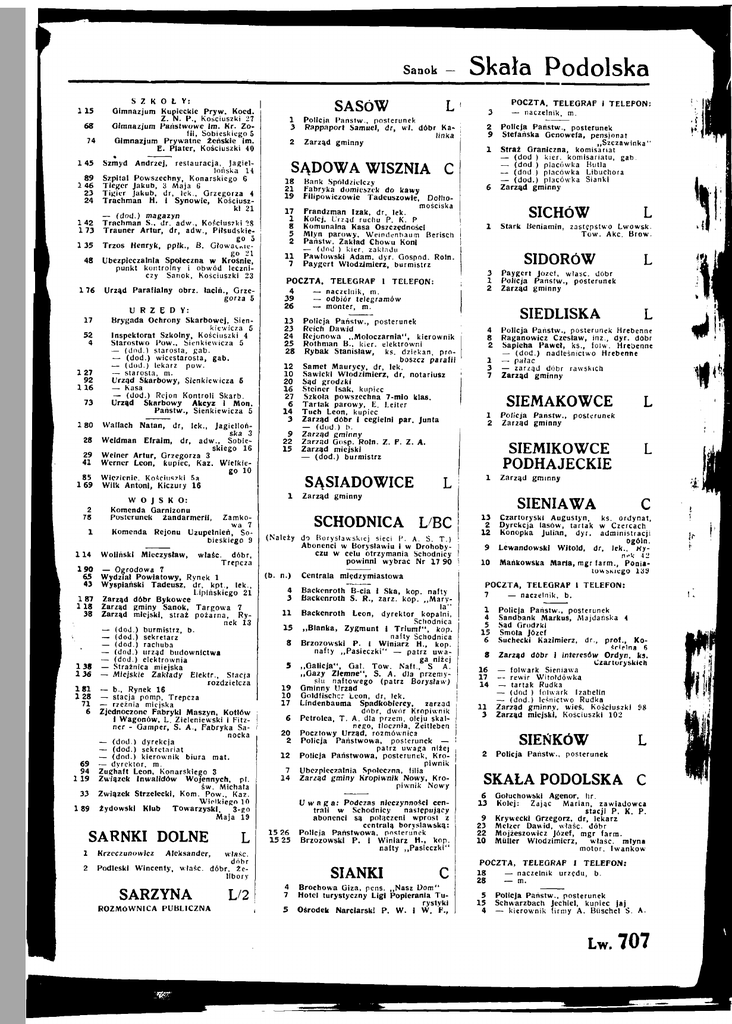 Sanok 115 68 74 145 89 146 23 24 142 175 135 48 176 17 52 4 127 92 116 73 180 28 29 41 85 169 2 78 1 114 1 90 65 43 . 187 118 38 138 136 181 1 28 71 6 69 94 119 33 189 S Z K O Ł Y : Gimnazjum Kupieckie P r y w . Koed. Z. N . P., Kościuszki 27 Gimnazjum P a ń s t w o w e i m . K r . Zo i l i , Sobieskiego 5 Gimnazjum P r y w a t n e ż e ń s k i e i m . E. Plater, Kościuszki 40 Szmyd restauracja, j a g i e l lońska 14 Szpital Powszechny, Konarskiego 6 Tleger Jakub, 3 M a j a 6 Tlgfer Jakub, d r , lek., Grzegorza 4 Trachman H. i Synowie, K o ś c i u s z k i 21 — ( d o d . ) magazyn Trachman S., d r , a d w . , Kościuszki 28 Trauner A r t u r , d r , a d w . , Piłsudskie go 5 Trzos Henryk, ppłk., 6. Gtowac.dego 21 Ubezpleczalnia Społeczna w Krośnie, punkt kontrolny i obwód leczni czy Sanok, Kościuszki 28 SASÓW Policja P a ń s t w . , posterunek Rappaport Samuel, d r , wł. dóbr 2 Z a r z ą d gminny Andrzej, Urząd Parafialny o b r z . l a c l ń . , Grze gorza 6 U R Z Ę D Y : Brygada Ochrony Skarbowej, Sien kiewicza 5 Inspektorat Szkolny, Kościuszki 4 Starostwo P o w . , Sienkiewicza 5 — ( d o d . ) starosta, gab. — ( d o d . ) wicestarosta, gab. — ( d o d . ) lekarz p o w . — starosta, m. Urząd Skarbowy, Sienkiewicza 5 — Kasa — ( d o d . ) Rejon K o n t r o l i Skarb. Urząd Skarbowy Akcyz i M o n . P a ń s t w . , Sienkiewicza 6 Wallach Jagielloń ska 3 a d w . , Sobie skiego 16 Weiner A r t u r , Orzegorza 3 Werner Leon, kupiec, Kaz. Wielkie go 10 Wlezienie. Kościuszki 5a Wilk A n t o n i , Klczury 16 Weldman Natan, dr, Efraim, lek.. dr, Komenda Rejonu Mieczysław, właśc. dóbr, Trepcza — Ogrodowa 7 Wydział P o w i a t o w y , Rynek 1 Wyspiański Tadeusz, d r , k p t . , l e k . , Lipińskiego 21 Zarząd dóbr Bykowce Zarząd gminy Sanok, T a r g o w a 7 Zarząd miejski, straż p o ż a r n a , Rynek 13 — ( d o d . ) burmistrz, b . — ( d o d . ) sekretarz — ( d o d . ) rachuba — ( d o d . ) urząd budownictwa — ( d o d . ) elektrownia — Strażnica miejska — Miejskie Z a k ł a d y E l e k t r . , Stacja rozdzielcza — b . . Rynek 16 — stacja pomp, Trepcza — rzeźnia miejska Zjednoczone Fabryki Maszyn, Kotłów I W a g o n ó w , L. Zieleniewski I Fitzner - Gamper, S. A . , Fabryka Sa nocka — ( d o d . ) dyrekcja — ( d o d . ) sekretariat — (dod.) kierownik biura mat. — dyrektor, m. Zughaft Leon, Konarskiego 3 Związek Inwalidów Wojennych, p l . ś w . Michała Związek Strzelecki, K o m . P o w . , Kaz. Wielkiego 10 żydowski Klub Towarzyski, 3-go M a j a 19 SARNKI DOLNE 1 Krzeczunowicz 2 Podleski L R O Z M Ó W N I C A PUBLICZNA 2 9 C 17 1 8 5 2 Frandzman i z a k , d r , l e k . K o l e j , Urząd ruchu P. K. P Komunalna Kasa Oszczędności Młyn p a r o w y , Welndenbaum Berisch P a ń s t w . Zakład Chowu Kon] — ( d o d . ) kier. zakładu P a w ł o w s k i A d a m , d y r . Gospod. R o l n . Paygert Włodzimierz, burmistrz 11 7 POCZTA, 4 — 39 — 26 — 13 23 24 25 28 12 10 20 16 27 6 14 3 9 22 15 6 gminny SCHODNICA ( b . n.) Centrala 5 Paygert Józef, w l a ś c . dóbr Policja P a ń s t w . , posterunek Z a r z ą d gminny 4 8 2 1 3 7 Policja P a ń s t w . , posterunek Hrebenne' Raganowies C z e s ł a w , i n ż . , d y r . dóbr Sapieha P a w e ł , k s . , f o l w . Hrebenne — ( d o d . ) nadleśnictwo Hrebenne — pałac — zarząd dóbr rawskich Z a r z ą d gminny 1 2 Policja Państw., Z a r z ą d gminny SIDORÓW SIEDLISKA L/BC 13 2 12 9 10 międzymiastowa U w a g a : Podczas nieczynnoścl cen< t r a l i w Schodnicy następujący abonenci są połączeni wprost z centralą boryslawską: Policja P a ń s t w o w a , posterunek Brzozowski P. I W i n i a r z H . , k o p . nafty „ P a s i e c z k i " SIANKI 4 7 3 1 2 1 Backenroth B-cla i Ska, kop. nafty Backenroth S. R., zarz. k o p . „ M a r y la" 1 1 Backenroth Leon, dyrektor k o p a l n i , Schodnlca 15 „ B l a n k a , Zygmunt i T r i u m f " , k o p . natty Schodnica 8 Brzozowski P. 1 W i n i a r z H . , k o p . nafty „ P a s i e c z k i " — patrz u w a ga niżej 5 „ G a l i c j a " , Gal. T o w . N a f t . , S. A. „ O a z y Z i e m n e " , S. A . dla przemy słu naftowego (patrz Borysiaw) 19 Omlnny Urząd 10 Goldfischcr Leon, d r , lek. 1 7 Lindenbauma Spadkobiercy, zarząd dóbr, dwór Kroplwnik 6 Petrolea, T . A. dla przem. oleju skal nego, tłocznia, Zeitleben 2 0 Pocztowy U r z ą d , rozmównica 2 Policja P a ń s t w o w a , posterunek — patrz uwaga niżej 1 2 Policja P a ń s t w o w a , posterunek, K r o plwnik 7 Ubezpleczalnia Społeczna, filia 14 Z a r z ą d gminy K r o p l w n i k Nowy, Kro plwnik N o w y C Brochowa Giza, pens. „ N a s z D o m " Hotel turystyczny L i g i Popierania T u rystyki Ośrodek Narciarski P. W . i W . F., L Stark Beniamin, zastępstwo L w o w s k . T o w . Akc. B r o w . L 4 3 15 26 15 25 SICHÓW Policja P a ń s t w . , posterunek Reich D a w i d Rejonowa „ M o l o c z a r n i a " , kierownik Rothman B., k i e r . elektrowni Rybak Stanisław, ks. dziekan, p r o boszcz p a r a f i i Samet M a u r y c y , d r , lek. Sawicki Włodzimierz, d r , notariusz Sąd grodzki Steiner Isak, kupiec S z k o ł a powszechna 7-mlo klas. T a r t a k p a r o w y , E. Lei ter T u c h L e o n , kupiec Z a r z ą d dóbr i cegielni p a r . Junta — (dod.) b. Z a r z ą d gminny Z a r z ą d Oosp. Roln. Z. F. Z . A . Z a r z ą d miejski — ( d o d . ) burmistrz Zarząd Policja P a ń s t w . , posterunek Stefańska Oenowefa, pensjonat „Szczawinka" S t r a ż Qranlczna, komisariat — ( d o d ) kier. komisariatu, gab. — ( d o d . ) placówka Butla — ( d o d . ) placówka Lłbuchora — ( d o d . ) placówka Siankl Z a r z ą d gminny 1 TELEGRAF 1 TELEFON: naczelnik, m . odbiór telegramów monter, m . SĄSIADOWICE POCZTA. TELEGRAF 1 T E L E F O N : — naczelnik, m . Dolliomościska (Należy do Boryslawskiej sieci P. A. S. T . ) Abonenci w Borysławia I w Drohoby czu w celu otrzymania Schodnlcy powinni 