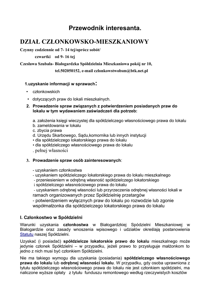 Przewodnik interesanta. DZIAŁ CZŁONKOWSKO-MIESZKANIOWY Czynny codziennie od 7- 14 tej/oprócz sobót/ czwartki od 9- 16 tej Czesława Szubała- Białogardzka Spółdzielnia Mieszkaniowa pokój nr 10, tel.502050152, e-mail [email protected] 1.uzyskanie informacji w sprawach: • członkowskich • dotyczących praw do lokali mieszkalnych. 2. Prowadzenie spraw związanych z potwierdzeniem posiadanych praw do lokalu w tym wydawaniem zaświadczeń dla potrzeb: a. założenia księgi wieczystej dla spółdzielczego własnościowego prawa do lokalu b. zameldowania w lokalu c. zbycia prawa d. Urzędu Skarbowego, Sądu,komornika lub innych instytucji • dla spółdzielczego lokatorskiego prawa do lokalu • dla spółdzielczego własnościowego prawa do lokalu . pełnej własności 3. Prowadzenie spraw osób zainteresowanych: - uzyskaniem członkostwa - uzyskaniem spółdzielczego lokatorskiego prawa do lokalu mieszkalnego - przeniesieniem w odrębną własność spółdzielczego lokatorskiego i spółdzielczego własnościowego prawa do lokalu - uzyskaniem odrębnej własności lub przyrzeczenia odrębnej własności lokali w ramach organizowanych przez Spółdzielnię przetargów - potwierdzeniem wyłącznych praw do lokalu po rozwodzie lub zgonie współmałżonka dla spółdzielczego lokatorskiego prawa do lokalu I. Członkostwo w Spółdzielni Warunki uzyskania członkostwa w Białogardzkiej Spódzielni Mieszkaniowej w Białogardzie oraz zasady wnoszenia wpisowego i udziałów określają postanowienia Statutu naszej Spółdzielni. Uzyskać (i posiadać) spółdzielcze lokatorskie prawo do lokalu mieszkalnego może jedynie członek Spółdzielni – w przypadku, jeżeli prawo to przysługuje małżonkom to jedno z nich musi być członkiem Spółdzielni. Nie ma takiego wymogu dla uzyskania (posiadania) spółdzielczego własnościowego prawa do lokalu lub odrębnej własności lokalu. W przypadku, gdy osoba uprawniona z tytułu spółdzielczego własnościowego prawa do lokalu nie jest członkiem spółdzielni, ma naliczone wyższe opłaty z tytułu funduszu remontowego według rzeczywistych kosztów Ubiegając się o członkostwo zainteresowany składa deklarację członkowską i zobowiązany jest do wniesienia: • wpisowego w wysokości – ¼ minimalnego wynagrodzenia za pracę, o którym mowa w ustawie o minimalnym wynagrodzeniu za pracę, • udziałów w i wysokości-1/2 minimalnego wynagrodzenia • wkładu mieszkaniowego lub budowlanego, • środków ponad wkład mieszkaniowy lub budowlany, o ile uzyskuje spółdzielcze prawo do lokalu w wyniku przetargu, • środków wymaganych przez Spółdzielnię – w przypadku ubiegania się członka o przeniesienie własności lokalu. Wpłaty należy dokonać na konto:PKO o/Białogard 23102028210000110200016733. Członkiem Spółdzielni może zostać współmałżonek nawet, jeżeli nie posiada On prawa do lokalu. Na uzyskanie członkostwa nie jest wymagana zgoda współmałżonka. Członkostwo nie daje większych praw do lokalu niż te, które już się posiada. Poprzez uzyskanie członkostwa, jako współmałżonek członka Spółdzielni nie można uzyskać praw do lokalu, jeżeli prawo to służy tylko drugiemu współmałżonkowi. Warunkiem uzyskania członkostwa przez osoby spełniające postanowienia Statutu BSM jest: 1. złożenie deklaracji członkowskiej, 2. dokonanie wpłaty wpisowego i udziałów członkowskich – na konto Spółdzielni 3. udokumentowanie braku zaległości w opłatach za lokal – jeżeli o członkostwo ubiega się współmałżonek członka Spółdzielni posiadającego prawo do lokalu lub osoba ubiegająca się o potwierdzenie praw do lokalu bądź ustanowienie spółdzielczego lokatorskiego prawa do lokalu po osobie bliskiej. II. Spółdzielcze lokatorskie prawo do lokalu Spółdzielcze lokatorskie prawo do lokalu mieszkalnego może posiadać osoba samotna, jeżeli zaś jest ono objęte wspólnością ustawową małżeńską to wówczas posiadają je oboje małżonkowie. Oboje małżonkowie posiadają prawo wówczas, jeżeli zostało ono przydzielone (zawarta została umowa o ustanowienie spółdzielczego lokatorskiego prawa) w czasie trwania związku małżeńskiego, bez względu na to, które z nich jest członkiem Spółdzielni i nawet wówczas, kiedy jeden z małżonków nie był umieszczony w przydziale (umowie). 1. W przypadku zgonu jednego z małżonków, jeżeli prawo należało do obojga – spółdzielcze lokatorskie prawo do lokalu mieszkalnego przypada w całości pozostałemu przy życiu drugiemu małżonkowi. Małżonek ten, jeżeli nie jest członkiem Spółdzielni, powinien w terminie 1 roku od dnia śmierci współmałżonka złożyć deklarację członkowską. Natomiast zgodnie z art. 14 ust. 2 Ustawy z dnia 15 grudnia 2000 r. o spółdzielniach mieszkaniowych wkład mieszkaniowy podlega dziedziczeniu. W przypadku więc jakichkolwiek zmian w prawie do lokalu należy udokumentować posiadanie wyłącznego prawa do wkładu (m.in. należy przedstawić postanowienie Sądu o nabyciu praw do spadku lub notarialny akt poświadczenia dziedziczenia po zmarłym małżonku i dokonać działu spadku – jeżeli jest kilku spadkobierców. 2. W przypadku zgonu członka Spółdzielni, któremu wyłącznie przysługiwało spółdzielcze lokatorskie prawo do lokalu – prawo to wygasa. Wówczas osoby bliskie mają roszczenie (zgodnie z art. 15 cyt. wyż. Ustawy o spółdzielniach mieszkaniowych) o przyjęcie w poczet członków Spółdzielni i zawarcie umowy o ustanowienie spółdzielczego lokatorskiego prawa do lokalu. Zainteresowany powinien udokumentować m.in.:1fakt, iż jest osobą bliską byłego członka Spółdzielni, 1. posiadanie wyłącznego prawa do całego wkładu mieszkaniowego – należy przedstawić postanowienie Sądu o nabyciu praw do spadku po zmarłym członku Spółdzielni lub notarialny akt poświadczenia dziedziczenia i jeżeli jest kilku spadkobierców – dokonać działu spadku