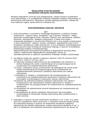 REGULAMIN DYSCYPLINARNY POLSKIEGO ZWIĄZKU SZACHOWEGO Niniejszy Regulamin normuje tryb postępowania i zasady karania uczestników życia szachowego, a w szczególności członków Polskiego Związku Szachowego za przewinienia dyscyplinarne. Regulamin określa katalog przewinień, rodzaje kar oraz właściwe organy uprawnione do orzekania kar. POSTANOWIENIA OGÓLNE. DEFINCJE §1 1. Przez dyscyplinę w rozumieniu niniejszego Regulaminu w Polskim Związku Szachowym - zwanym dalej „Związkiem” lub w skrócie „PZSzach”- należy pojmować przestrzeganie przez członków PZSzach oraz zawodników, sędziów, trenerów, instruktorów, działaczy szachowych, a także inne osoby i organizacje działające w strukturach PZSzach lub w inny sposób uczestniczące w życiu szachowym - statutu, uchwał, zarządzeń, regulaminów oraz innych przepisów nadrzędnych władz sportowych, w tym przepisów antydopingowych opracowanych przez Komisję do Zwalczania Dopingu w Sporcie na podstawie Światowego Kodeksu Antydopingowego. Odpowiedzialność dyscyplinarną określoną w Regulaminie ponoszą także rodzice i opiekunowie niepełnoletnich zawodników, którzy są zaewidencjonowani w rejestrze zawodników Polskiego Związku Szachowego. 2. Za doping uznaje się, zgodnie z Ustawą o sporcie z dnia 25 czerwca 2010 roku (Dz.U. 2010 nr 127 poz. 857): a) obecność substancji zabronionej lub jej metabolitów lub markerów w próbce fizjologicznej osoby uczestniczącej lub przygotowującej się do uczestnictwa we współzawodnictwie sportowym, b) użycie, usiłowanie użycia, pomocnictwo lub podżeganie do użycia przez osobę uczestniczącą lub przygotowującą się do uczestnictwa we współzawodnictwie sportowym substancji zabronionej lub metody zabronionej, c) posiadanie w związku z uczestnictwem lub przygotowaniem do uczestnictwa we współzawodnictwie sportowym substancji zabronionej lub przyrządów umożliwiających stosowanie metody zabronionej, d) podanie lub usiłowanie podania substancji zabronionej oraz udział w przygotowaniu lub zastosowaniu metody zabronionej w związku z uczestnictwem lub przygotowaniem do uczestnictwa we współzawodnictwie sportowym, e) utrudnianie lub udaremnianie kontroli dopingowej lub manipulowanie jej przebiegiem, f) wprowadzanie do obrotu substancji zabronionych lub przyrządów umożliwiających stosowanie metody zabronionej albo uczestniczenie w takim obrocie. 3. Dopingiem w sporcie nie jest zachowanie określone w ust. 2 pkt. a-d, jeżeli jest ono uzasadnione celem leczniczym, a zawodnik otrzymał zgodę Komisji do Zwalczania Dopingu w Sporcie na stosowanie określonej substancji zabronionej lub metody zabronionej, a także zachowanie określone w ust. 2 pkt 6 w odniesieniu do produktów leczniczych dopuszczonych do obrotu na zasadach przewidzianych w ustawie z dnia 6 września 2001 r. Prawo farmaceutyczne (Dz.U. 2008 nr 45 poz. 271). 4. Substancją zabronioną jest substancja mogąca służyć poprawie wyniku sportowego, której użycie pozostaje w sprzeczności z uczciwością rywalizacji sportowej, określona w załączniku nr 1 do Międzynarodowej Konwencji o Zwalczaniu Dopingu w Sporcie, sporządzonej w Paryżu w dniu 19 października 2005 r. oraz jego zmianach dokonanych w trybie art. 34 tej konwencji. 5. Metodą zabronioną jest działanie mogące służyć poprawie wyniku sportowego, pozostające w sprzeczności z uczciwością rywalizacji sportowej, określone w załączniku nr 1 do konwencji, o której mowa w ust. 4, oraz jego zmianach dokonanych w trybie art. 34 tej konwencji. Metodą zabronioną jest także korzystanie z dopingu elektronicznego, czyli pomocy zewnętrznej z wykorzystaniem środków łączności lub komputera. 6. Substancją lub metodą zabronioną jest także substancja lub działanie utrudniające wykrycie substancji lub metody określonej w ust. 4 i 5, określone w załączniku nr 1 do konwencji, o której mowa w ust. 3, oraz jego zmianach dokonanych w trybie art. 34 tej konwencji. §2 Przewinieniem dyscyplinarnym w rozumieniu niniejszego Regulaminu jest naruszenie przepisów określonych w § 1, norm etycznych obowiązujących w sporcie, naruszenie zasad współżycia społecznego, a także naruszenie innych obowiązujących przepisów, jeżeli czyn pozostaje w związku z uczestnictwem w ruchu sportowym. §3 Postępowanie dyscyplinarne wszczyna się w przypadku ujawnienia wykroczenia dyscyplinarnego, niezależnie od innego postępowania toczącego się przeciwko obwinionemu poza ruchem sportowym. ZADANIA STATUTOWE ZWIĄZKU 1. 2. 3. 4. §4 Zadania statutowe PZSzach - w zakresie postępowania dyscyplinarnego realizowane są przez Komisję Wyróżnień i Dyscypliny składającą się z pięciu osób: przewodniczącego i członków komisji, których powołuje i odwołuje zarząd PZSzach większością głosów. Komisja rozpatruje przewinienia dyscyplinarne i orzeka w trzyosobowym składzie, a w przypadku nieobecności członka komisji z przyczyn losowych lub innych uzupełnia się z pozostałego składu lub prezes PZSzach, na wniosek przewodniczącego komisji, doraźnie uzupełnia skład orzekający o dodatkową osobę. Komisja Wyróżnień i Dyscypliny, za zgodą zarządu PZSzach, ma prawo upoważnić inne komisje Związku do orzekania jako I instancja w zakresie spraw właściwych dla danej komisji. Organem właściwym do wypowiadania się w zakresie przepisów gry jest Kolegium Sędziów PZSzach. Ponadto do orzekania w sprawach przewinień dyscyplinarnych uprawnione są następujące organy: a) zarządy klubów i sekcji szachowych, b) zarządy wojewódzkich związków szachowych. 5. Do rozpatrywania przewinień dyscyplinarnych organy wymienione w ust. 2, 3 i 4 powołują zespoły orzekające, składające się z trzech osób oraz wyznaczają przewodniczącego zespołu. Zespół działa w imieniu właściwego organu. 6. Przewodniczący Komisji Wyróżnień i Dyscypliny PZSzach, jak również przewodniczący zespołu orzekającego 