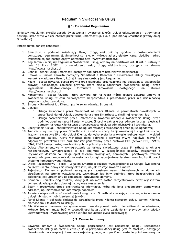 Regulamin Świadczenia Usług § 1. Przedmiot Regulaminu Niniejszy Regulamin określa zasady świadczenia i gwarancji jakości Usługi udostępnienia i utrzymania hostingu stron www w sieci internet przez firmę Smarthost Sp. z o. o. pod marką Smarthost (zwany dalej Smarthost). Pojęcia użyte poniżej oznaczają: 1. 2. 3. 4. 5. 6. 7. 8. 9. 10. 11. 12. 13. 14. 15. 16. 17. 18. Smarthost - podmiot świadczący Usługi drogą elektroniczną zgodnie z postanowieniami poniższego regulaminu, tj. Smarthost sp. z o. o., którego adresy elektroniczne, siedziba i adres wskazane są pod następującym adresem: http://www.smarthost.pl. Regulamin - niniejszy Regulamin Świadczenia Usług, wydany na podstawie art. 8 ust. 1 ustawy z dnia 18 lipca 2002 r. o świadczeniu usług drogą elektroniczną, dostępny na stronie http://www.smarthost.pl Cennik - cennik usług Smarthost, dostępny pod adresem http://www.smarthost.pl Umowa – umowa zawarta pomiędzy Smarthost a Klientem o świadczenie Usługi określająca warunki świadczenia Usługi, której integralną częścią jest Regulamin. Klient - osoba fizyczna, osoba prawna oraz jednostka organizacyjna nie posiadająca osobowości prawnej, posiadająca zdolność prawną, która zleciła Smarthost świadczenie Usługi przez wypełnienie elektronicznego formularza zamówienia dostępnego na stronie http://www.smarthost.pl Konsument - osoba fizyczna, która zawiera lub na rzecz której została zawarta umowa o świadczenie usług, w celu niezwiązanym bezpośrednio z prowadzoną przez nią działalnością gospodarczą lub zawodową. Strona – Smarthost lub Klient, łącznie zwani również Stronami. Usługa: • Usługa świadczona przez Smarthost na rzecz Klienta, o parametrach określonych w specyfikacji danej Usługi, udostępniana przez Smarthost w chwili jej rejestracji lub • Usługa pośredniczenia przez Smarthost w zawarciu umowy o świadczenie Usługi przez podmiot trzeci na rzecz Klienta, w szczególności w zakresie pośredniczenia przy rejestracji domeny na rzecz Klienta wraz z towarzyszącą obsługą administracyjną i techniczną. Specyfikacja Usługi - charakterystyka Usługi oferowanej i świadczonej przez jej usługodawcę. Transfer - wyznaczony przez Smarthost i zawarty w specyfikacji określonej Usługi limit ruchu, liczony na warstwie IP z i do Usługi Klienta, do wykorzystania w okresie rozliczeniowym; w skład limitowanego pakietu ruchu wchodzą: dane pobrane z serwera WWW, nagłówki zapytań i odpowiedzi protokołu HTTP oraz transfer generowany przez protokół FTP (serwer FTP), SMTP, IMAP, POP3 i innych usług uruchomionych na potrzeby Klienta. Opłata Abonamentowa – wynagrodzenie za usługę świadczoną przez Smarthost w okresie rozliczeniowym. Wynagrodzenie to nie obejmuje w szczególności kosztów związanych z uzyskaniem dostępu do Usługi, opłat telekomunikacyjnych, bankowych i pocztowych, zakupu sprzętu lub oprogramowania do korzystania z Usługi, zaprojektowania stron www lub konfiguracji systemu komputerowego Klienta. Okres Rozliczeniowy - okres , w jakim Smarthost rozlicza wynagrodzenie za Usługę świadczoną na rzecz Klienta, domyślnie równy okresowi, na jaki zostaje zawarta Umowa. Rejestrator Domen - podmiot zarządzający rejestrem nazw internetowych w domenach określonych na stronie www.iana.org, www.dns.pl lub inny podmiot, który bezpośrednio lub pośrednio jest uprawniony do rejestracji i utrzymania domeny. Domena - unikalny ciąg znaków, który jest lub może zostać zarejestrowany przez rejestratora domen, składający się z obranej nazwy oraz rozszerzenia. Spam - przesyłana drogą elektroniczną informacja, która nie była przedmiotem zamówienia adresata, np. niezamówiona informacja handlowa. Awaria - nieprawidłowość świadczenia Usługi przez Smarthost skutkująca przerwą w świadczeniu Usługi lub istotnym obniżeniem jej jakości. Panel Klienta – aplikacja służąca do zarządzania przez Klienta statusem usług, danymi Klienta, płatnościami i fakturami za Usługi, Siła Wyższa – zdarzenie zewnętrzne niemożliwe do przewidzenia i niemożliwe do zapobieżenia, którego źródłem może być w szczególności katastrofalne działanie sił przyrody, akty władzy ustawodawczej i wykonawczej oraz niektóre zaburzenia życia zbiorowego; § 2. Zawarcie umowy 1. Zawarcie umowy o świadczenie Usługi poprzedzone jest rejestracją Usługi. Rozpoczęcie świadczenia Usługi na rzecz Klienta (o ile w przypadku danej Usługi jest to możliwe), następuje niezwłocznie po akceptacji formularza rejestracyjnego, o czym Klient zostanie poinformowany na adres e-mail wskazany w formularzu rejestracyjnym, na okres testowy 14 dni. Okres testowy służy zapoznaniu się przez Klienta z funkcjonalnością danej Usługi. 2. W momencie aktywowania Usługi zostaje wystawiona faktura proforma tytułem utrzymania Usługi dostępna w panelu klienta. 3. Limit transferu możliwy do osiągnięcia w trakcie trwania okresu próbnego mierzony na warstwie IP w kierunku z i do Usługi nie może przekroczyć 10GB danych. Smarthost zastrzega sobie prawo wprowadzenia limitu wysyłanych wiadomości email przy wykorzystaniu Usługi, ograniczając liczbę wiadomości e-mail do 50 w ciągu godziny w trakcie trwania okresu próbnego. 4. Zawarcie umowy o świadczenie usług następuje z chwilą wpływu na rachunek bankowy Smarthost opłaty abonamentowej w pełnej wysokości, na warunkach określonych w niniejszym Regulaminie, ofercie Smarthost zawierającej Cennik i Specyfikację Usług, w Regulaminach konkretnych usług oraz w Regulaminach promocyjnych. 5. Wysokość pierwszej opłaty abonamentowej wynika z Cennika obowiązującego w dniu rejestracji, zaś w przypadku opłat abonamentowych za kolejne okresy rozliczeniowe z Cennika obowiązującego w 28. dniu przed zakończeniem poprzedniego okresu rozliczeniowego. Wszelkie późniejsze zmiany Cennika nie mają wpływu na wysokość opłaty abonamentowej za dany okres