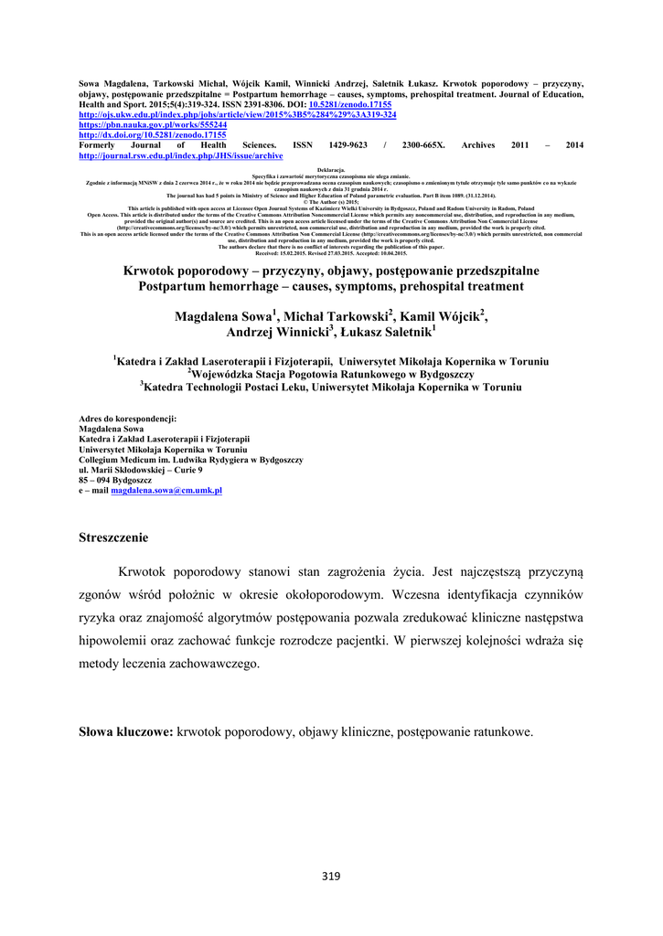 Sowa Magdalena, Tarkowski Michał, Wójcik Kamil, Winnicki Andrzej, Saletnik Łukasz. Krwotok poporodowy – przyczyny, objawy, postępowanie przedszpitalne = Postpartum hemorrhage – causes, symptoms, prehospital treatment. Journal of Education, Health and Sport. 2015;5(4):319-324. ISSN 2391-8306. DOI: 10.5281/zenodo.17155 http://ojs.ukw.edu.pl/index.php/johs/article/view/2015%3B5%284%29%3A319-324 https://pbn.nauka.gov.pl/works/555244 http://dx.doi.org/10.5281/zenodo.17155 Formerly Journal of Health Sciences. ISSN 1429-9623 / 2300-665X. Archives 2011 – 2014 http://journal.rsw.edu.pl/index.php/JHS/issue/archive Deklaracja. Specyfika i zawartość merytoryczna czasopisma nie ulega zmianie. Zgodnie z informacją MNiSW z dnia 2 czerwca 2014 r., że w roku 2014 nie będzie przeprowadzana ocena czasopism naukowych; czasopismo o zmienionym tytule otrzymuje tyle samo punktów co na wykazie czasopism naukowych z dnia 31 grudnia 2014 r. The journal has had 5 points in Ministry of Science and Higher Education of Poland parametric evaluation. Part B item 1089. (31.12.2014). © The Author (s) 2015; This article is published with open access at Licensee Open Journal Systems of Kazimierz Wielki University in Bydgoszcz, Poland and Radom University in Radom, Poland Open Access. This article is distributed under the terms of the Creative Commons Attribution Noncommercial License which permits any noncommercial use, distribution, and reproduction in any medium, provided the original author(s) and source are credited. This is an open access article licensed under the terms of the Creative Commons Attribution Non Commercial License (http://creativecommons.org/licenses/by-nc/3.0/) which permits unrestricted, non commercial use, distribution and reproduction in any medium, provided the work is properly cited. This is an open access article licensed under the terms of the Creative Commons Attribution Non Commercial License (http://creativecommons.org/licenses/by-nc/3.0/) which permits unrestricted, non commercial use, distribution and reproduction in any medium, provided the work is properly cited. The authors declare that there is no conflict of interests regarding the publication of this paper. Received: 15.02.2015. Revised 27.03.2015. Accepted: 10.04.2015. Krwotok poporodowy – przyczyny, objawy, postępowanie przedszpitalne Postpartum hemorrhage – causes, symptoms, prehospital treatment Magdalena Sowa1, Michał Tarkowski2, Kamil Wójcik2, Andrzej Winnicki3, Łukasz Saletnik1 1 Katedra i Zakład Laseroterapii i Fizjoterapii, Uniwersytet Mikołaja Kopernika w Toruniu 2 Wojewódzka Stacja Pogotowia Ratunkowego w Bydgoszczy 3 Katedra Technologii Postaci Leku, Uniwersytet Mikołaja Kopernika w Toruniu Adres do korespondencji: Magdalena Sowa Katedra i Zakład Laseroterapii i Fizjoterapii Uniwersytet Mikołaja Kopernika w Toruniu Collegium Medicum im. Ludwika Rydygiera w Bydgoszczy ul. Marii Skłodowskiej – Curie 9 85 – 094 Bydgoszcz e – mail [email protected] Streszczenie Krwotok poporodowy stanowi stan zagrożenia życia. Jest najczęstszą przyczyną zgonów wśród położnic w okresie okołoporodowym. Wczesna identyfikacja czynników ryzyka oraz znajomość algorytmów postępowania pozwala zredukować kliniczne następstwa hipowolemii oraz zachować funkcje rozrodcze pacjentki. W pierwszej kolejności wdraża się metody leczenia zachowawczego. Słowa kluczowe: krwotok poporodowy, objawy kliniczne, postępowanie ratunkowe. 319 Abstract Postpartum hemorrhage is a life-threatening condition. It’s the most common cause of death among parturient women in the perinatal period. Early identification of risk factors and the knowledge regarding the algorithms of conduct allow for reduction of the clinical consequences of hypovolemia and for preserving patient’s reproductive functions. In the first place, the methods of conservative treatment are implemented. Key words: postpartum hemorrhage, clinical symptoms, rescue procedure. Wstęp Powikłania poporodowe stanowią główną przyczynę zgonów wśród kobiet w wieku rozrodczym. Według danych statystycznych Światowej Organizacji Zdrowia, krwotok poporodowy występuje u około 10,5% kobiet w okresie poporodowym i jest najczęstszą przyczyną śmierci młodych matek [1]. Krwotok poporodowy można podzielić na pierwotny i wtórny. Krwotoki pierwotne mają miejsce, gdy do nadmiernej utraty krwi z dróg rodnych dochodzi do 24 godzin po porodzie, najczęściej są skutkiem atonii macicy. Nadmierne krwawienie z dróg rodnych po 24 godzinach od momentu ukończenia porodu do 6 tygodnia, definiuje się jako wtórny krwotok poporodowy. Późne krwawienia poporodowe najczęściej występują pomiędzy 8. a 14. dobą po porodzie. Zgodnie z definicją, wizualna utrata krwi około 500 ml po porodzie fizjologicznym oraz 1000 ml po porodzie zabiegowym pozwala rozpoznać krwotok. Dokładne określenie ilości utraconej krwi jest często subiektywne. Należy jednak pamiętać, że krwotokiem poporodowym jest każde krwawienie, które przyczyniło się do zaburzeń hemodynamicznych u pacjentki [1,2,3]. 320 Czynniki ryzyka wystąpienia krwotoku poporodowego Czynniki ryzyka wystąpienia krwotoków poporodowych podzielono na wczesne oraz późne. Do wczesnych zalicza się przede wszystkim atonię macicy, urazy okołoporodowe w obrębie dróg rodnych oraz wynicowanie macicy. Wśród czynników etiologicznych powodujących krwotoki późne znajdują się pozostałości łożyska w jamie macicy oraz infekcje [4]. Przyczyny krwotoków poporodowych określa się za pomocą akronimu „4T”: Tonus (napięcie) Nadmierne rozciągnięcie mięśnia macicy może być spowodowane przez makrosomię płodu, wielowodzie, ciążę wielopłodową, wady płodu, mięśniaki macicy, infekcje, leki rozkurczające macicę (beta – mimetyki, nifedypina, środki anestetyczne). Tissue (tkanki) Niekompletne oddzielenie popłodu (łożyska oraz błon płodowych) może być przyczyną krwotoku