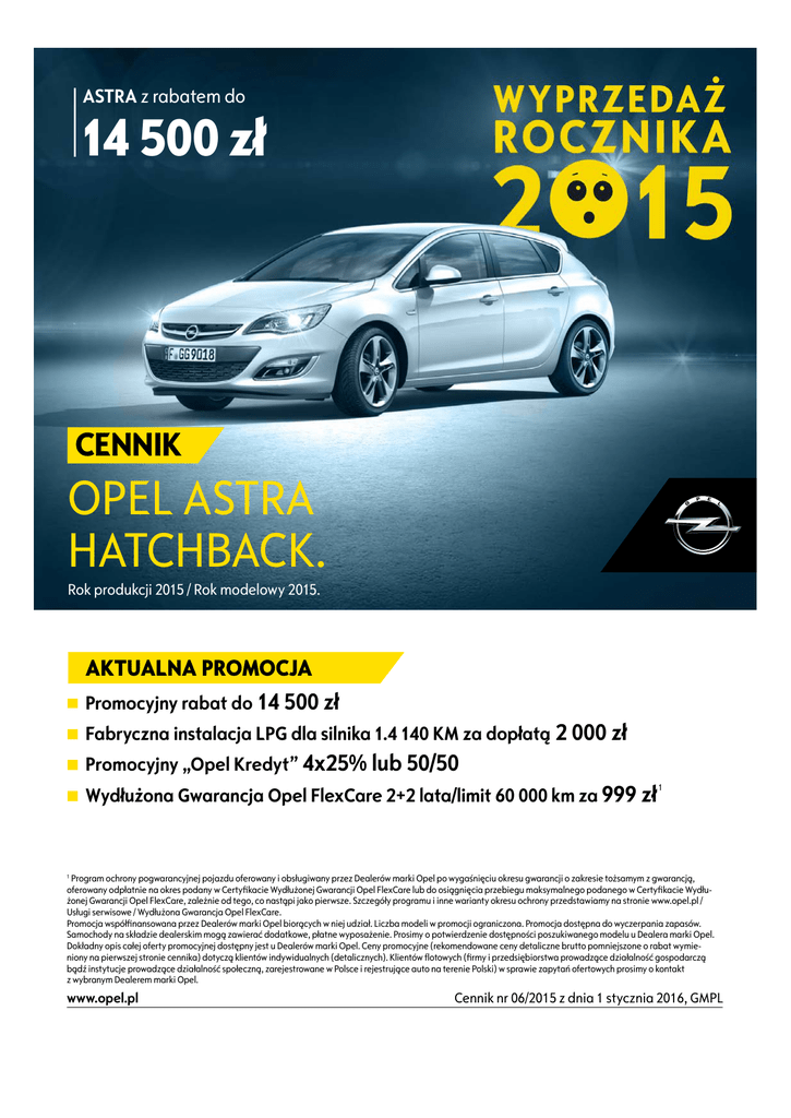 ASTRA z rabatem do 14 500 zł CENNIK OPEL ASTRA HATCHBACK. Rok produkcji 2015 / Rok modelowy 2015. AKTUALNA PROMOCJA Promocyjny rabat do 14 500 zł Fabryczna instalacja LPG dla silnika 1.4 140 KM za dopłatą 2 000 zł Promocyjny „Opel Kredyt” 4x25% lub 50/50 Wydłużona Gwarancja Opel FlexCare 2+2 lata/limit 60 000 km za 999 zł 1 Program ochrony pogwarancyjnej pojazdu oferowany i obsługiwany przez Dealerów marki Opel po wygaśnięciu okresu gwarancji o zakresie tożsamym z gwarancją, oferowany odpłatnie na okres podany w Certyfikacie Wydłużonej Gwarancji Opel FlexCare lub do osiągnięcia przebiegu maksymalnego podanego w Certyfikacie Wydłużonej Gwarancji Opel FlexCare, zależnie od tego, co nastąpi jako pierwsze. Szczegóły programu i inne warianty okresu ochrony przedstawiamy na stronie www.opel.pl / Usługi serwisowe / Wydłużona Gwarancja Opel FlexCare. Promocja współfinansowana przez Dealerów marki Opel biorących w niej udział. Liczba modeli w promocji ograniczona. Promocja dostępna do wyczerpania zapasów. Samochody na składzie dealerskim mogą zawierać dodatkowe, płatne wyposażenie. Prosimy o potwierdzenie dostępności poszukiwanego modelu u Dealera marki Opel. Dokładny opis całej oferty promocyjnej dostępny jest u Dealerów marki Opel. Ceny promocyjne (rekomendowane ceny detaliczne brutto pomniejszone o rabat wymieniony na pierwszej stronie cennika) dotyczą klientów indywidualnych (detalicznych). Klientów flotowych (firmy i przedsiębiorstwa prowadzące działalność gospodarczą bądź instytucje prowadzące działalność społeczną, zarejestrowane w Polsce i rejestrujące auto na terenie Polski) w sprawie zapytań ofertowych prosimy o kontakt z wybranym Dealerem marki Opel. 1 www.opel.pl Cennik nr 06/2015 z dnia 1 stycznia 2016, GMPL Cennik – Opel Astra Hatchback Rok produkcji 2015, rok modelowy 2015 Ceny promocyjne* Essentia Enjoy Cosmo 1.4 Twinport 100 KM M5 49 400 53 300 – 1.6 Twinport 115 KM M5 52 400 56 300 62 050 1.6 Twinport 115 KM A6 – 61 300 67 050 1.4 Turbo 120 KM** M6 55 400 59 300 65 050 1.4 Turbo 140 KM** M6 57 400 61 300 67 050 1.4 Turbo 140 KM A6 – 66 300 72 050 1.4 Turbo 140 KM LPGTEC M6 60 800 63 300 69 050 1.6 Turbo 170 KM Start/Stop M6 – – 74 200 1.6 Turbo 170 KM A6 – – 77 800 1.6 CDTI 110 KM Start/Stop M6 64 200 68 100 73 850 1.6 CDTI 136 KM Start/Stop M6 – 70 500 76 250 2.0 CDTI 165 KM** M6 – – 80 150 A6 – – 85 150 2.0 CDTI 165 KM 1 1 * Promocja współfinansowana przez Dealerów marki Opel biorących w niej udział. * Liczba modeli w promocji ograniczona. Promocja dostępna do wyczerpania zapasów. Samochody na składzie dealerskim mogą zawierać dodatkowe, płatne wyposażenie. Prosimy o potwierdzenie dostępności poszukiwanego modelu u Dealera marki Opel. Dokładny opis całej oferty promocyjnej dostępny jest u Dealerów marki Opel. Ceny promocyjne (rekomendowane ceny detaliczne brutto pomniejszone o rabat wymieniony na pierwszej stronie cennika) dotyczą klientów indywidualnych (detalicznych). Klientów flotowych (firmy i przedsiębiorstwa prowadzące działalność gospodarczą bądź instytucje prowadzące działalność społeczną, zarejestrowane w Polsce i rejestrujące auto na terenie Polski) w sprawie zapytań ofertowych prosimy o kontakt z wybranym Dealerem marki Opel. Ceny katalogowe Essentia Enjoy Cosmo 1.4 Twinport 100 KM M5 63 900 67 800 – 1.6 Twinport 115 KM M5 66 900 70 800 76 550 1.6 Twinport 115 KM A6 – 75 800 81 550 1.4 Turbo 120 KM** M6 69 900 73 800 79 550 1.4 Turbo 140 KM** M6 71 900 75 800 81 550 1.4 Turbo 140 KM A6 – 80 800 86 550 1.4 Turbo 140 KM LPGTEC M6 78 300 80 800 86 550 1.6 Turbo 170 KM Start/Stop M6 – – 88 700 1.6 Turbo 170 KM A6 – – 92 300 1.6 CDTI 110 KM Start/Stop M6 78 700 82 600 88 350 1.6 CDTI 136 KM Start/Stop M6 – 85 000 90 750 2.0 CDTI 165 KM** 1 M6 – – 94 650 2.0 CDTI 165 KM 1 A6 – – 99 650 ** Silnik dostępny z systemem Start/Stop – dopłata 1 400 zł (dla silników 1.4 Turbo 120 KM i 140 KM niedostępny dla wersji Essentia). 1 Silnik produkowany tylko do końca marca 2015 r. p – dopłata 1 200 zł (nie dotyczy wersji Essentia). Cennik Opla Astry Hatchback, rok produkcji 2015, rok modelowy 2015A, nr 06/2015 z dnia 1 stycznia 2016 1/4 Wyposażenie standardowe Tapicerka materiałowa, czarna Układ stabilizacji toru jazdy ESP z TCS i ABS Przednie i boczne poduszki powietrzne dla kierowcy i pasażera Klimatyzacja sterowana ręcznie Radioodtwarzacz CD/MP3 300 z 4 głośnikami Elektrycznie sterowane przednie szyby Elektrycznie sterowane i podgrzewane lusterka zewnętrzne w kolorze nadwozia Felgi stalowe 16" System monitorujący ciśnienie w oponach Światła do jazdy dziennej Fotel kierowcy z regulacją wysokości Tylne siedzenia dzielone w proporcji 40/60 Kolumna kierownicy regulowana w pionie i poziomie Zaczepy Isofix w oparciach tylnych zewnętrznych siedzeń Kurtynowe poduszki powietrzne dla kierowcy i pasażerów Aktywne zagłówki foteli przednich Radioodtwarzacz CD/MP3 400 z 6 głośnikami Wejście USB (niedostępne dla radioodtwarzacza UYB ) Portal telefonu komórkowego Bluetooth Zawiera: Pakiet Oświetlenia Wnętrza. (wymaga radioodtwarzacza UZZ, UNM, UYN lub UHR). Kierownica pokryta skórą Przyciski sterowania na kierownicy Komputer pokładowy Tempomat z ogranicznikiem prędkości Felgi aluminiowe 16" Tapicerka materiałowa z elementami ze sztucznej skóry, czarna, szaro-czarna lub brązowa (dostępność zależna od koloru nadwozia) Klimatyzacja sterowana elektronicznie dwustrefowa Czujniki parkowania, przód i tył Elektrycznie sterowane tylne szyby Reflektory przeciwmgielne Felgi aluminiowe 17" Układ wspomagania ruszania pod górę Konsola centralna z przesuwanym podłokietnikiem i zamykanym schowkiem Pakiet Oświetlenia Wnętrza (lampki do czytania z tyłu, podświetlane lusterka w osłonach przeciwsłonecznych) Chromowane zewnętrzne listwy dookoła okien bocznych Tapicerka materiałowa, czarna, z ergonomicz