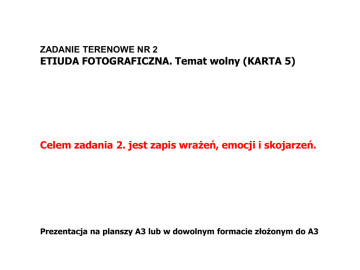 ZADANIE TERENOWE NR 2 ETIUDA FOTOGRAFICZNA. Temat wolny (KARTA 5) Celem zadania 2. jest zapis wrażeń, emocji i skojarzeń. Prezentacja na planszy A3 lub w dowolnym formacie złożonym do A3 ZADANIE TERENOWE NR 3 UŻYTKOWANIE TERENU (KARTA 6) Zebranie informacji do planszy w skali 1:5000 „Użytkowanie terenu” UŻYTKOWANIE TERENU LEGENDA granice własności i użytkowania tereny zabudowy usługowej tereny zabudowy rolniczej tereny zabudowy jednorodzinnej drogi lasy (ciemna zieleń) łąki, pastwiska (jasna zieleń) grunty orne woda bagna, nieużytki, skala 1: 5000 Dla pozostałych rodzajów użytkowania (np. tereny składowe, sady itp.) należy przyjąć oznaczenia wg załączonych na stronie materiałów źródłowych Imiona i nazwiska autorów opracowania rok akademicki 2015/2016 6 MAPA w NOTATNIKU MOŻE BYĆ ZŁOŻONA DO FORMATU A3 LUB MOŻE BYĆ SKANEM MAPY W SKALI 1:5000 ZADANIE TERENOWE NR 4 INWENTARYZACJA ZAGOSPODAROWANIA CENTRUM WSI (KARTY 7- 12) 1. Zebranie informacji do planszy w skali 1:1000 „Inwentaryzacja zagospodarowania centrum wsi”. 2. Wykonanie zestawów zdjęć: Budynki, Ulice i place, Ogrody i ogródki, Faktury Miejsca wykonania i kierunki wszystkich zdjęć powinny być naniesione na „czystą” matrycę w skali 1:1000 – KARTA 8 Wszystkie zdjęcia muszą być ponumerowane zgodnie z opisem na planszy. INWENTARYZACJA ZAGOSPODAROWANIA CENTRUM WSI LEGENDA granice działek krawędzie dróg drzewa krzewy woda budynki i ich funkcje (kolor lub opis): b. mieszkalne niskie (MN) b. mieszkalne wysokie (MW) b. gospodarcze (g) b. usługowe (kościół, szkoła, apteka) b. inwentarskie (i) Korony drzew na mapie powinny być narysowane w skali skala 1:1000 inne sposoby zagospodarowania terenu (ozn. graficzne lub kolor): ogrodzenia, ogrody, sady, kapliczki, krzyże przydrożne, …………itp. Autorzy opracowania rok akademicki 2015/2016 7 MAPA w NOTATNIKU MOŻE BYĆ ZŁOŻONA DO FORMATU A3 LUB MOŻE BYĆ SKANEM MAPY W SKALI 1:1000 LEGENDA DO INWENTARYZACJI ZAGOSPODAROWANIA Do uzupełnienia o: ogród ozdobny ogród warzywny sad mur płot sztachetowy ogrodzenie z siatki itp bramy i furtki kapliczka przydrożna ……………………i inne…… Legenda „Inwentaryzacji” powinna być uzupełniona o niewymienione elementy obecne w terenie oraz uporządkowana wg kategorii: zabudowa, komunikacja, zieleń, ocena stanu zabudowy, inne Przykład czytelnej grafiki INWENTARYZACJA ZAGOSPODAROWANIA CENTRUM WSI BUDYNKI miniatury zdjęć ponumerowane wg oznaczeń na mapie Karta 8 TYP 1 CECHY TYPU 1 TYP 2 CECHY TYPU 2 TYP 3 CECHY TYPU 3 TYP 4 CECHY TYPU 4 Autorzy opracowania rok akademicki 2015/2016 ILOŚĆ TYPÓW BUDYNKÓW I ILOŚĆ KART ZALEŻNA OD ZASOBÓW MIEJSCOWOŚCI 9 INWENTARYZACJA ZAGOSPODAROWANIA CENTRUM WSI ULICE I PLACE miniatury zdjęć ponumerowane wg oznaczeń na mapie Karta 8 ULICA TYP 1 CECHY TYPU 1 ULICA TYP 2 CECHY TYPU 2 PLAC TYP 1 CECHY TYPU 1 PLAC TYP 2 CECHY TYPU 2 Autorzy opracowania rok akademicki 2015/2016 ZDJĘCIA POWINNY UKAZYWAĆ PRZESTRZEŃ – NIE NAWIERZCHNIE – ULIC I PLACÓW ILOŚĆ TYPÓW ULIC I PLACÓW I ILOŚĆ KART ZALEŻNA OD ZASOBÓW MIEJSCOWOŚCI 10 INWENTARYZACJA ZAGOSPODAROWANIA CENTRUM WSI OGRODY I OGRÓDKI miniatury zdjęć ponumerowane wg oznaczeń na mapie Karta 8 OGRÓD TYP 1 DOMINUJĄCE GATUNKI I ICH FORMY ARTEFAKTY Autorzy opracowania rok akademicki 2015/2016 ILOŚĆ TYPÓW OGRODÓW I ILOŚĆ KART ZALEŻNA OD ZASOBÓW MIEJSCOWOŚCI 11 INWENTARYZACJA ZAGOSPODAROWANIA CENTRUM WSI FAKTURY/MATERIAŁY miniatury zdjęć ponumerowane wg oznaczeń na mapie Karta 8 KAŻDA FAKTURA/MATERIAŁ MUSI BYĆ OPISANA Autorzy opracowania rok akademicki 2015/2016 ILOŚĆ FAKTUR I ILOŚĆ KART ZALEŻNA OD ZASOBÓW MIEJSCOWOŚCI 12 ZADANIE TERENOWE NR 6 ZAPIS WYWIADÓW Z MIESZKAŃCAMI i CODZIENNYCH ZDARZEŃ (KARTY 13-15) 1. Przeprowadzić wywiady z mieszkańcami na temat wsi. Wywiady najlepiej nagrywać i w późniejszym terminie dokonać ich transkrypcji z podaniem imienia, wieku i wykonywanego zawodu osoby pytanej. Można też poprosić o wykonanie szkicu wsi z zaznaczeniem ważnych miejsc. Zapisy wywiadów i rysunki mieszkańców powinny być integralną częścią Notatnika na dowolnej liczbie kart (karty 13,14,…). Przykładowe pytania: 1. Gdzie i jak spędzasz wolny czas? 2. Jakie miejsca podobają ci się w twojej miejscowości/co ci się nie podoba? 3. Co ciekawego można zobaczyć w twojej miejscowości? 4. Co uprzykrza życie mieszkańcom? 5. Czego brakuje w miejscowości? 6.W jakich wydarzeniach z życia wsi lubisz uczestniczyć? 7.Co chciałbyś zmienić w swojej miejscowości? 2. Zrobić zdjęcia ukazujące mieszkańców przy ich codziennych zajęciach (chodzenie i przystawanie to też „zajęcia”). CODZIENNE ZDARZENIA miniatury zdjęć ponumerowane wg oznaczeń na mapie Karta 8 KAŻDE UJĘCIE MUSI BYĆ OPISANE ILOŚĆ „ZDARZEŃ” ZALEŻNA OD OBSERWACJI AUTORÓW Autorzy opracowania rok akademicki 2015/2016 15 ZADANIE TERENOWE NR 7 PLENER RYSUNKOWY (KARTY 16-19) Każdy z autorów Notatnika powinien wykonać minimum 6 plenerowych rysunków odręcznych. Powinny to być: widoki z daleka (zabudowy, zieleni, krajobrazu) widoki z bliska (architektury, zieleni, zespołu zabudowy) widoki charakterystycznych miejsc Rysunki nie mogą być odrysem zdjęć!!! Należy dołączyć ich oryginały. Rysunki plenerowe Autorzy opracowania rok akademicki 2015/2016 16-19 ZADANIE DODATKOWE NR 8 TEMATY WOLNE - DOZWOLONE 1.Sprawdzić jak smakuje papierówka prosto z sadu. 2.Poczuć jak pachnie świeże siano (uwaga alergicy!). 3.Rozróżnić odgłosy wsi o poranku i wieczorem. 4.Przemoczyć buty w wysokiej trawie, ale znaleźć pajęczynę z rosą (uwaga na kleszcze!). 5.Zobaczyć rozgwieżdżone niebo i rozmarzyć się. itp. Można wykonać własne wersje jeszcze bardziej apetyczne lub, kto woli, zdecydowanie obrzydliwe. ZESPÓŁ PROJEKTOWANIA RURALISTYCZNEGO ŻYCZY INSPIRUJĄCYCH I BEZPIECZNYCH DOŚWIADCZEŃ ELEMENTY WYMAGANE DO ZALICZENIA PRAKTYKI: 1. NOTAT