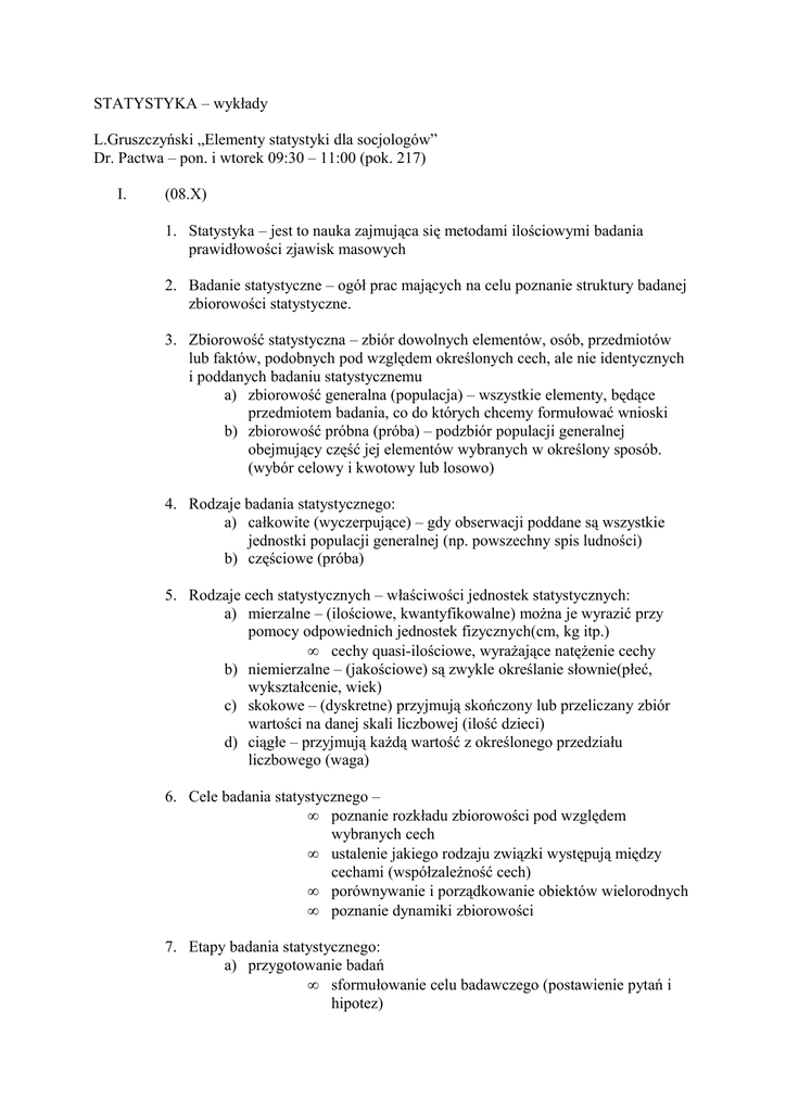 STATYSTYKA – wykłady L.Gruszczyński „Elementy statystyki dla socjologów” Dr. Pactwa – pon. i wtorek 09:30 – 11:00 (pok. 217) I. (08.X) 1. Statystyka – jest to nauka zajmująca się metodami ilościowymi badania prawidłowości zjawisk masowych 2. Badanie statystyczne – ogół prac mających na celu poznanie struktury badanej zbiorowości statystyczne. 3. Zbiorowość statystyczna – zbiór dowolnych elementów, osób, przedmiotów lub faktów, podobnych pod względem określonych cech, ale nie identycznych i poddanych badaniu statystycznemu a) zbiorowość generalna (populacja) – wszystkie elementy, będące przedmiotem badania, co do których chcemy formułować wnioski b) zbiorowość próbna (próba) – podzbiór populacji generalnej obejmujący część jej elementów wybranych w określony sposób. (wybór celowy i kwotowy lub losowo) 4. Rodzaje badania statystycznego: a) całkowite (wyczerpujące) – gdy obserwacji poddane są wszystkie jednostki populacji generalnej (np. powszechny spis ludności) b) częściowe (próba) 5. Rodzaje cech statystycznych – właściwości jednostek statystycznych: a) mierzalne – (ilościowe, kwantyfikowalne) można je wyrazić przy pomocy odpowiednich jednostek fizycznych(cm, kg itp.) • cechy quasi-ilościowe, wyrażające natężenie cechy b) niemierzalne – (jakościowe) są zwykle określanie słownie(płeć, wykształcenie, wiek) c) skokowe – (dyskretne) przyjmują skończony lub przeliczany zbiór wartości na danej skali liczbowej (ilość dzieci) d) ciągłe – przyjmują każdą wartość z określonego przedziału liczbowego (waga) 6. Cele badania statystycznego – • poznanie rozkładu zbiorowości pod względem wybranych cech • ustalenie jakiego rodzaju związki występują między cechami (współzależność cech) • porównywanie i porządkowanie obiektów wielorodnych • poznanie dynamiki zbiorowości 7. Etapy badania statystycznego: a) przygotowanie badań • sformułowanie celu badawczego (postawienie pytań i hipotez) • b) c) d) e) II. określenie rzeczowego, przestrzennego i czasowego zasięgu badań • rodzaje wykorzystywanego materiału badawczego i metod jego gromadzenia • określenie sposobu opracowania i prezentacji zebranego materiału • określenie metod analizy tego materiału • określenie reguł wnioskowania gromadzenie materiału badawczego – materiał pierwotny (pozyskany przez nas) lub wtórny (już istniejący) opracowanie i prezentacja zebranego materiału • podział uporządkowanego materiału według kryteriów na podstawie interesujących nas cech • zliczenie pogrupowanych danych • interpretacja zebranego materiału i pogrupowanie wartości (tabele lub wykresy) opis statystyczny (analiza badanej zbiorowości) – oblicznie miar czyli charakterystyk opisowych badanej zbiorowości (statystyka opisowa) wnioskowanie statystyczne – zastosowanie testów na podstawie których dokonuje się uogólnień do całe zbiorowości 15.X 1. Grupowanie statystyczne: a) grupowanie typologiczne – ma na celu wyróżnienie jednorodnych grup jakościowych b) grupowanie wariancyjne – ma na celu uporządkowanie badanej zbiorowości i poznanie jej struktury. Polega na łączeniu w klasy jednostek statystycznych o odpowiednich wartościach cech statystycznych 2. Szeregi statystyczne – występują przy użyciu grupowania wariancyjnego. Jest to ciąg wielkości statystycznych uporządkowanych według określonego kryterium. Rodzaje szeregów statystycznych: a) szereg szczegółowy – uporządkowanych ciąg wartości badanej cechy statystycznej, w wypadku małej ilości danych. Można go uporządkować malejąco lub rosnąco. b) szereg rozdzielczy – zbiorowość statystyczne podzielona na części (klasy) według określonej cechy mierzalnej jakościowej lub ilościowej, z podaniem liczebności dla każdej z wyodrębnionych klas (rozkład empiryczny) • szereg rozdzielczy I typu – każdy wariant cechy stanowi osobną klasę • szereg rozdzielczy II typu – występują przedziały „od/do”, które zawsze mają dolną granicę (xd) i górną. Różnica między dolną a górną granicą to rozpiętość przedziału (l). 3. Przedstawienie graficzne wyników a) histogram (wykres słupkowy)– zbiór prostokątów, których podstawy są wyznaczone na osi odciętych, stanowiąc rozpiętości poszczególnych przedziałów klasowych. Natomiast wysokości są określone na osi rzędnych, przez liczebności odpowiadające poszczególnym przedziałom klasowym b) wielobok liczebności – linia łamana powstała z połączenia punktów, których współrzędnymi są środki przedziałów klasowych (xi`), czyli średnia arytmetyczna (dolna granica +górna granica / 2) c) szereg skumulowany – szereg powstały z szeregu rozdzielczego przez kolejne dodawanie (kumulowanie) przedziałów klasowych oraz odpowiadających im wartości (ncum) 4. Opis struktury badanej grupy – opisujemy przy pomocy parametrów. Jednym z nich są miary tendencji centralnej: a) średnie klasyczne: • średnia arytmetyczne xi' xA = ∑ N • średnia harmoniczna • średnia geometryczna b) średnie pozycyjne (zajmują w szeregu szczególną pozycję) • dominanta – wartość tej zmiennej, która w szeregu statystycznym występuje najczęściej D= xd + l n 0 − nn − 1 ( n0 − nn − 1) + ( n0 − nn + 1) xd = dolna granica przedziału najliczniejszego l = rozpiętość przedziału najliczniejszego n0 = liczebność najliczniejszego przedziału nn-1 = liczebność przedziału poprzedzającego najliczniejszy nn+1 = liczebność przedziału po najliczniejszym • kwartyle Q1 – wartość szeregu dzieląca zbiorowość na dwie części tak, że 1\4 ≤ Q1 ≥ 3\4 N − ncum − 1 Q1 = xd + l 4 NQ 1 Q3 - wartość szeregu dzieląca zbiorowość na dwie części tak, że 3\4 ≤ Q1 ≥ 1\4 3N − ncum − 1 Q 3 = xd + l 4 NQ 3 • mediana – wartość środkowa, która dzieli szereg na dwie równe liczebni
