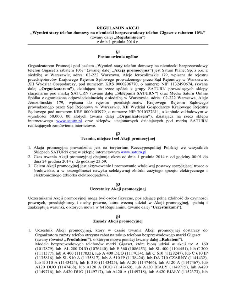 REGULAMIN AKCJI „Wymień stary telefon domowy na niemiecki bezprzewodowy telefon Gigaset z rabatem 10%” (zwany dalej „Regulaminem”) z dnia 1 grudnia 2014 r. §1 Postanowienia ogólne Organizatorem Promocji pod hasłem „Wymień stary telefon domowy na niemiecki bezprzewodowy telefon Gigaset z rabatem 10%” (zwanej dalej „Akcją promocyjną”) jest Saturn Planet Sp. z o.o. z siedzibą w Warszawie, adres: 02-222 Warszawa, Aleje Jerozolimskie 179, wpisana do rejestru przedsiębiorców Krajowego Rejestru Sądowego prowadzonego przez Sąd Rejonowy w Warszawie, XII Wydział Gospodarczy, pod numerem KRS 0000206770, o numerze NIP 1132490674, (zwana dalej „Organizatorem”), działająca na rzecz spółek z grupy SATURN prowadzących sklepy stacjonarne pod marką SATURN (zwane dalej „Sklepami SATURN”) oraz Media Saturn Online Spółka z ograniczoną odpowiedzialnością z siedzibą w Warszawie, adres: 02-222 Warszawa, Aleje Jerozolimskie 179, wpisana do rejestru przedsiębiorców Krajowego Rejestru Sądowego prowadzonego przez Sąd Rejonowy w Warszawie, XII Wydział Gospodarczy Krajowego Rejestru Sądowego pod numerem KRS 0000403979, o numerze NIP 7010327611, o kapitale zakładowym w wysokości 50.000, 00 złotych (zwana dalej „Organizatorem”), działająca na rzecz sklepu internetowego www.saturn.pl oraz sklepów stacjonarnych działających pod marką SATURN realizujących zamówienia internetowe. §2 Termin, miejsce i cel Akcji promocyjnej 1. Akcja promocyjna prowadzona jest na terytorium Rzeczypospolitej Polskiej we wszystkich Sklepach SATURN oraz w sklepie internetowym www.saturn.pl 2. Czas trwania Akcji promocyjnej obejmuje okres od dnia 1 grudnia 2014 r. od godziny 00:01 do dnia 24 grudnia 2014 r. do godziny 23:59. 3. Celem Akcji promocyjnej jest aktywowanie i promowanie właściwej postawy sprzyjającej trosce o środowisko, a w szczególności nawyku selektywnej zbiórki zużytego sprzętu elektrycznego i elektronicznego (zbiórka elektroodpadów). §3 Uczestnicy Akcji promocyjnej Uczestnikami Akcji promocyjnej mogą być osoby fizyczne, posiadające pełną zdolność do czynności prawnych, przedsiębiorcy i osoby prawne, które wezmą udział w Akcji promocyjnej, spełnią i zaakceptują warunki, o których mowa w §4 Regulaminu (zwane dalej "Uczestnikami"). §4 Zasady Akcji promocyjnej 1. Uczestnik Akcji promocyjnej, który w czasie trwania Akcji promocyjnej dostarczy do Organizatora zużyty telefon otrzyma rabat na zakup telefonu bezprzewodowego marki Gigaset (zwany również „Produktem”), o którym mowa poniżej (zwany dalej „Rabatem”). Modele bezprzewodowych telefonów marki Gigaset, które biorą udział w akcji to: A 160 (1017879), lub AL 280 DUO (1076440), lub E 360 (1086453), lub SL 400 (1104451), lub C 300 (1111377), lub A 400 (1117033), lub A 400 DUO (1117034), lub C 610 (1128247), lub C 610 IP (1135816), lub SL 910 A (1135817), lub A 510 IP (1138424), lub DA 710 CZARNY (1141432), lub E 310 A (1143424), lub E 310 (1143425), lub A120 (1147466), lub A120 A (1147467), lub A120 DUO (1147468), lub A120 A DUO (1147469), lub A120 BIAŁY (1149715), lub A420 (1149716), lub A420 DUO (1149717), lub A420 A (1149718), lub A420 BIAŁY (1152373), lub 2. 3. 4. 5. 6. 7. 8. 9. 10. 11. 12. 13. 14. S820 (1157813), lub C 530 (1206681), lub C 530 A (1206682), lub A 415 (1206683), lub A 415 DUO (1206684), lub REPEATER (5030074). Warunkiem otrzymania Rabatu na zakup telefonu bezprzewodowego marki Gigaset A 160 (1017879), lub AL 280 DUO (1076440), lub E 360 (1086453), lub SL 400 (1104451), lub C 300 (1111377), lub A 400 (1117033), lub A 400 DUO (1117034), lub C 610 (1128247), lub C 610 IP (1135816), lub SL 910 A (1135817), lub A 510 IP (1138424), lub DA 710 CZARNY (1141432), lub E 310 A (1143424), lub E 310 (1143425), lub A120 (1147466), lub A120 A (1147467), lub A120 DUO (1147468), lub A120 A DUO (1147469), lub A120 BIAŁY (1149715), lub A420 (1149716), lub A420 DUO (1149717), lub A420 A (1149718), lub A420 BIAŁY (1152373), lub S820 (1157813), lub C 530 (1206681), lub C 530 A (1206682), lub A 415 (1206683), lub A 415 DUO (1206684), lub REPEATER (5030074) jest dostarczenie przez Uczestnika Akcji promocyjnej do dowolnego Sklepu SATURN zużytego dowolnego telefonu domowego w dowolnej ilości. W przypadku zakupów w sklepie internetowym www.saturn.pl Organizator Akcji dopuszcza możliwość, aby Uczestnik dostarczył zużyty sprzęt elektroniczny w terminie dwunastu (12) miesięcy po otrzymaniu Rabatu. Sposób dostarczenia jest dowolny (np. przesyłka, dostarczenie osobiste, przesyłka kurierska). Uczestnik może oddać zużyty sprzęt elektroniczny dowolnej firmy o dowolnej wartości. Rabat, o którym mowa w ust. 1, wynosi 10% ceny brutto Produktu objętego promocją i będzie naliczany jednorazowo. Rabat nie może być dzielony. Rabat przyznawany jest za jedną (1) sztukę używanego sprzętu elektronicznego. W przypadku, gdy Uczestnik Akcji promocyjnej dostarczy więcej sztuk sprzętu elektronicznego, otrzyma odpowiednią ilość Rabatów, z zastrzeżeniem ust. 5. Rabaty, o których mowa w ust. 5, nie mogą być łączone. Rabat na jedną (1) sztukę Produktu nie może przekroczyć 10% zgodnie z postanowieniami ust. 5. Rabat jest jednorazowy tzn. że nie może być wykorzystywany wielokrotnie. Rabat przysługuje wyłącznie w czasie trwania Akcji promocyjnej. Rabat nie może być przyznany na zakup produktów po zakończeniu Akcji promocyjnej. W przypadku zakupów w sklepach stacjonarnych Saturn Uczestnik może wziąć udział w Akcji promocyjnej wielokrotnie, pod warunkiem każdorazowego spełnienia warunków przewidzianych w Regulaminie. W przypadku zakupów w sklepie internetowym www.saturn.pl Uczestnik może wziąć udział w Akcji promocyjnej tylko jeden (1) raz, tzn. że może dokonać zakupu jednego rodzaju towaru promocyjnego z wykorzystaniem Rabatu tylko jeden (1) raz. Uczestnik Akcji promocyjnej dostarczając do Organizatora zużyty sprzęt elektroniczny wyz