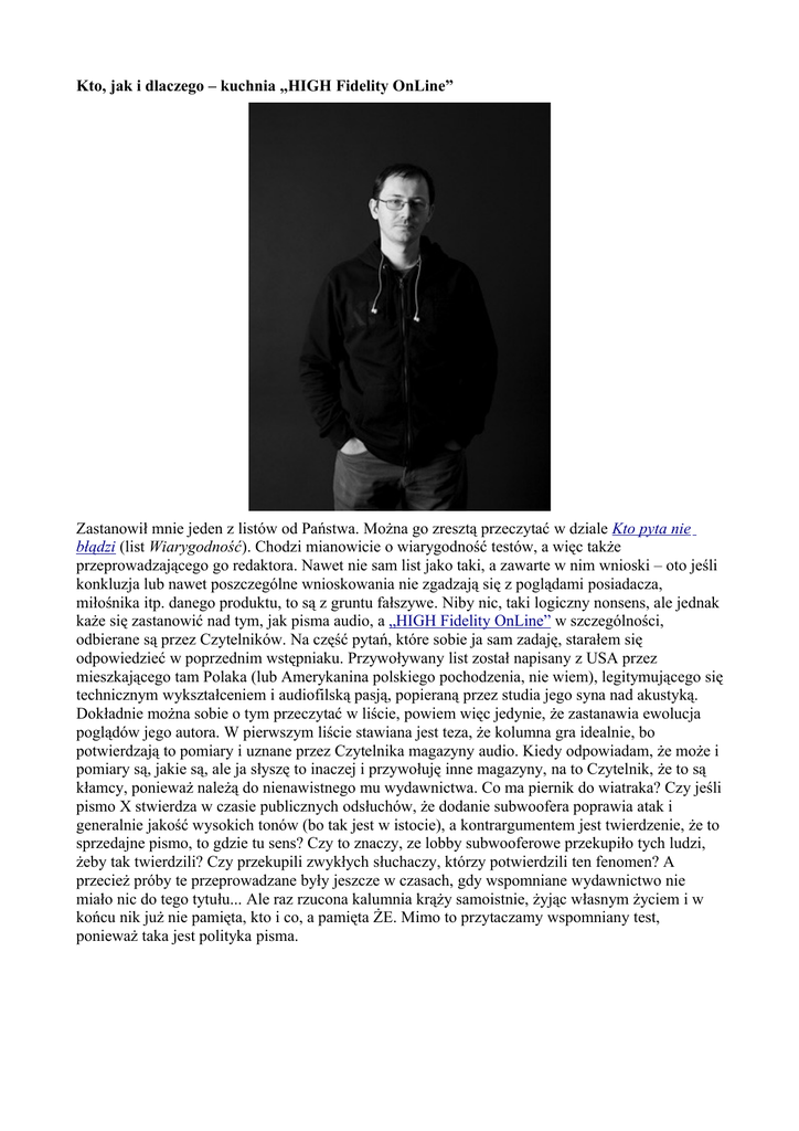 Kto, jak i dlaczego – kuchnia „HIGH Fidelity OnLine” Zastanowił mnie jeden z listów od Państwa. Można go zresztą przeczytać w dziale Kto pyta nie błądzi (list Wiarygodność). Chodzi mianowicie o wiarygodność testów, a więc także przeprowadzającego go redaktora. Nawet nie sam list jako taki, a zawarte w nim wnioski – oto jeśli konkluzja lub nawet poszczególne wnioskowania nie zgadzają się z poglądami posiadacza, miłośnika itp. danego produktu, to są z gruntu fałszywe. Niby nic, taki logiczny nonsens, ale jednak każe się zastanowić nad tym, jak pisma audio, a „HIGH Fidelity OnLine” w szczególności, odbierane są przez Czytelników. Na część pytań, które sobie ja sam zadaję, starałem się odpowiedzieć w poprzednim wstępniaku. Przywoływany list został napisany z USA przez mieszkającego tam Polaka (lub Amerykanina polskiego pochodzenia, nie wiem), legitymującego się technicznym wykształceniem i audiofilską pasją, popieraną przez studia jego syna nad akustyką. Dokładnie można sobie o tym przeczytać w liście, powiem więc jedynie, że zastanawia ewolucja poglądów jego autora. W pierwszym liście stawiana jest teza, że kolumna gra idealnie, bo potwierdzają to pomiary i uznane przez Czytelnika magazyny audio. Kiedy odpowiadam, że może i pomiary są, jakie są, ale ja słyszę to inaczej i przywołuję inne magazyny, na to Czytelnik, że to są kłamcy, ponieważ należą do nienawistnego mu wydawnictwa. Co ma piernik do wiatraka? Czy jeśli pismo X stwierdza w czasie publicznych odsłuchów, że dodanie subwoofera poprawia atak i generalnie jakość wysokich tonów (bo tak jest w istocie), a kontrargumentem jest twierdzenie, że to sprzedajne pismo, to gdzie tu sens? Czy to znaczy, ze lobby subwooferowe przekupiło tych ludzi, żeby tak twierdzili? Czy przekupili zwykłych słuchaczy, którzy potwierdzili ten fenomen? A przecież próby te przeprowadzane były jeszcze w czasach, gdy wspomniane wydawnictwo nie miało nic do tego tytułu... Ale raz rzucona kalumnia krąży samoistnie, żyjąc własnym życiem i w końcu nik już nie pamięta, kto i co, a pamięta ŻE. Mimo to przytaczamy wspomniany test, ponieważ taka jest polityka pisma. Prawdę mówiąc dzięki nabytej gruboskórności nie dotyka mnie to bezpośrednio, jednak będąc częścią świata audiofilskiego, przede wszystkim prasy, nieco martwi. A jeśli to wszystko, czym się zajmujemy ma mieć sens, musimy się wyzbyć dogmatyzmów – nie swojego zdania, bo to jest jedna z cenniejszych rzeczy, ale świętego zapału krzyżowców, którzy w zapamiętaniu, święcie wierząc w to, że ich krucjata jest namaszczona przez samego Boga, sieką na lewo i prawo, aż wszyscy w zasięgu wzroku nie będą podzielali ich poglądów lub nie polegną. Pewnym impulsem do tej przemowy była także luźna uwaga rzucona przez pana Marcina Zawodnika, który wylosował nagrodę w tegorocznym konkursie Okładka Roku 2007. Wychodząc obładowany z gościnnego Chillout Studio, rzucił, że chciałby wziąć udział także w przyszłorocznym konkursie (sam bym chciał!), i że byłyby „zmiany”, gdyby wygrał. Więc nie weźmie. A ja, muszę to powiedzieć, mam to gdzieś, kto i co sobie pomyśli! Jeśliby został wylosowany, to tak by było i koniec. Każdy miał możliwość być przy losowaniu i je śledzić. Co by jednak nie mówić, pokazuje to, że łatwiej nie wierzyć nikomu, niż komuś zaufać. Chciałbym więc po raz kolejny przybliżyć filozofię dźwięku i testów, którymi się kieruję, ponieważ łatwiej będzie wówczas zrozumieć same testy. Jeśli są Państwo z tym na bieżąco, to przepraszam za powtarzanie się. Bo przecież test nie jest kompletnym, zamkniętym przekazem, a funkcjonuje w jakiejś przestrzeni komunikacyjnej. Jest jego autor, preferencje testującego, warunki, w których test był przeprowadzany, sposób dobierania urządzeń do testu (tzw. polityka pisma) czy wreszcie urządzenia towarzyszące (referencyjne, czy też odniesienia). I oczywiście Czytelnik. Najpierw wybór urządzeń – nie jestem pobłażliwy, nie tępię ostrza krytyki, ani nic w tym kierunku. Zawsze, gdzie to tylko możliwe, staram się pokazać także słabsze strony urządzenia, nawet jego wady. W pierwszym momencie może się wydawać, że rzeczywiście coś jest na rzeczy, ponieważ trudno na stronach HFOL znaleźć test słabego produktu. I tak ma być! Słabych rzeczy po prostu nie testuję. Odsyłam bez testu. A przecież najpierw dokonuję wstępnej selekcji, tj. oglądam, czytam, zasięgam opinii, porady itp. i dopiero po takim wstępie rozmawiam z dystrybutorem. Taki sposób prowadzenia pisma przyzwyczaił firmy do prowadzenia wewnętrznej cenzury i wcale nie zawsze dostaję to, co bym chciał. Można nawet powiedzieć, że 40 % to, bardziej lub mniej zakamuflowane, odmowy. Ja ze swojej strony mogę zapewnić, że jeśli test dojdzie do skutku, będzie przeprowadzony rzetelnie i niczego nie dodam, ani też nie ujmę. Powtórzę – nie mam ani czasu, ani chęci testowania rzeczy, które moim zdaniem nie są zbyt dobre, które mi się po prostu nie podobają. Druga sprawa wiąże się z pierwszą, a mianowicie chodzi o warunki testu i sprzęt odniesienia. Kiedy słucham jakiegoś produktu, który powinien być dobry, bo albo wskazuje na to budowa, moje doświadczenia z innymi rzeczami danego producenta, opinie znajomych i przyjaciół, pochlebne testy w prasie zagranicznej, która jest dla mnie wiarygodna, sława marki itp., zakładam, że jest duże prawdopodobieństwo, że nie zapewniłem danemu produktowi wystarczająco godziwych warunków, że coś przegapiłem lub że nie potrafię znaleźć odpowiedniej kombinacji urządzeń towarzyszących. W takim przypadku, jeśli to tylko drobne uchybienia, staram się postawić w tekście sprawę jasno, ale zadaję też więcej pytań, staram się wskazać na więcej możliwości i liczyć na to, że wykonałem za Państwa