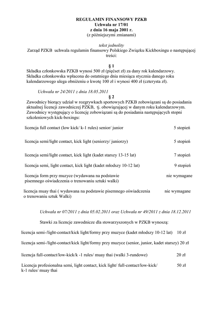 REGULAMIN FINANSOWY PZKB Uchwała nr 17/01 z dnia 16 maja 2001 r. (z późniejszymi zmianami) tekst jednolity Zarząd PZKB uchwala regulamin finansowy Polskiego Związku Kickboxingu o następującej treści: §1 Składka członkowska PZKB wynosi 500 zł (pięćset zł) za dany rok kalendarzowy. Składka członkowska wpłacona do ostatniego dnia miesiąca stycznia danego roku kalendarzowego ulega obniżeniu o kwotę 100 zł i wynosi 400 zł (czterysta zł). Uchwała nr 24/2011 z dnia 18.05.2011 §2 Zawodnicy biorący udział w rozgrywkach sportowych PZKB zobowiązani są do posiadania aktualnej licencji zawodniczej PZKB, tj. obowiązującej w danym roku kalendarzowym. Zawodnicy występujący o licencję zobowiązani są do posiadania następujących stopni szkoleniowych kick-boxingu: licencja full contact (low kick/ k-1 rules) senior/ junior 5 stopień licencja semi/light contact, kick light (seniorzy/ juniorzy) 5 stopień licencja semi/light contact, kick light (kadet starszy 13-15 lat) 7 stopień licencja semi, light contact, kick light (kadet młodszy 10-12 lat) 9 stopień licencja form przy muzyce (wydawana na podstawie pisemnego oświadczenia o trenowaniu sztuki walki) licencja muay thai ( wydawana na podstawie pisemnego oświadczenia o trenowaniu sztuk Walki) nie wymagane nie wymagane Uchwała nr 07/2011 z dnia 05.02.2011 oraz Uchwała nr 49/2011 z dnia 18.12.2011 Stawki za licencje zawodnicze dla stowarzyszonych w PZKB wynoszą: licencja semi-/light-contact/kick light/formy przy muzyce (kadet młodszy 10-12 lat) 10 zł licencja semi-/light-contact/kick light/formy przy muzyce (senior, junior, kadet starszy) 20 zł licencja full-contact/low-kick/k -1 rules/ muay thai (walki 3-rundowe) 20 zł Licencja profesionalna semi, light contact, kick light/ full-contact/low-kick/ k-1 rules/ muay thai 50 zł Uchwała nr 08/2012 z dnia 21.01.2012 W Mistrzostwach Polski w poszczególnych formułach Kickboxingu mogą startować tylko zawodnicy z klubów stowarzyszonych z PZKB (klub musi posiadać aktualnie wykupioną licencję). Zawodnicy niezrzeszeni mogą startować wyłącznie w zawodach rangi Puchar Polski, Gala, Turniej itp. Stawki za licencje zawodnicze dla niestowarzyszonych w PZKB wynoszą: licencja jednorazowa zawodnika na turniejach eliminacyjnych PZKB licencja jednorazowa zawodnika na Pucharach Polski 20 zł 50 zł Uchwała nr 06/2009 z dnia 22.01.2009 §3 Trenerzy – instruktorzy w klubach sportowych zobowiązani są do posiadania aktualnej licencji trenerskiej. Stawka licencji trenera PZKB wynosi 20 zł (dwadzieścia zł) za dany rok kalendarzowy. Trener/instruktor zobowiązany jest do wykupienia licencji na początku danego roku kalendarzowego. §4 Sędziowie powoływani do pracy na turniejach zobowiązani są do posiadania aktualnej licencji sędziowskiej. Opłata licencji za dany rok kalendarzowy powinna być uregulowana przed sędziowaniem pierwszych zawodów i wynosi: licencja A 70 zł licencja B 60 zł licencja C 50 zł licencja D 40 zł §5 Organizator zawodów w kick-boxingu zobowiązany jest do wypłaty ryczałtów sędziowskich oraz zwrotu kosztów przejazdu i pobytu sędziów według poniższych zasad: a) Wynagrodzenie sędziowskie za jeden dzień trwania zawodów ( liczy się od rozpoczęcia pierwszej walki do końca ostatniej walki, zaś podana suma jest kwotą NETTO) i wynosi odpowiednio: KLASA SĘDZIOWSKA Strefy Normalna stawka Sędzia główny A Sędzia A Sędzia B Sędzia Sędzia D C 100 80 60 50 30 MP, PP- S/C, L/C, Kick Light Rules formy przy muzyce, aero kickboxing, międzynarodowe. ( Turnieje, mecze, walki pokazowe, sparingowe ) MP, PP, ligi, full contact ,K-1, low kick, muay thai, Międzynarodowe, (Turnieje, mecze ,walki pokazowe, sparingowe ) KLASA SĘDZIOWSKA Sędzia Gł. A Kierownik planszy A Sędzia A Sędzia B Sędzia C Sędzia D Normalna stawka Po przekroczeniu 8 godzin KLASA SĘDZIOWSKA Normalna stawka Po przekroczeniu 8 godzin 140 160 160 200 120 140 140 170 100 120 120 150 80 100 100 130 70 90 90 120 40 60 Sędzia Gł. A Kierownik ringu A Sędzia A Sędzia B Sędzia C Sędzia D 60 80 SĘDZIA WAGOWY : 40 zł - Po przekroczeniu 8 godz. trwania zawodów stawka wzrasta do wyżej podanej sumy. - Przy zawodach toczonych na jednej planszy ( ringu ) musi być obecnych podczas ważenia dwóch sędziów wagowych. - Przy zawodach toczonych na dwóch planszach ( ringach ) musi być obecnych podczas ważenia co najmniej trzech sędziów wagowych. b) Diety niezależnie od wynagrodzeń sędziowskich ustalanych Uchwałą Zarządu PZKB organizator zawodów obowiązany jest do wypłaty sędziom i delegatom: 1. Należności z tytułu diet obliczanych za czas od rozpoczęcia podróży (wyjazdu) do powrotu (przyjazdu) po wykonaniu zadania. 2. Jeżeli podróż służbowa trwa nie dłużej niż dobę i wynosi: a. od 8 do 12 godz. - przysługuje połowa diety, b. ponad 12 godz. - przysługuje pełna dieta, 3. Jeżeli podróż służbowa trwa dłużej niż dobę za każdą dobę przysługuje dieta w pełnej wysokości, a za niepełną ale rozpoczętą dobę: do 8 godz. - połowa diety, ponad 8 godz. - pełna dieta, Wysokość diety regulują przepisy powszechne. Dieta nie przysługuje jeżeli sędziemu, delegatowi zapewniono bezpłatne całodzienne wyżywienie ( trzy posiłki dziennie ). c) Koszty podróży a. 1. Należności z tytułu poniesionych kosztów przejazdu według następujących zasad obejmujących cenę określonego środka transportu: a. do 50 km - pociąg osobowy, b. do 100 km - pociąg pośpieszny II klasa, c. powyżej 100 km - I kl. pociąg pośpieszny, II kl. expresowy lub inter city, d. autobus PKS tam gdzie nie ma połączeń PKP. 2. W podróżach trwających dłużej niż 6 godzin nocą sędzia, delegat może korzystać z kuszetki lub miejsca sypialnego. Powyższy fakt musi udokumentować biletem na kuszetkę (sypialny). 3. W podróżach pociągiem z miejscami rezerwowanymi sędzia, delegat musi okazać miejscówkę. 4. Podróż powrotną rozlicza się w wy