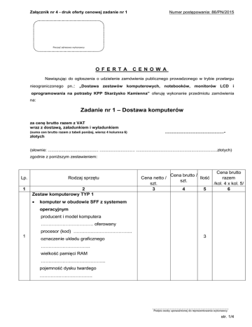 Załącznik nr 4 - druk oferty cenowej zadanie nr 1 Numer postępowania: 86/PN/2015 miejscowość Pieczęć adresowa wykonawcy O F E R T A C E N O W A Nawiązując do ogłoszenia o udzielenie zamówienia publicznego prowadzonego w trybie przetargu nieograniczonego pn.: „Dostawa zestawów komputerowych, notebooków, monitorów LCD i oprogramowania na potrzeby KPP Skarżysko Kamienna” oferuję wykonanie przedmiotu zamówienia na: Zadanie nr 1 – Dostawa komputerów za cenę brutto razem z VAT wraz z dostawą, załadunkiem i wyładunkiem (suma cen brutto razem z tabeli poniżej, wiersz 4 kolumna 6) ..................................................- złotych (słownie: ........................................... .............................. .....................................................................złotych) zgodnie z poniższym zestawieniem: Lp. 1 Rodzaj sprzętu 2 Zestaw komputerowy TYP 1 • Cena netto / szt. 3 Cena brutto / Ilość szt. 4 5 Cena brutto razem /kol. 4 x kol. 5/ 6 komputer w obudowie SFF z systemem operacyjnym producent i model komputera ……………………………. oferowany procesor (kod) ……………………………….. 1 oznaczenie układu graficznego 3 ………………………….. wielkość pamięci RAM …………………………………... pojemność dysku twardego ……………………………. ................................................................. Podpis osoby upoważnionej do reprezentowania wykonawcy str. 1/4 Załącznik nr 4 - druk oferty cenowej zadanie nr 1 Lp. Rodzaj sprzętu 1 2 Numer postępowania: 86/PN/2015 Cena netto / szt. 3 Cena brutto / Ilość szt. 4 5 Cena brutto razem /kol. 4 x kol. 5/ 6 system operacyjny ……………………………………….. • monitor LCD min. 23” producent i model monitora ……………………………. Zestaw komputerowy TYP 2 • komputer w obudowie SFF z systemem operacyjnym producent i model komputera ……………………………. oferowany procesor (kod) ……………………………….. oznaczenie układu graficznego ………………………….. wielkość pamięci RAM …………………………………... 2 23 pojemność dysku twardego ……………………………. system operacyjny ……………………………………….. • monitor LCD min. 23” producent i model monitora ……………………………. • pakiet biurowy …………………………………………….. Zestaw komputerowy TYP 3 • komputer w obudowie SFF z systemem operacyjnym 3 producent i model komputera 7 ……………………………. oferowany procesor (kod) ……………………………….. oznaczenie układu graficznego ................................................................. Podpis osoby upoważnionej do reprezentowania wykonawcy str. 2/4 Załącznik nr 4 - druk oferty cenowej zadanie nr 1 Lp. Rodzaj sprzętu 1 Numer postępowania: 86/PN/2015 Cena netto / szt. 3 2 ………………………….. Cena brutto / Ilość szt. 4 5 Cena brutto razem /kol. 4 x kol. 5/ 6 wielkość pamięci RAM …………………………………... pojemność dysku twardego ……………………………. system operacyjny ……………………………………….. • monitor LCD min. 23” – 2 szt. producent i model monitora ……………………………. • pakiet biurowy …………………………………………….. Cena brutto razem 4 1. Dane teleadresowe wykonawcy: - Pełna nazwa wykonawcy: ….................................................................................. ……................................................................................ - Adres wykonawcy: ….............................................................................. ……........................................................................... - Nr telefonu wykonawcy: .................................................................................. - Nr faksu wykonawcy ................................................................................. - adres poczty e-mail: ................................................................................ - Imię i nazwisko osoby/osób upoważnionej do reprezentacji wykonawcy: ............................................................................ Uwaga! Proszę podać czytelny adres e-mail, nr faksu, na który wykonawca będzie otrzymywał od zamawiającego wszystkie informacje związane z prowadzonym postępowaniem po otwarciu ofert. W związku z przysługującymi środkami ochrony prawnej wykonawcy, liczonymi od dnia przekazania informacji należy upewnić się, że podany adres e-mail i podany nr faksu funkcjonuje prawidłowo. 2. Informacja, czy wybór oferty będzie prowadzić do powstania u Zamawiającego obowiązku podatkowego, zgodnie z przepisami o podatku od towaru i usług, wskazując nazwę (rodzaj) towaru lub usługi, których dostawa lub świadczenie prowadzić będzie do jego powstania, oraz wskazując ich wartość bez kwoty podatku (powyższy zapis prawa obowiązuje od dnia 1 lipca 2015 r. na mocy ustawy z dnia 9 kwietnia 2015 r. o zmianie ustawy o podatku od towaru i usług oraz ustawy – Prawo zamówień publicznych - Dz. U. z 4 maja 2015 r. poz.605) oświadczam: ................................................................. Podpis osoby upoważnionej do reprezentowania wykonawcy str. 3/4 Załącznik nr 4 - druk oferty cenowej zadanie nr 1 Numer postępowania: 86/PN/2015 1) Wybór mojej/naszej oferty będzie prowadził do powstania u zamawiającego obowiązku podatkowego zgodnie z przepisami o podatku od towarów i usług, wobec tego wskazuję nazwę (rodzaj) towaru lub usług, których dostawa lub świadczenie będzie prowadzić do powstania takiego obowiązku podatkowego tj.…………………………………………………………………………………….…..(uzupełnić) ,oraz wskazuję wartość tego towaru lub us